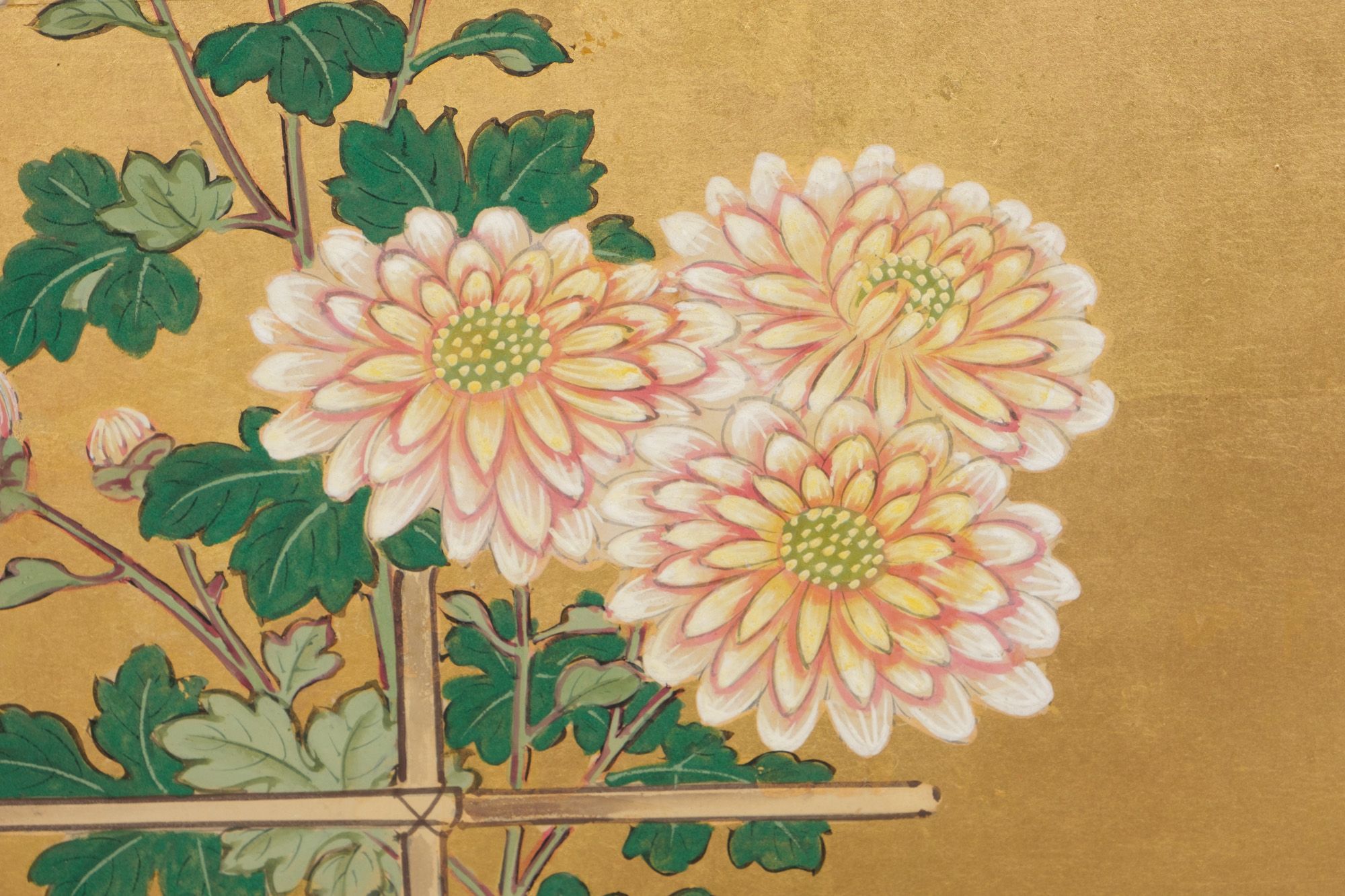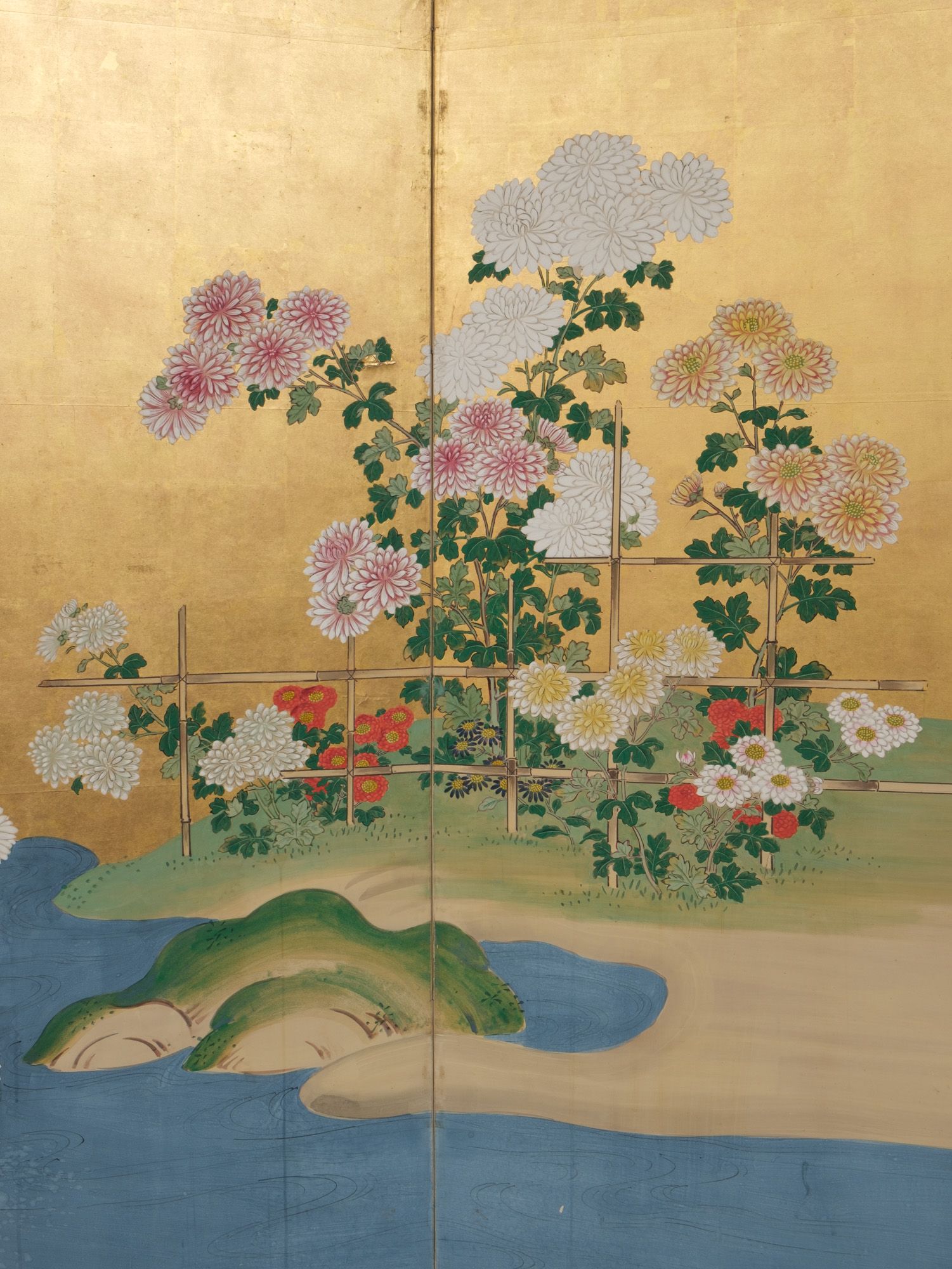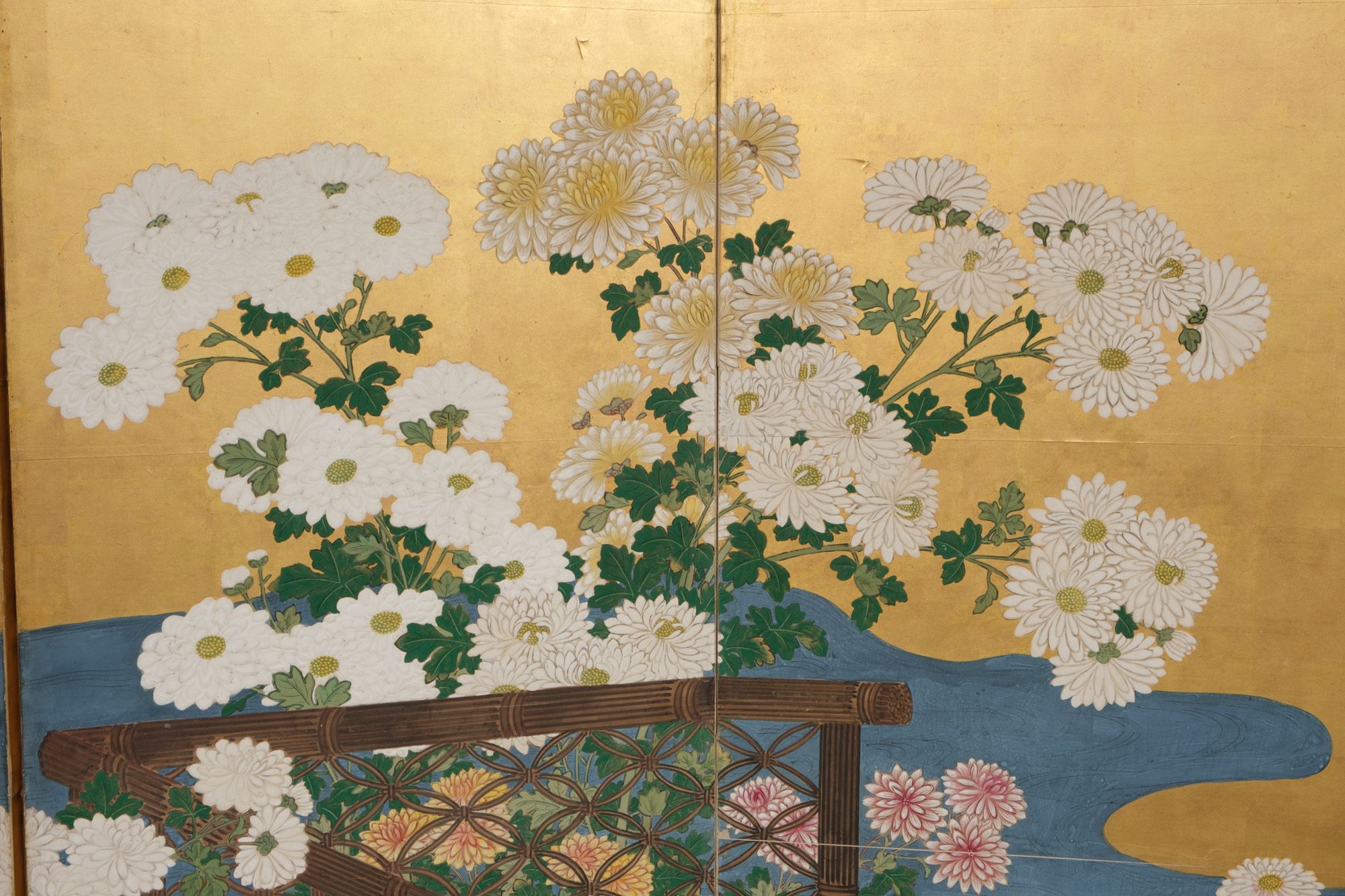 This multi-coloured painting is set on a shiny gold-leaf background, and the chrysanthemum flowers are painted by using shell paste 胡粉 (gofun) in low relief.