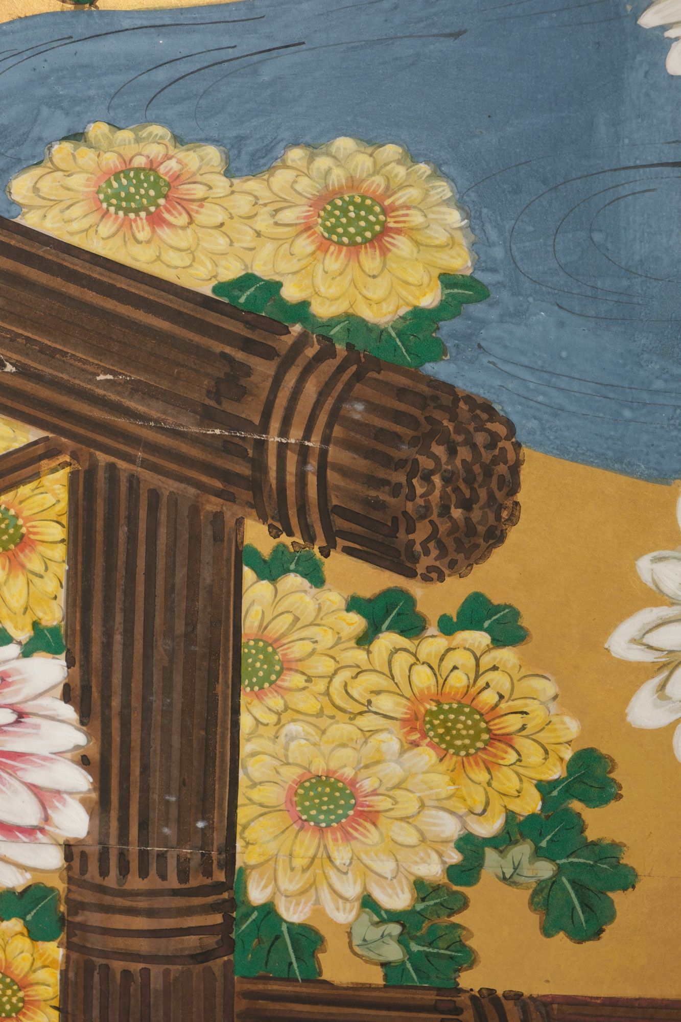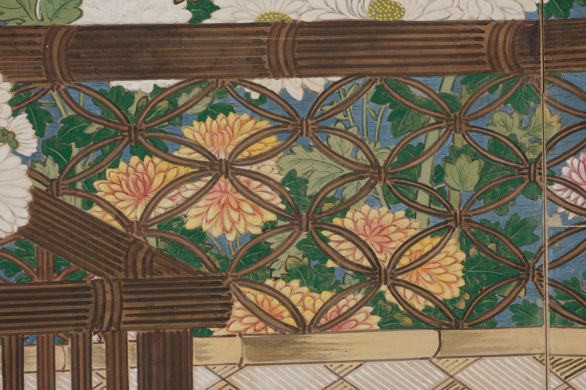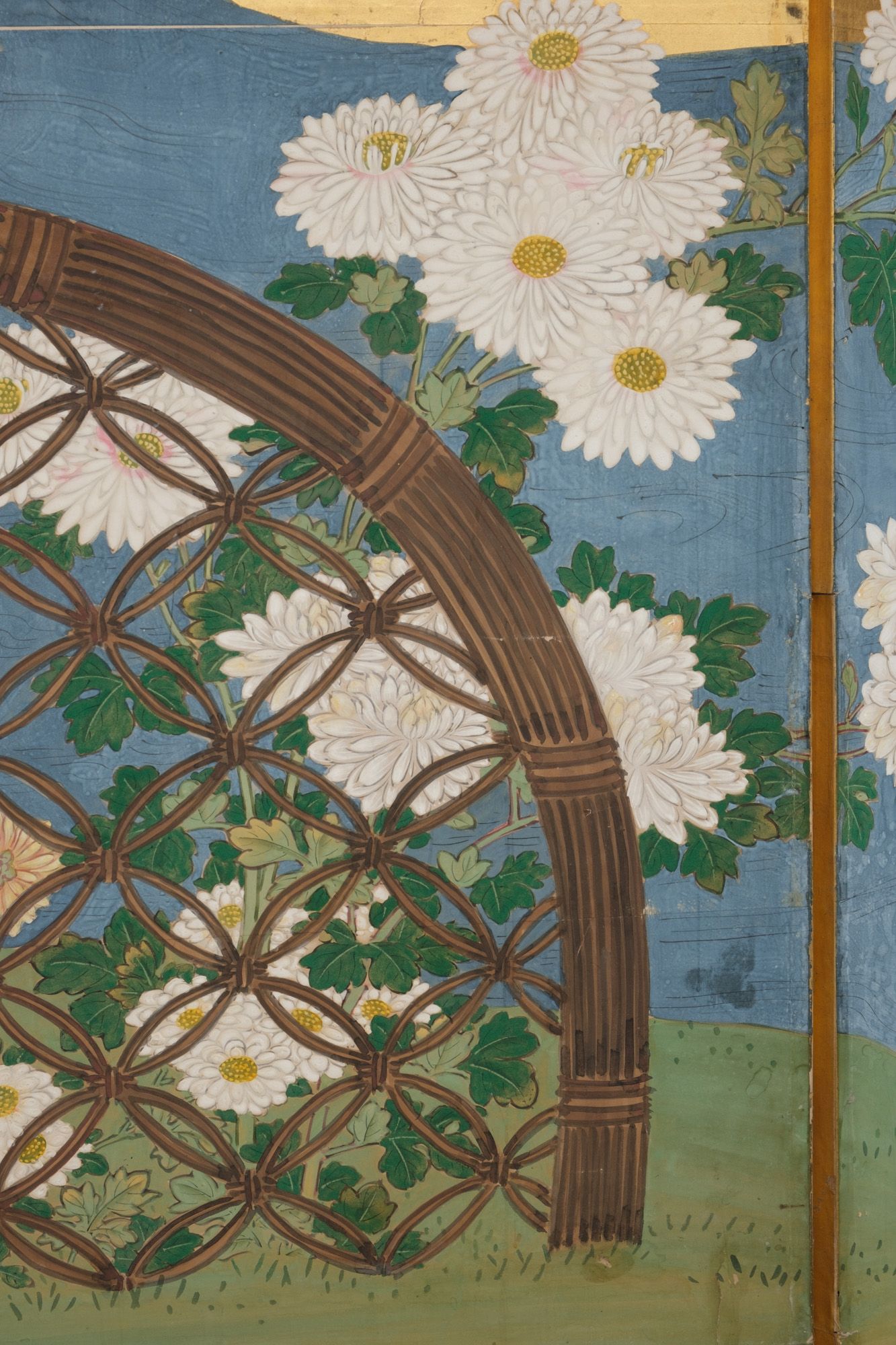 This multi-coloured painting is set on a shiny gold-leaf background, and the chrysanthemum flowers are painted by using shell paste 胡粉 (gofun) in low relief.