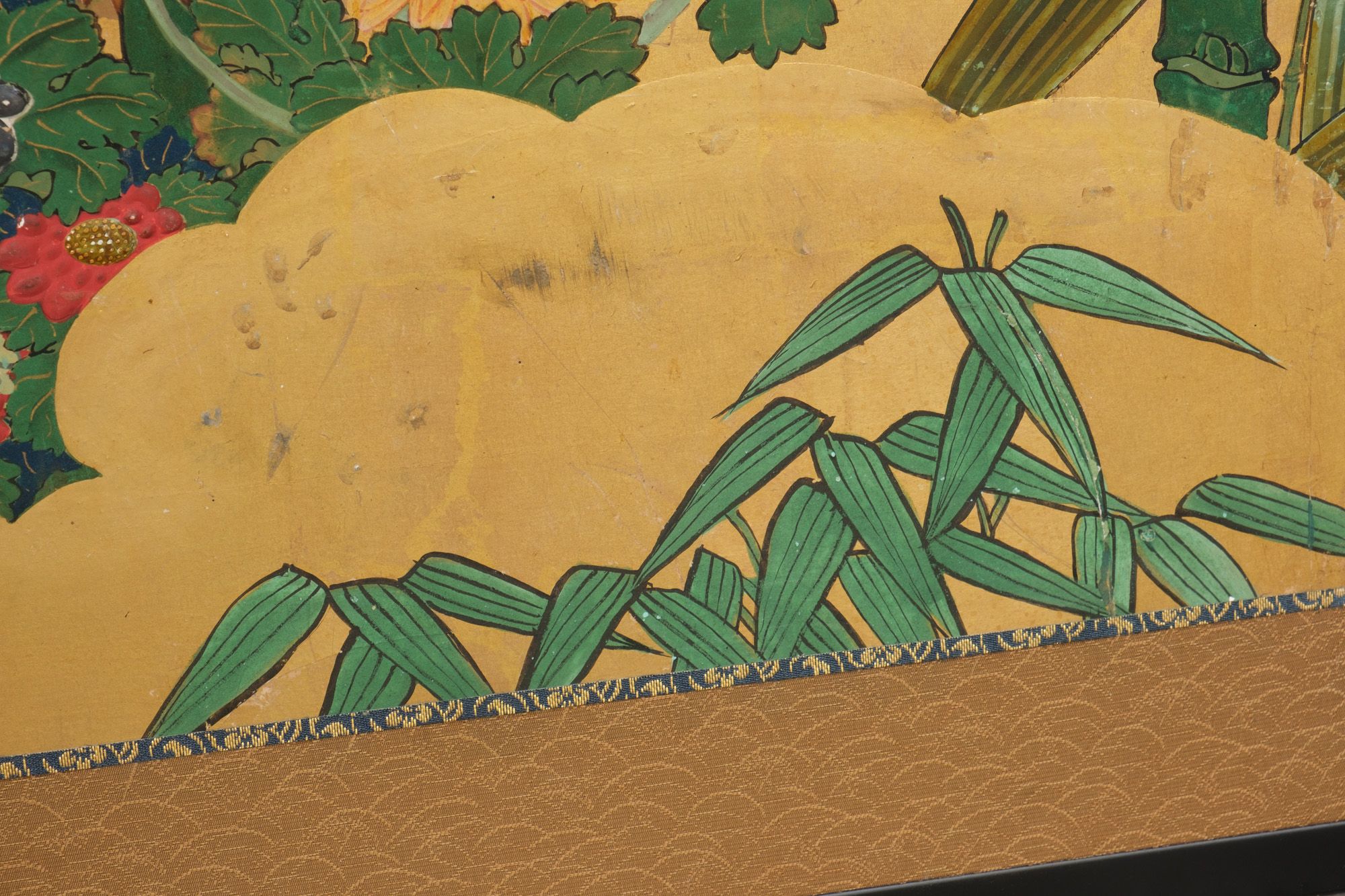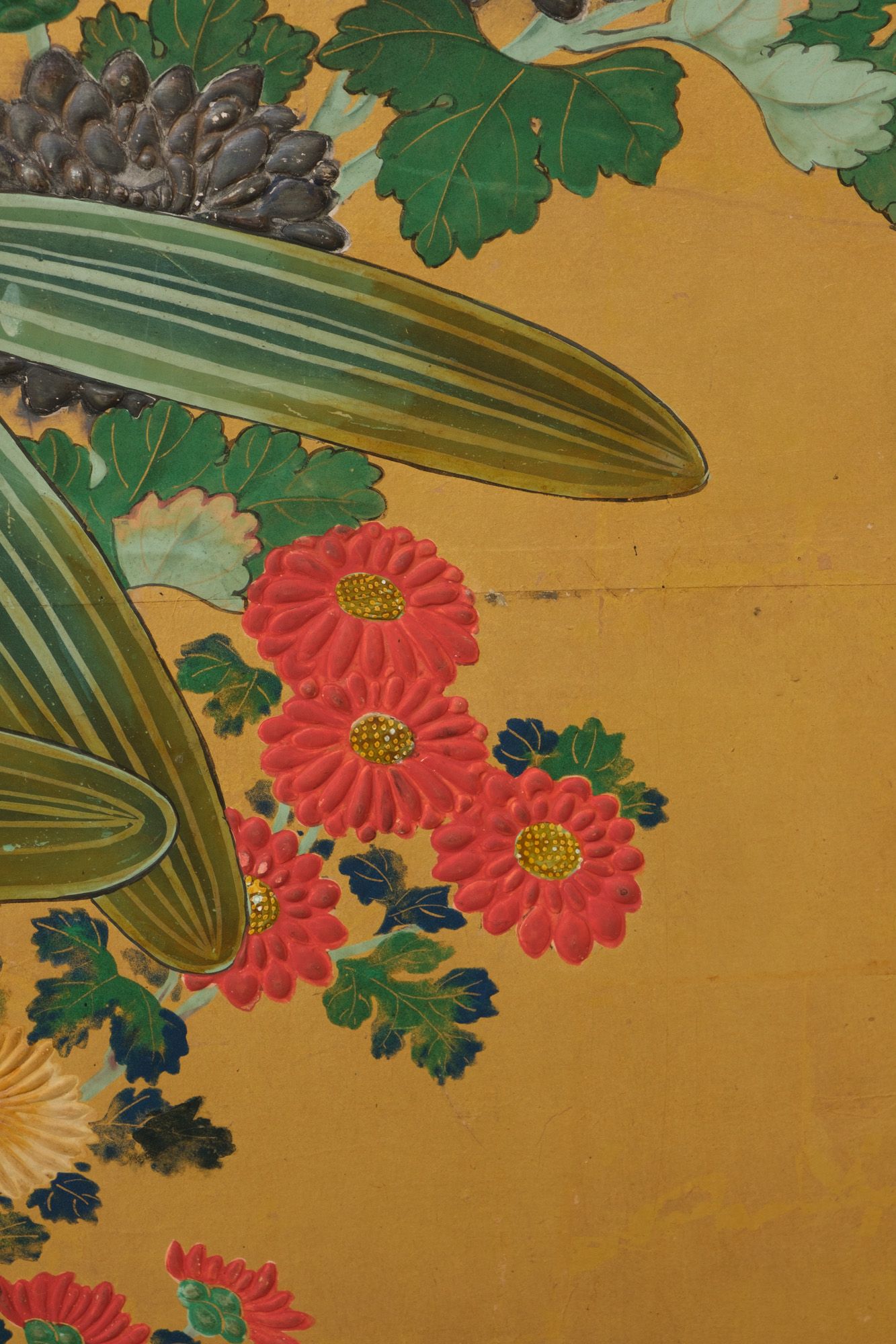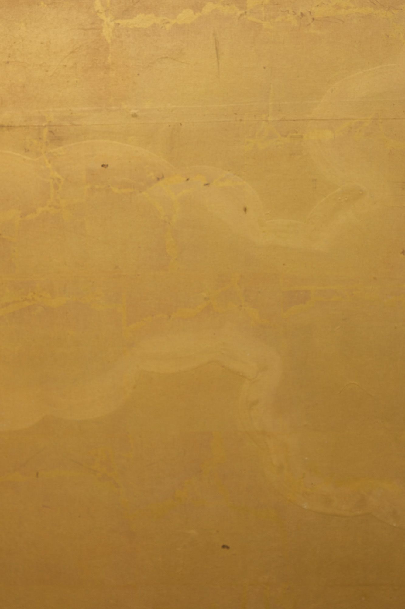 The multi-coloured painting is set on a gold leaf background. The chrysanthemum flowers are painted by using shell paste 胡粉 (gofun) in relief. The golden clouds surrounding the scenes are very subtly visible, as they have a slightly different shimmer than the central part and low relief at the edges.