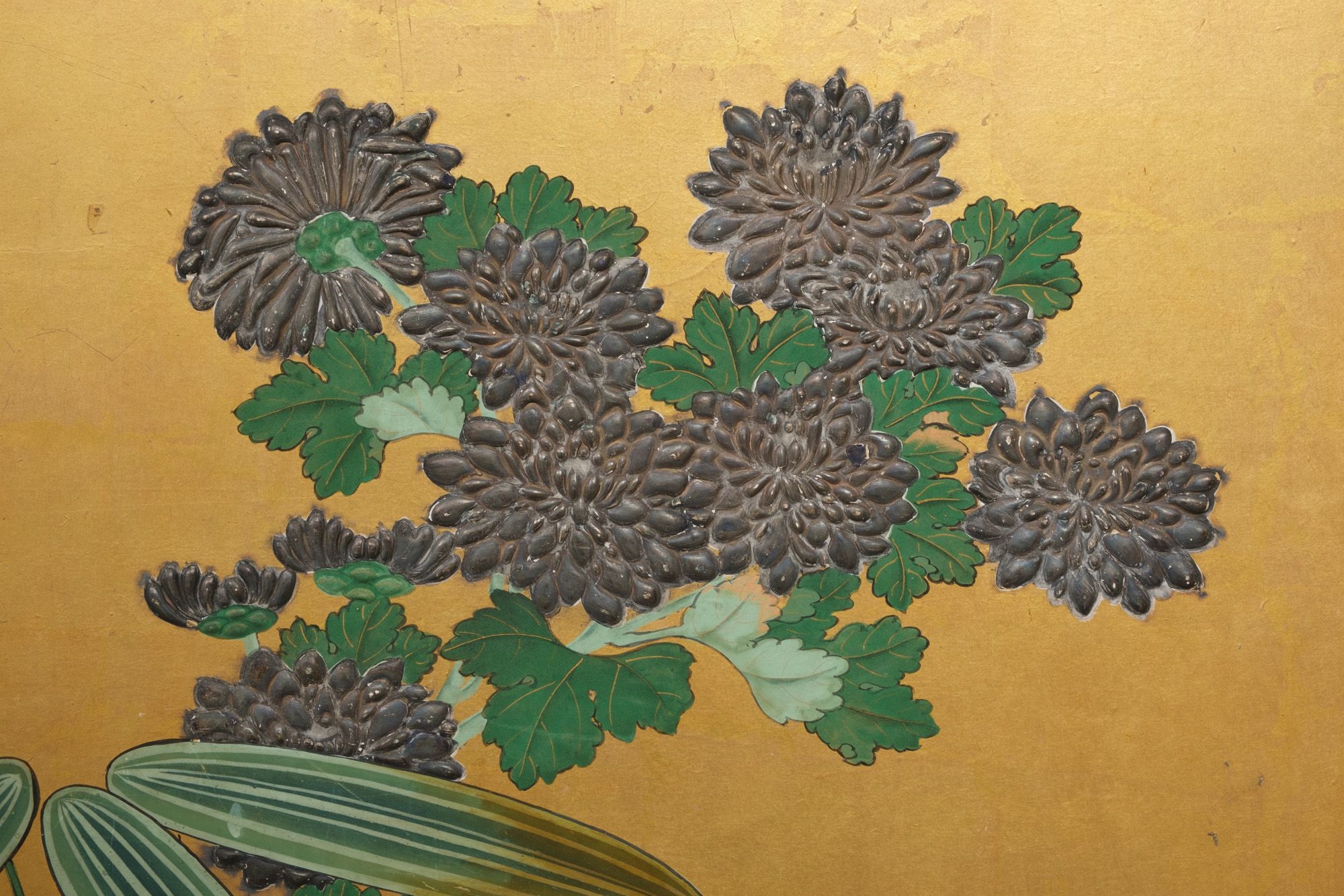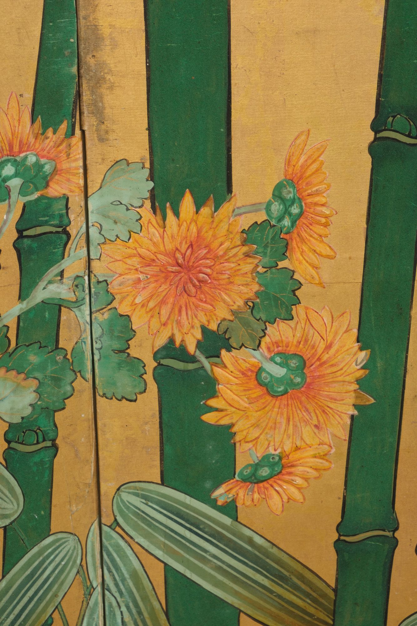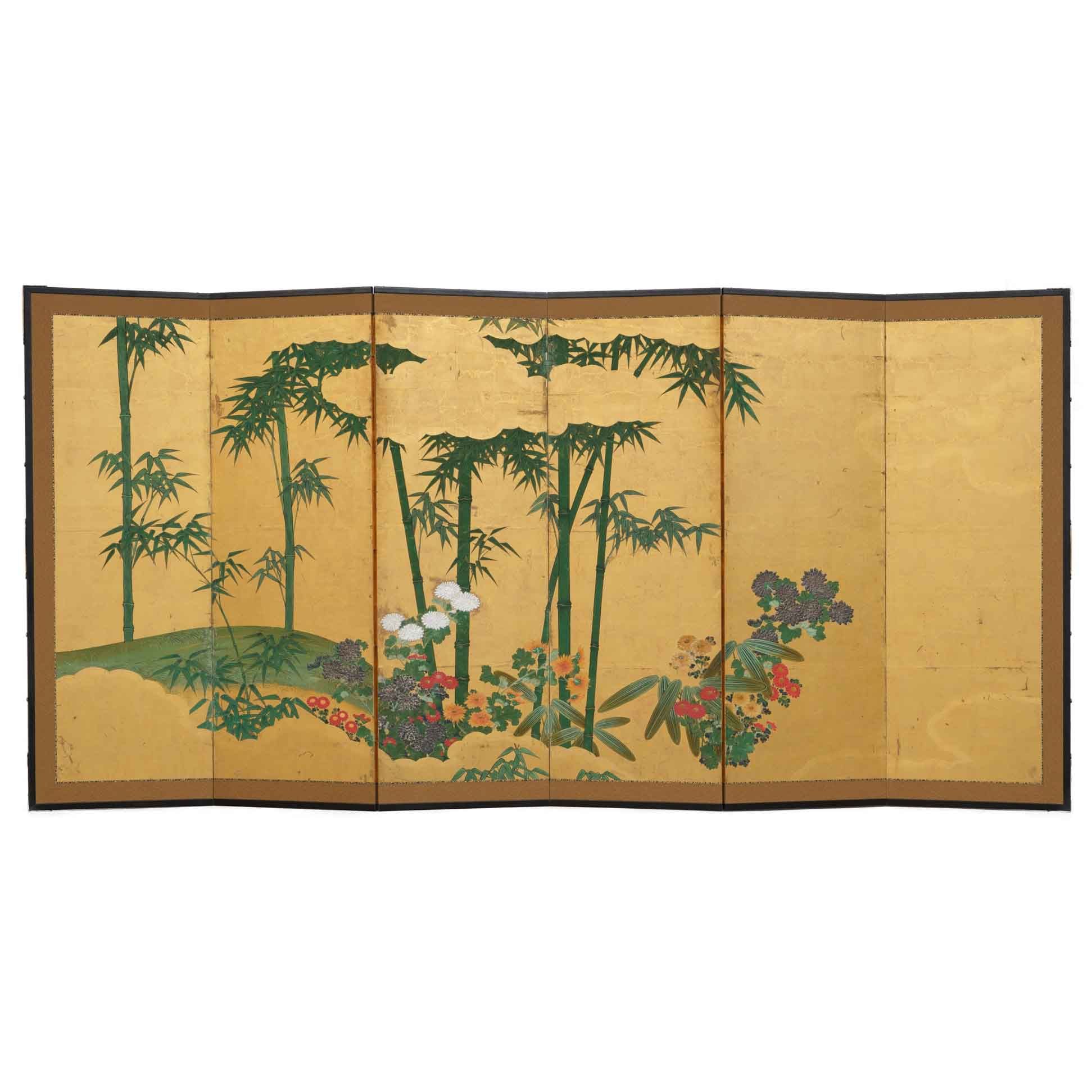 A charming medium-sized six-panel room divider 屏風 (byôbu) with a refined continuous painting of a bamboo forest 竹 (take) with a wide array of blooming chrysanthemums a its feet. The serene touch of the painting is reminiscent of the style of the Rinpa-school.