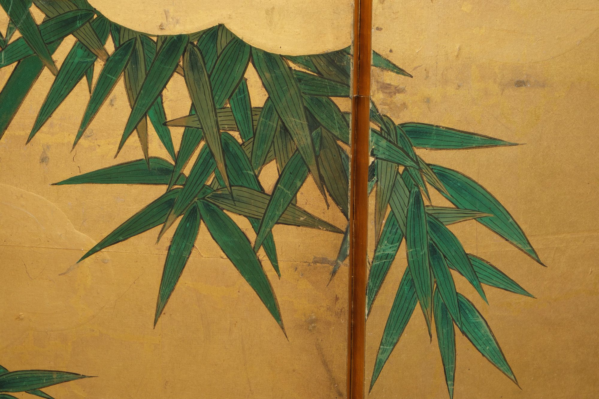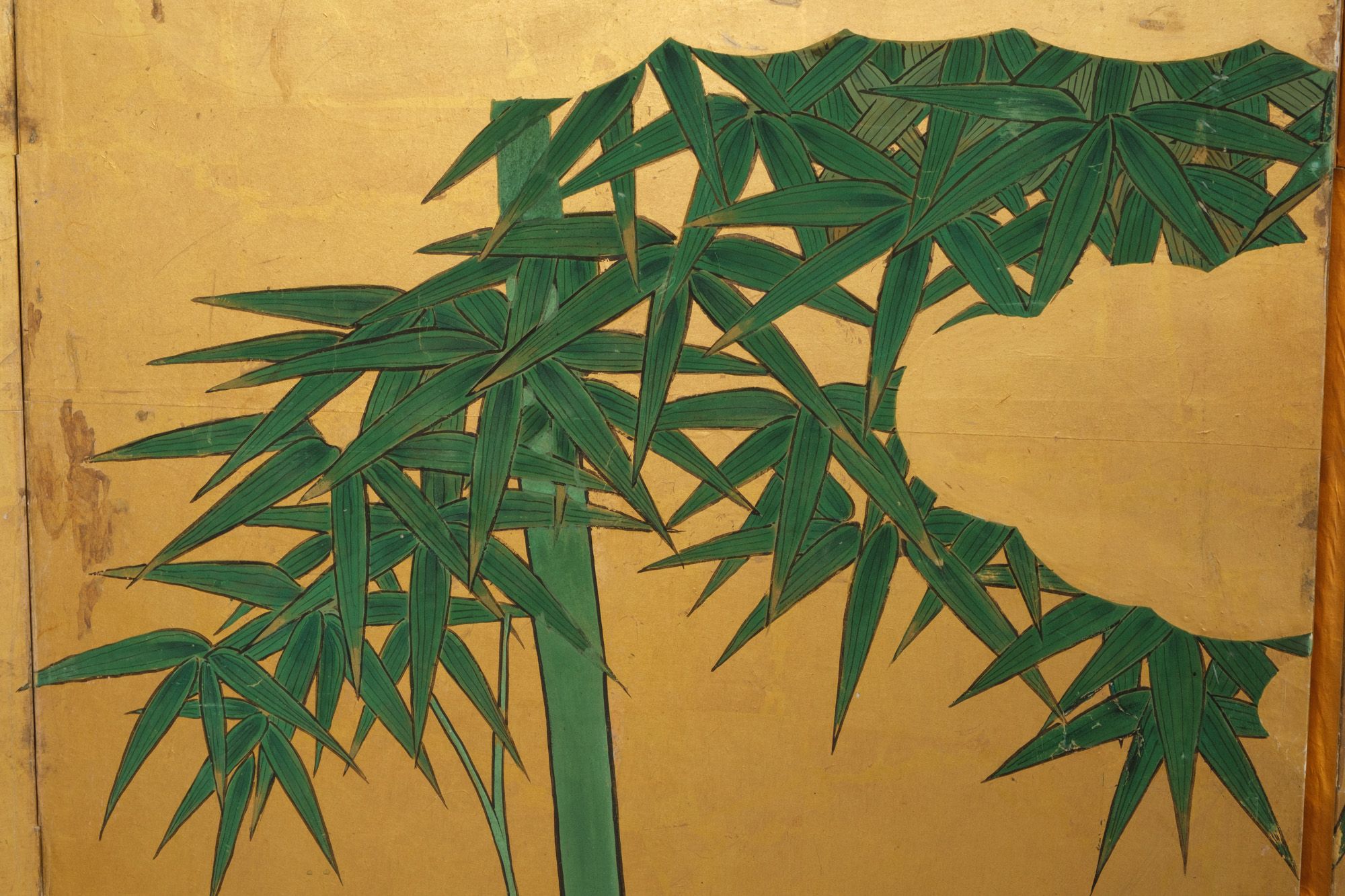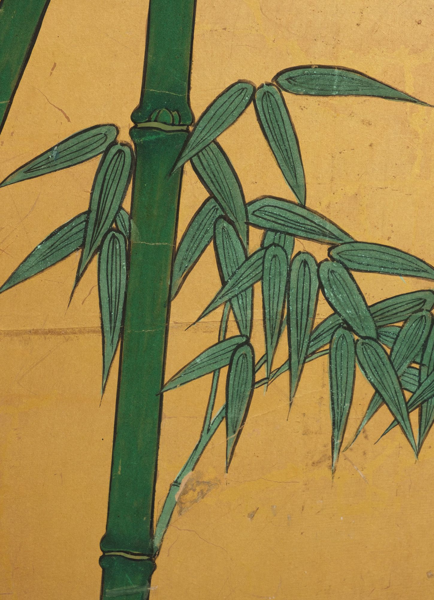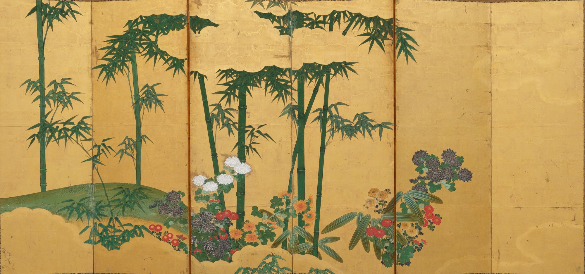 A charming medium-sized six-panel room divider 屏風 (byôbu) with a refined continuous painting of a bamboo forest 竹 (take) with a wide array of blooming chrysanthemums a its feet. The serene touch of the painting is reminiscent of the style of the Rinpa-school.
