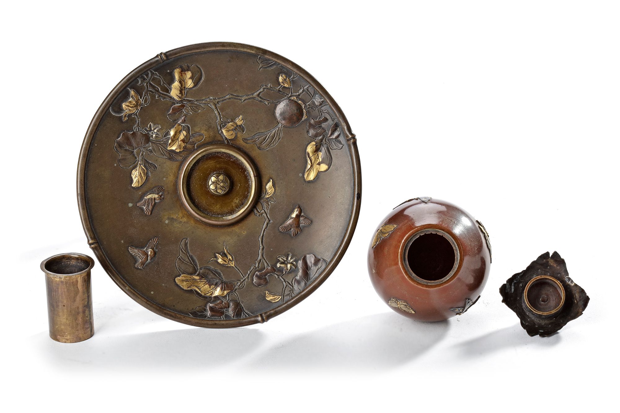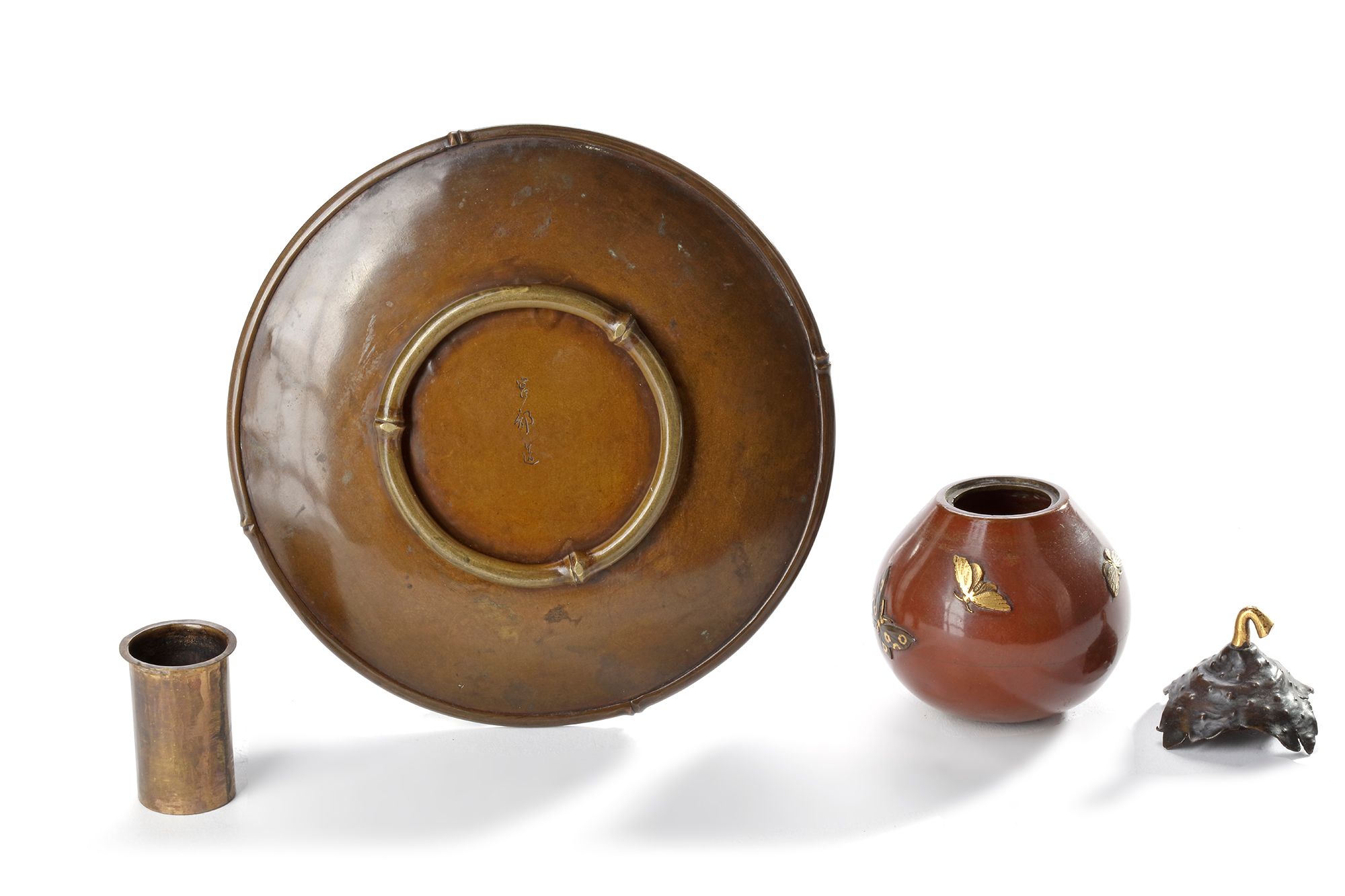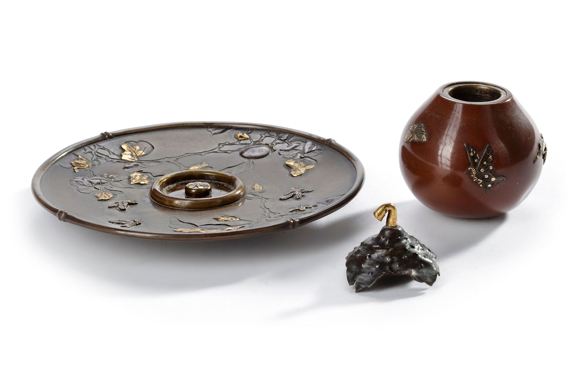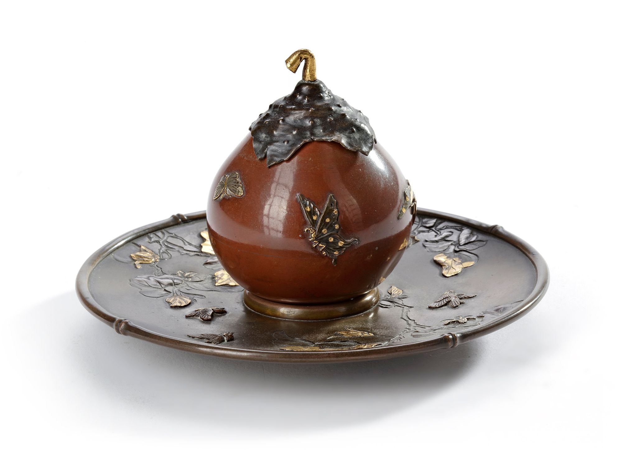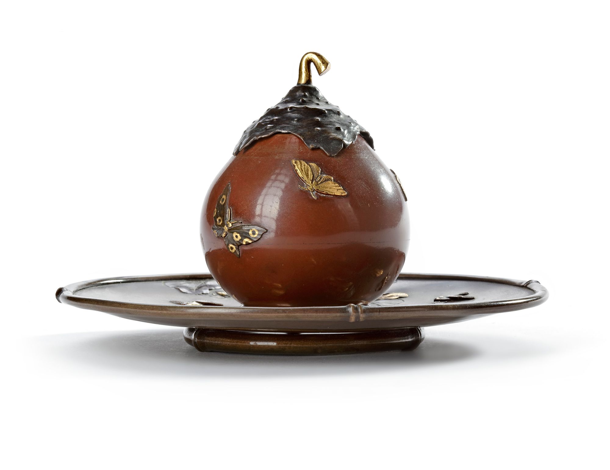 A Japanese bronze fruit stylized with gilt bronze butterflies on a gilt bronze dish carved with floral leafy sprays. Diameter: 12.5 cm.
