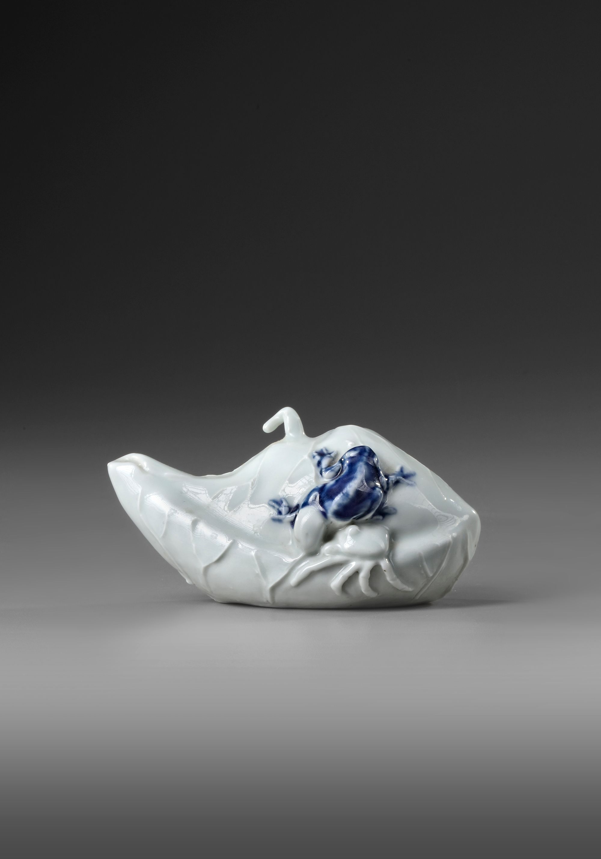 A Japanese water dropper for calligraphy in the form of a folded lotus with crab and frog, 19th century