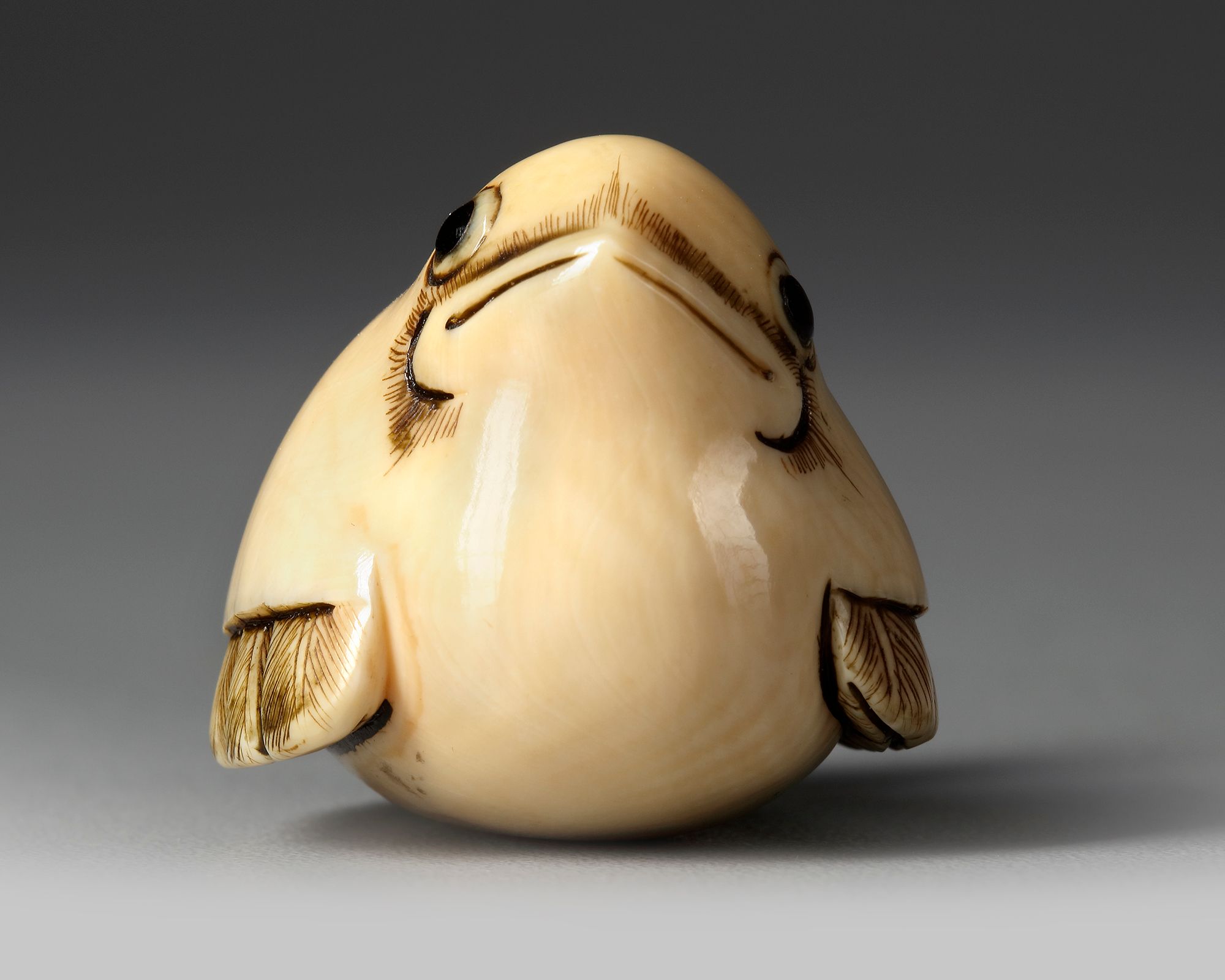 An elephant ivory netsuke in the shape of a sparrow, with folded wings and wheeling tail. Feathers of both wings, the tail and above the bill accentuated with dark pigment.