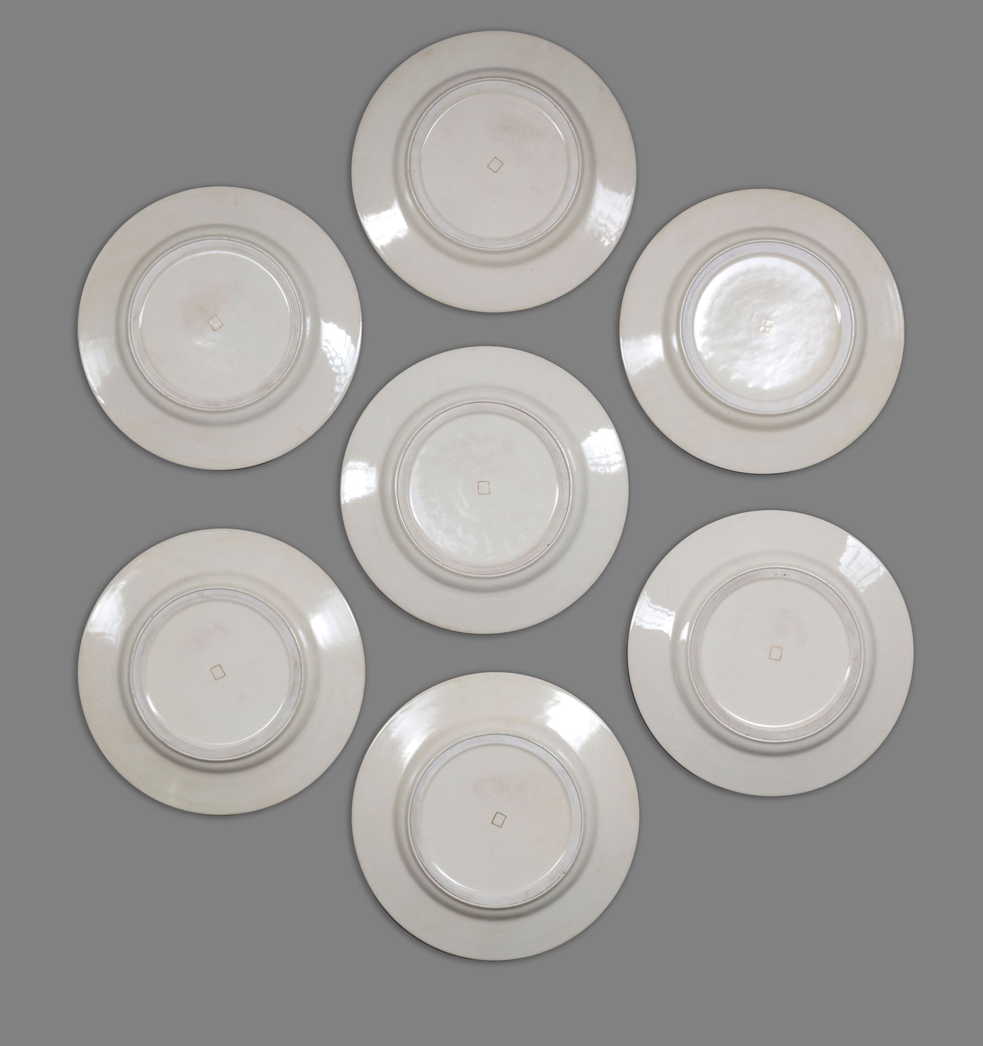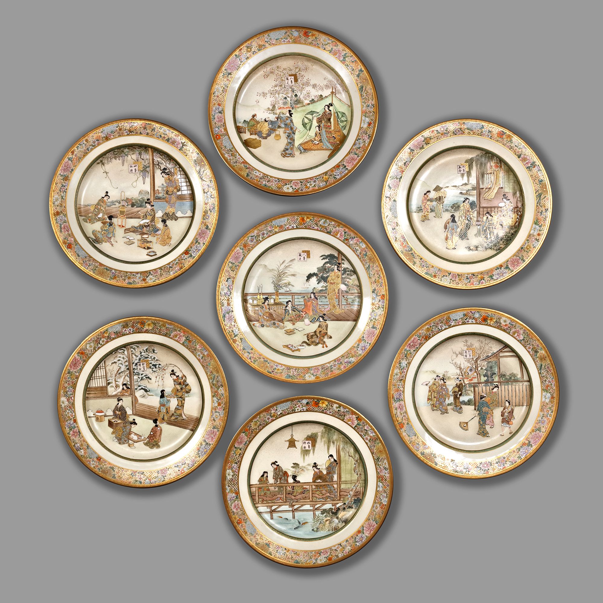 Painted in polychrome enamels and gilt over a clear crackled ground and each plate decorated with a different scene of beauties and children, the figures shown enjoying activities. The wide border composed of a profusion of flowers and a smaller gilt band of geometric motifs, each plate with a cartouche identifying the month.