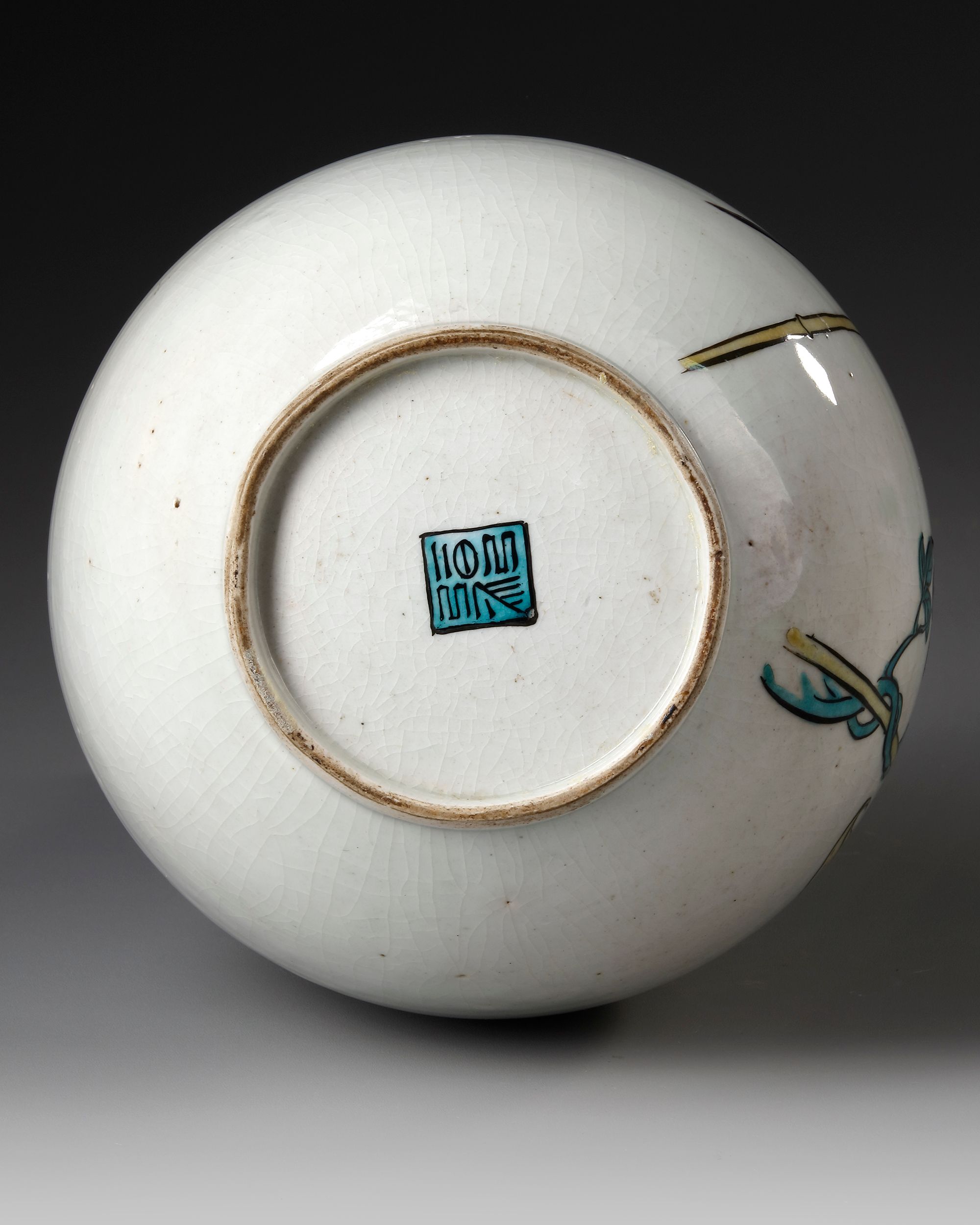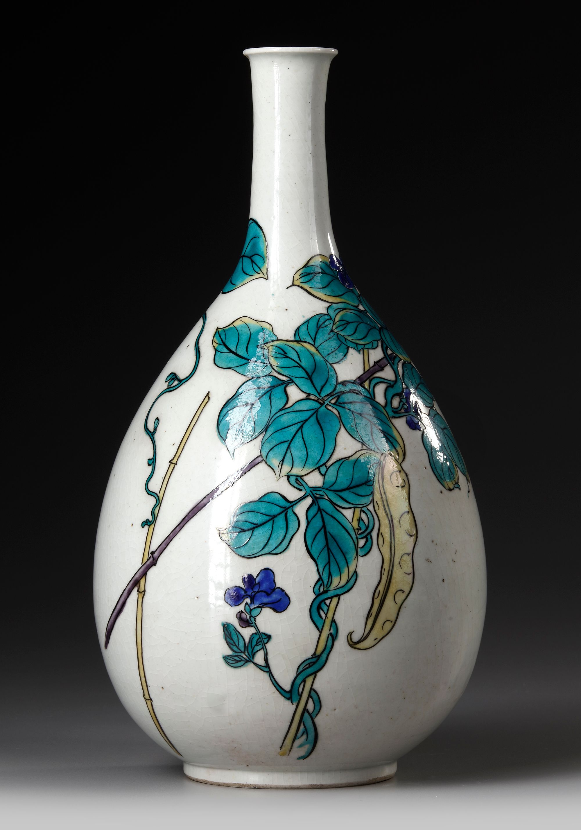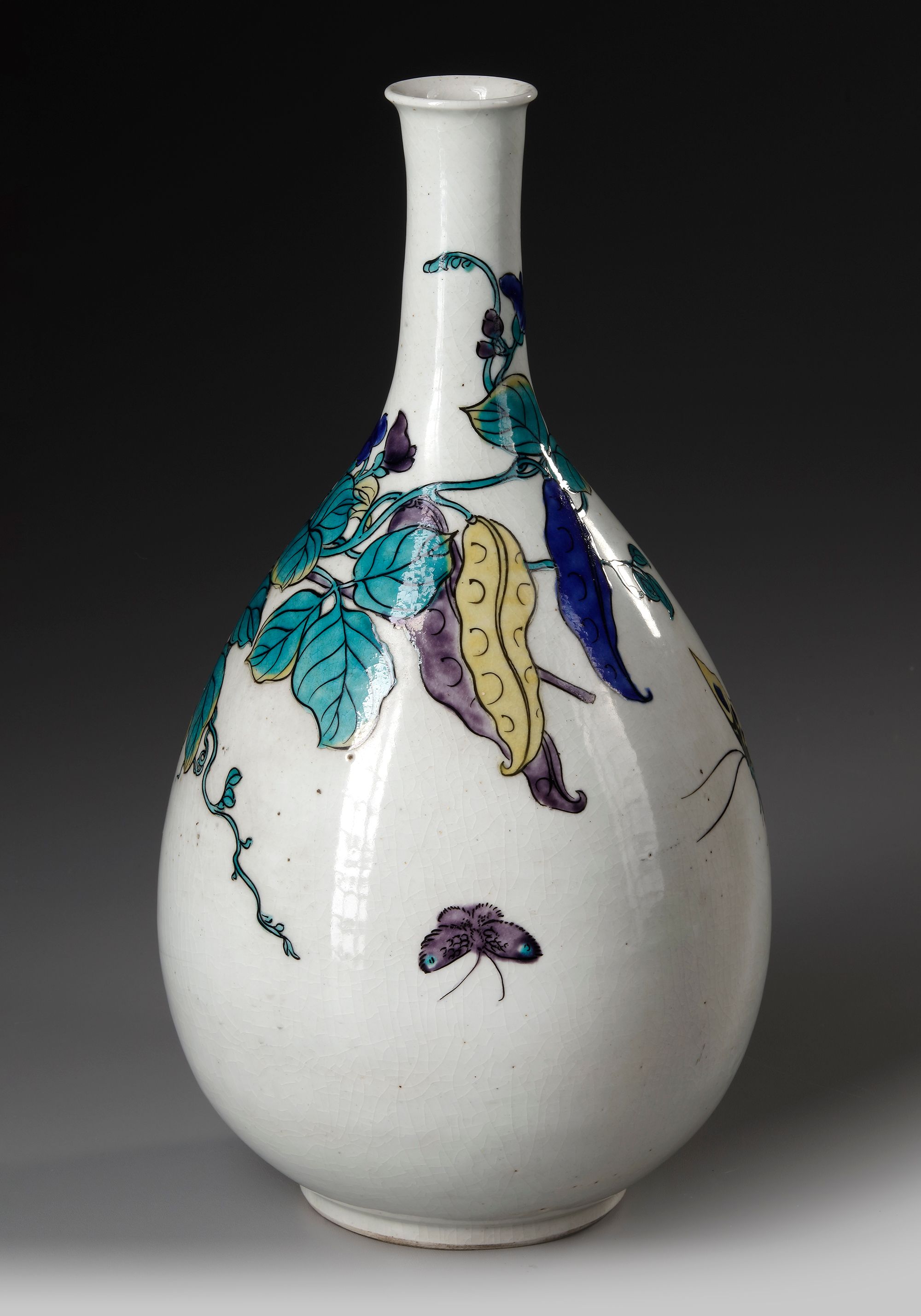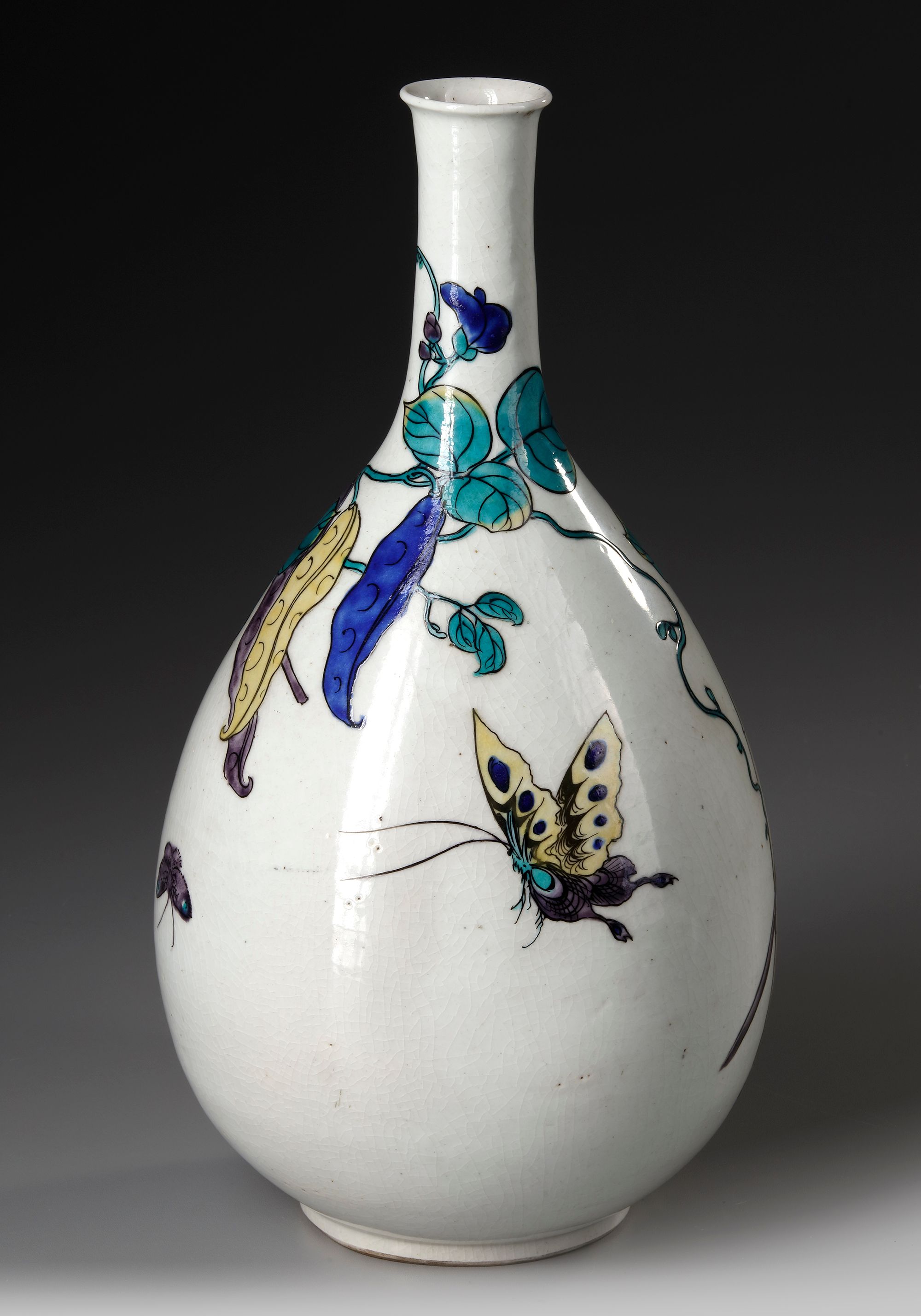 A Japanese kutani bottle vase decorated with butterflies flying over a tree. Height 37 cm.