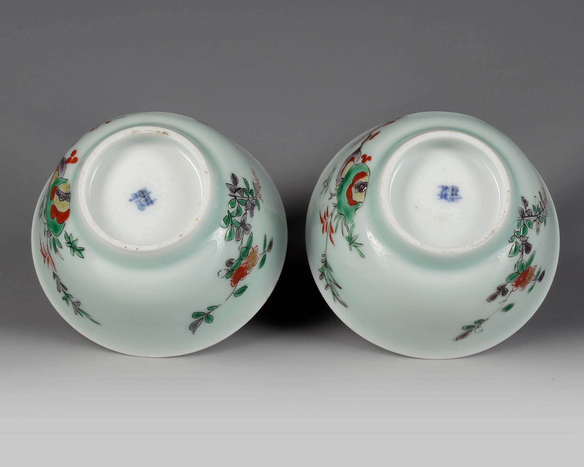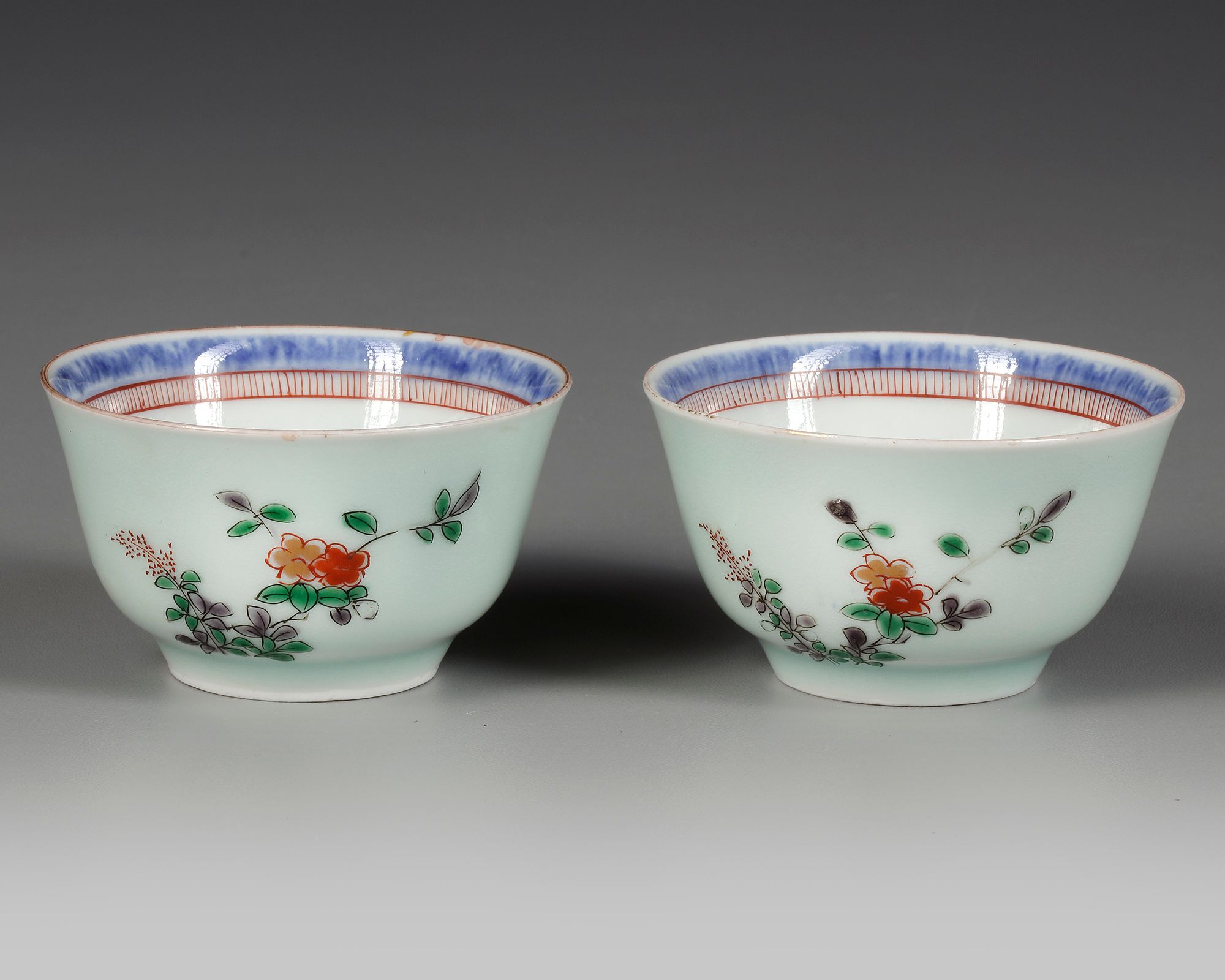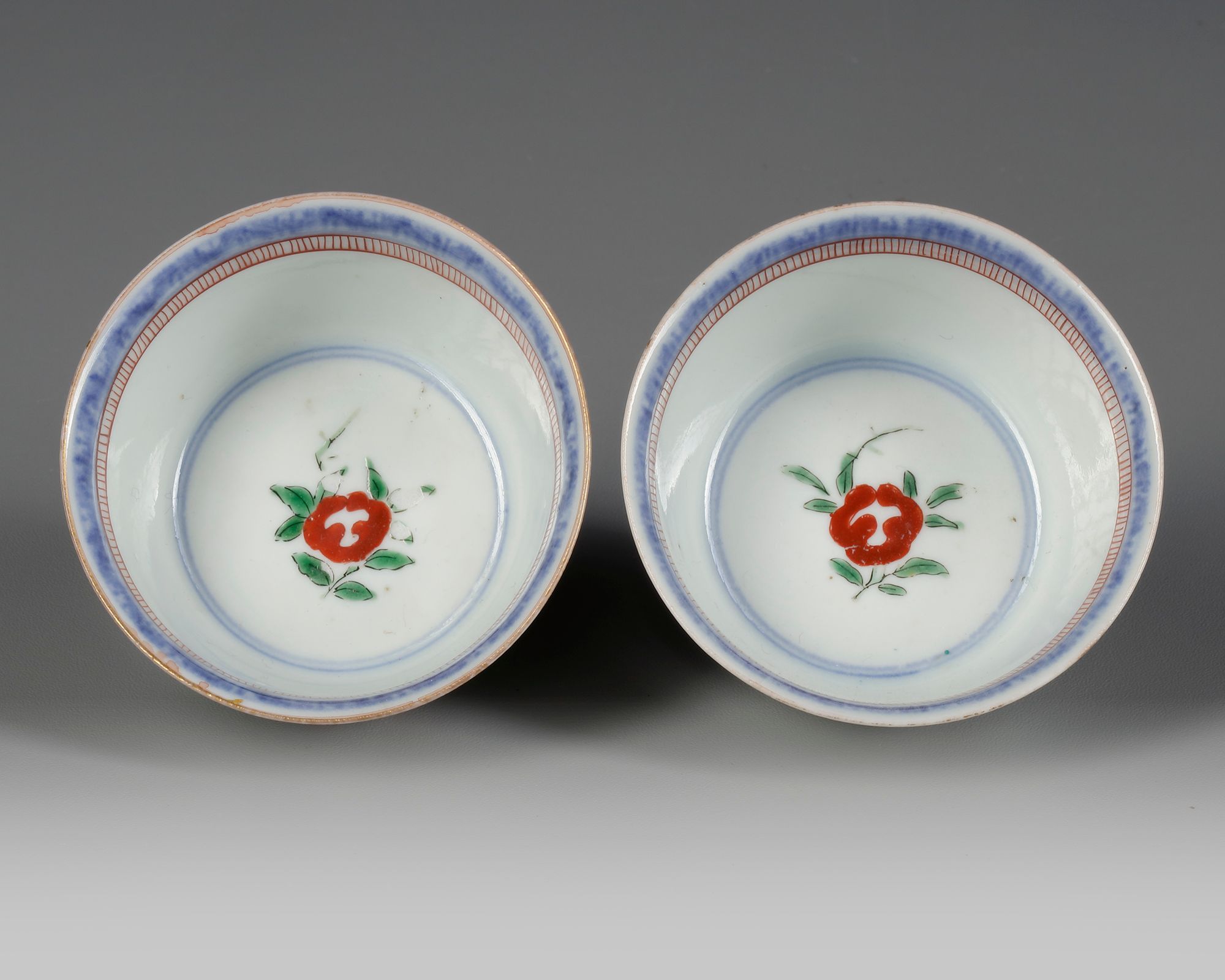 Two Japanese porcelain cups decorated with flowers growing from ornamental rocks. Diameter 7.8 cm. Height 4 cm.