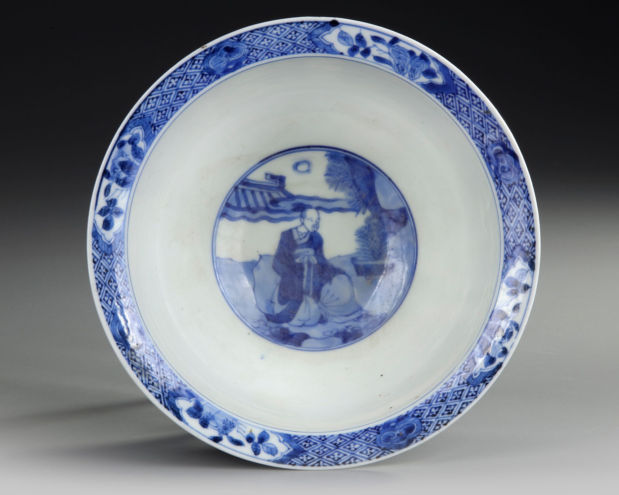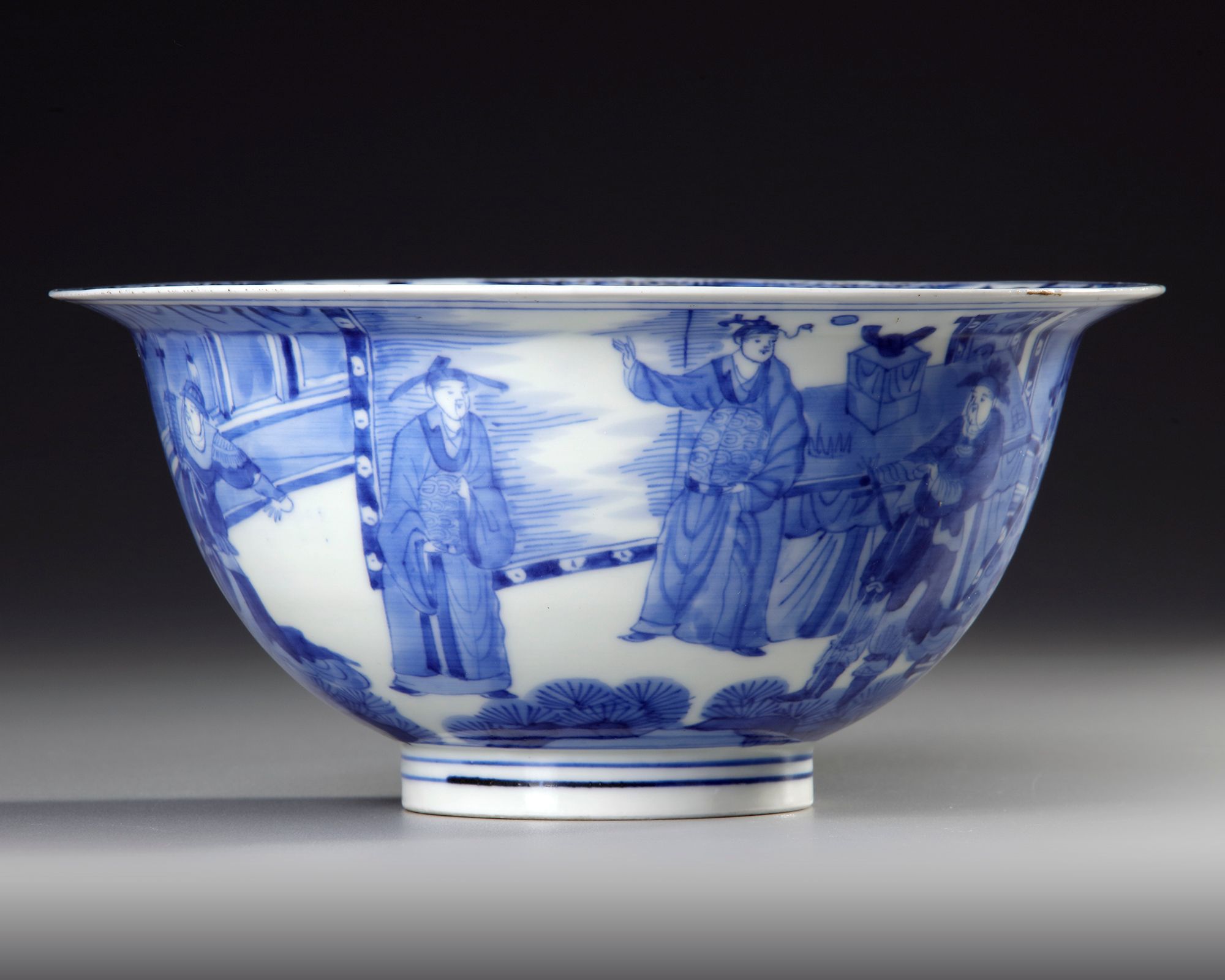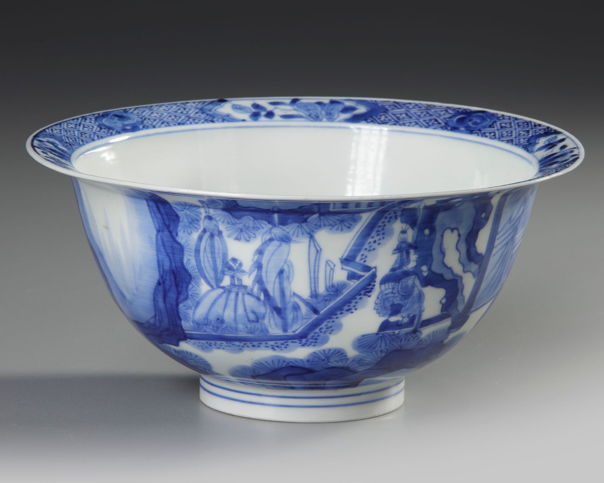 A Japanese porcelain bowl with an everted rim and small foot, decorated with a dignitary accompanied by servants in a court scene. Diameter: 20 cm