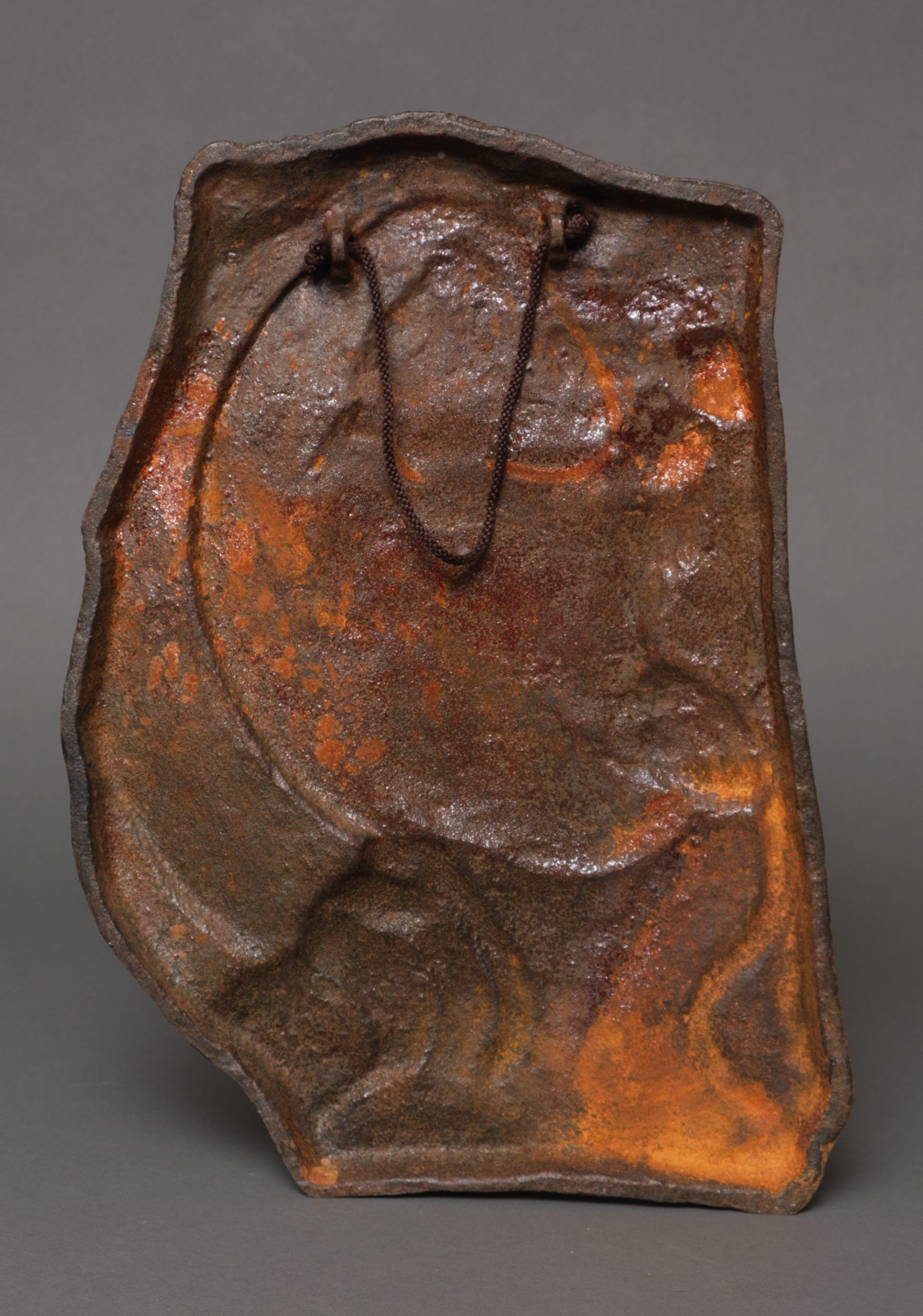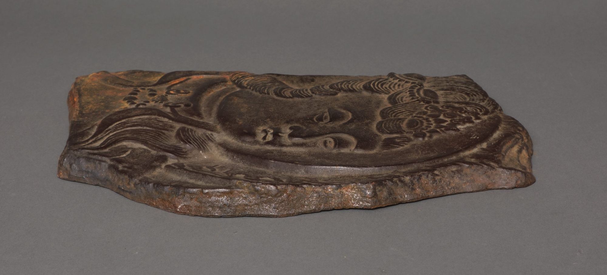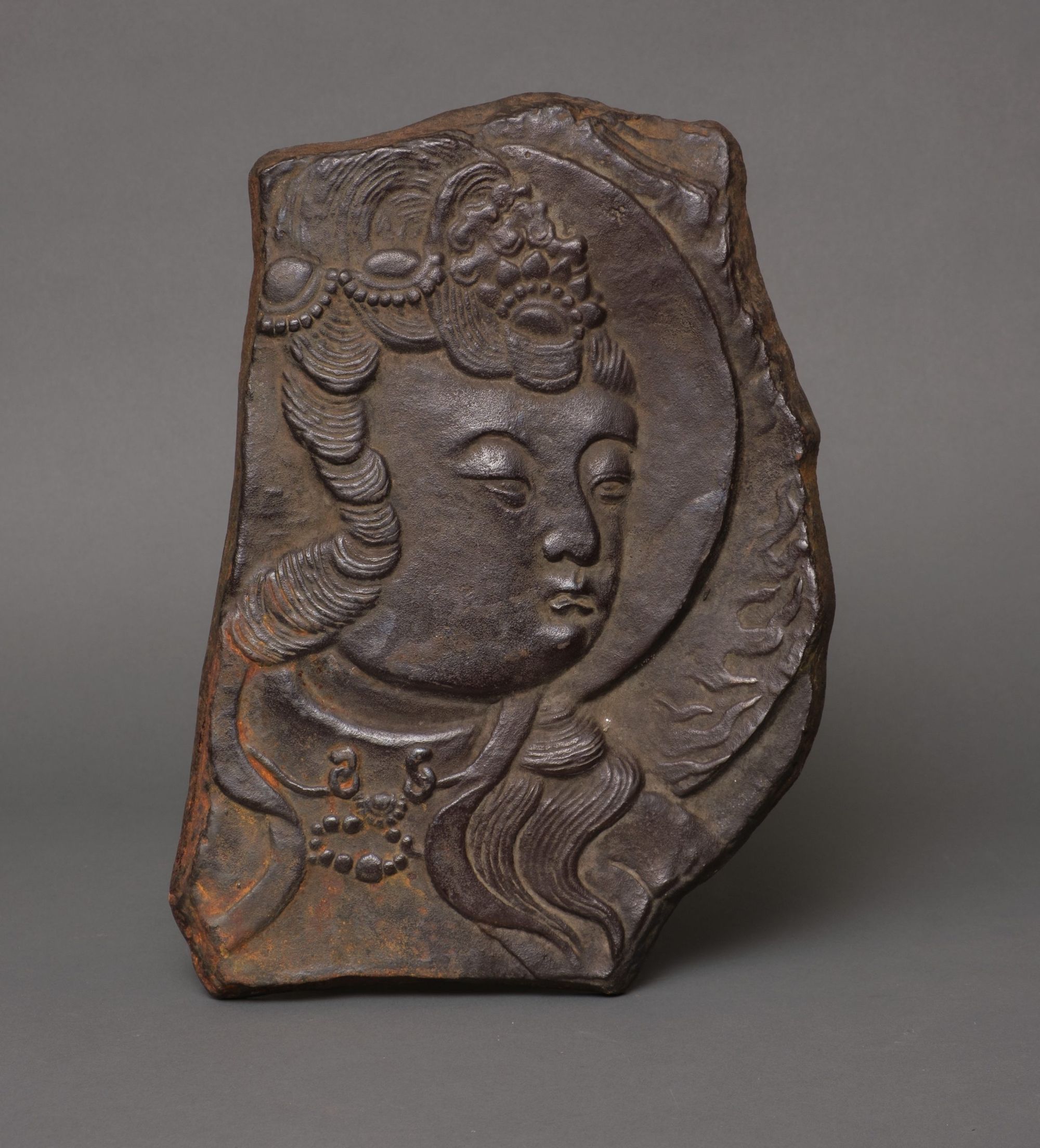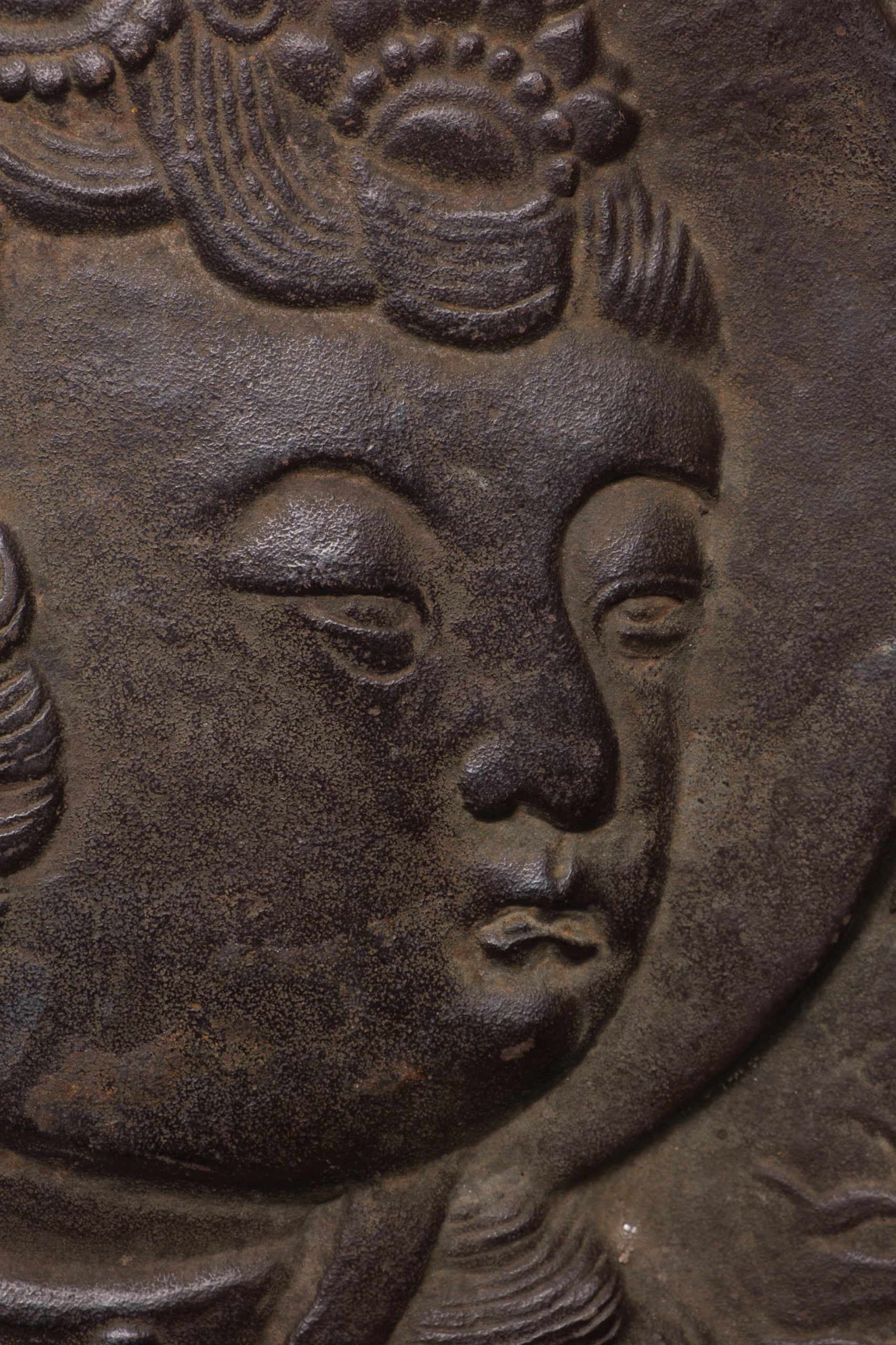 Cast iron plaque showcasing a portrait of the bodhisattva Kannon en-profile in relief. Kannon is the Goddess of Mercy, also known as Avalokiteshvara or Guanyin.