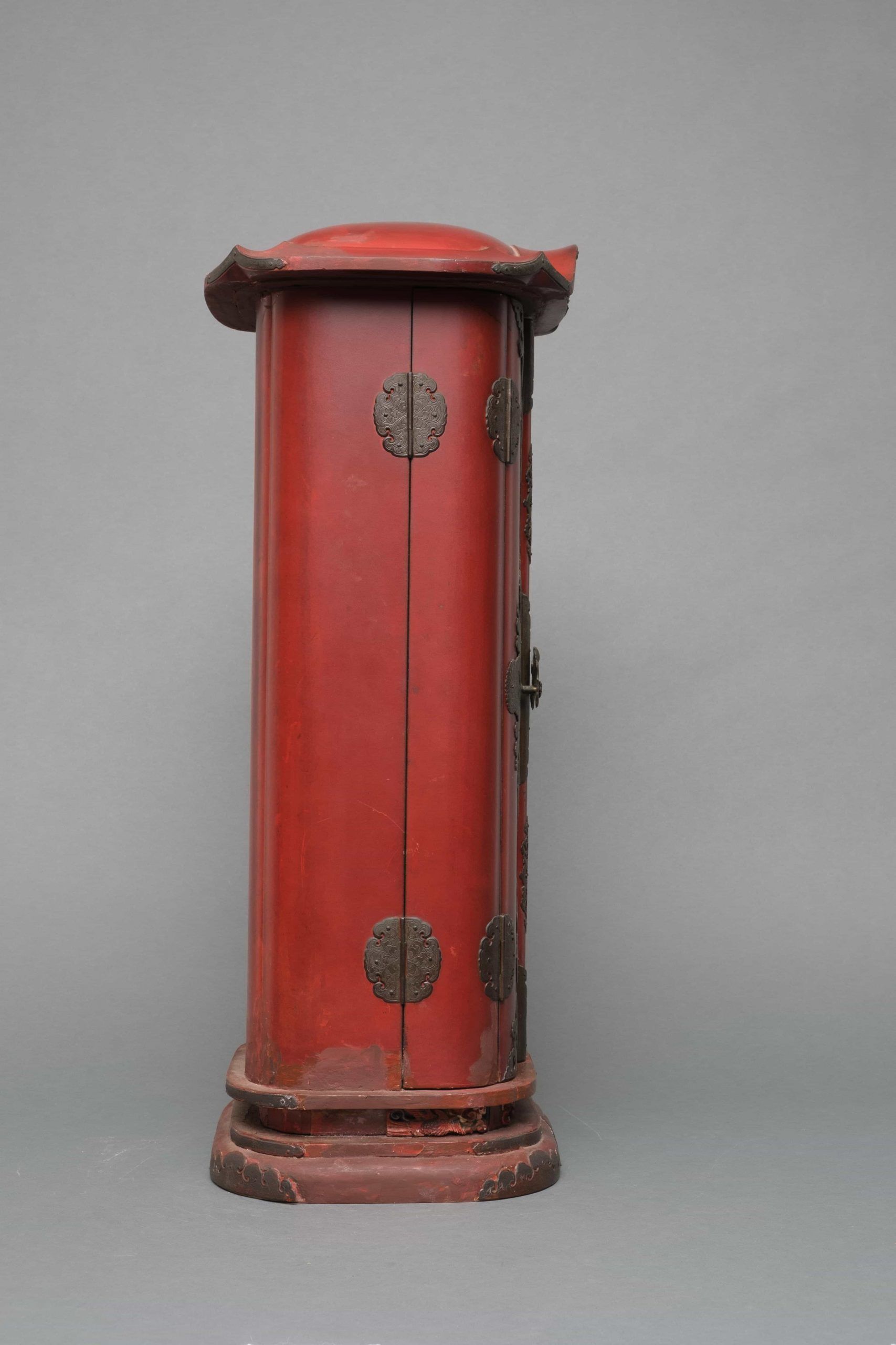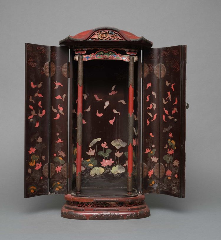 A dark red lacquered wooden zushi-shrine. Its black lacquered inside is elegantly decorated with a lotus pond with white and red lotus flowers and lotus leaves in gold maki-e lacquer. With decorative metalwork on the outside. The shrine has a black wooden Raikō Amida (Amitabha) with his left hand the vitarka-gesture or the raiko’in gesture of welcoming the souls of the departed to his Paradise (Jōdō or Sanskrit: Sukhavati). The right hand in de giving varada-gesture pointing to the ground.