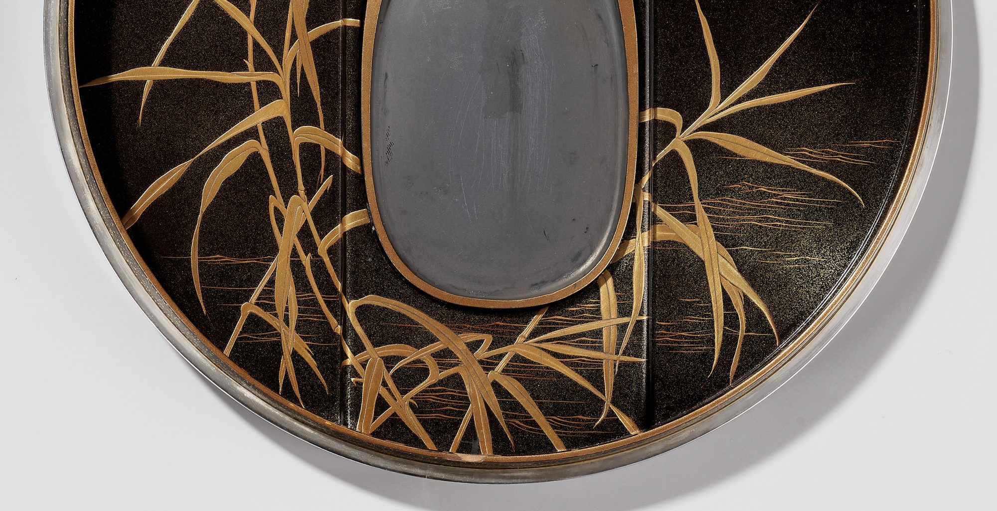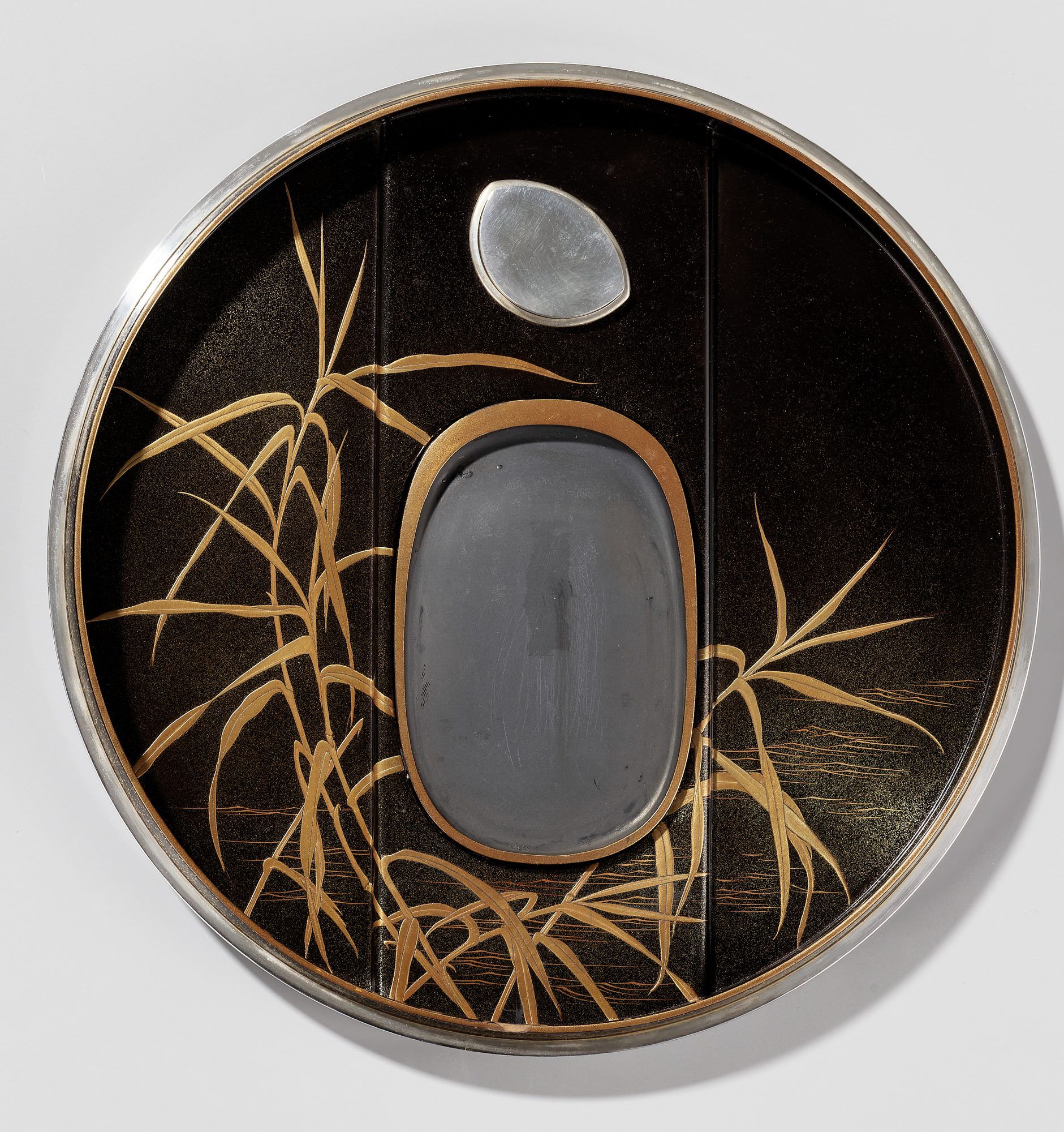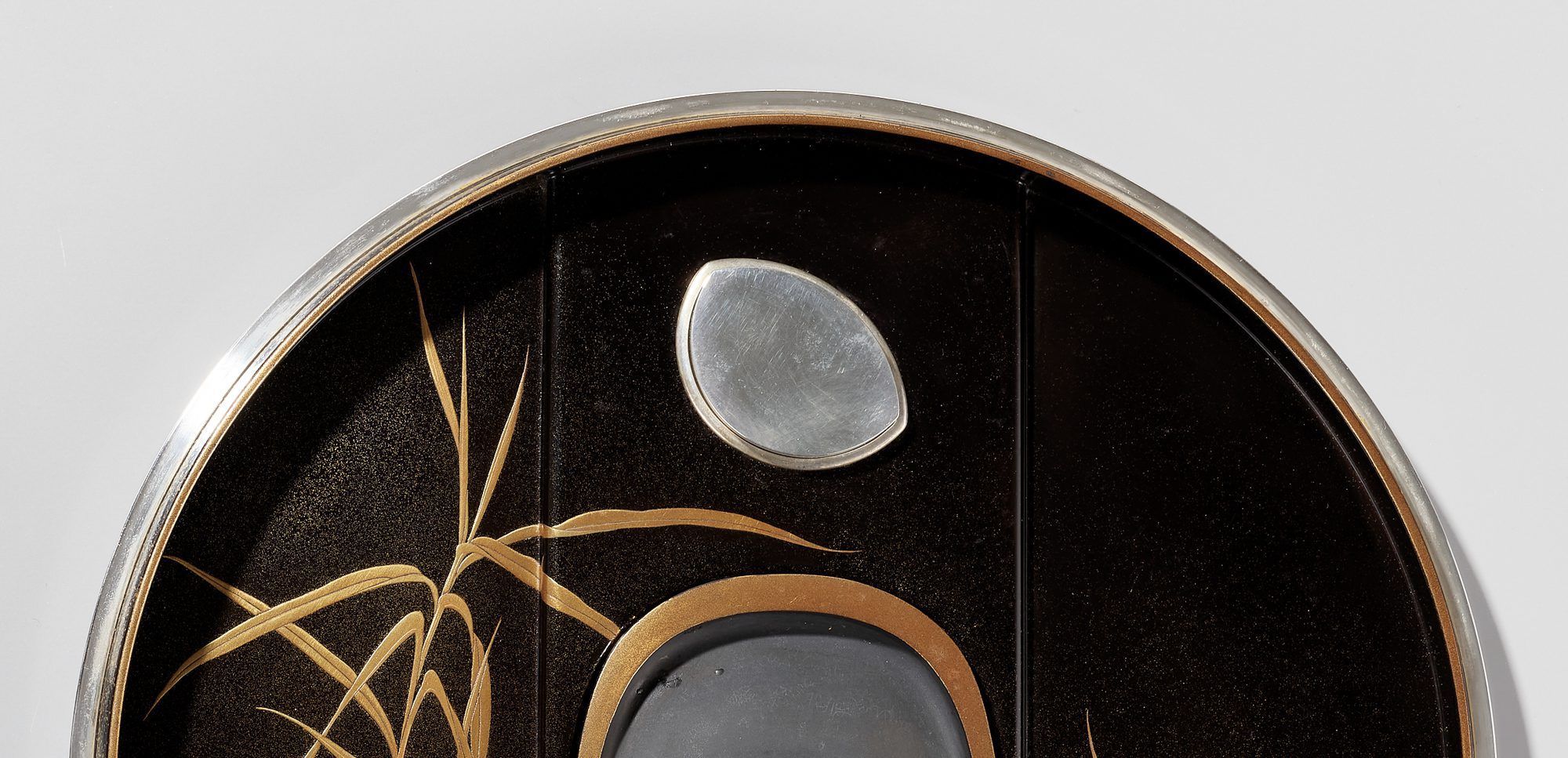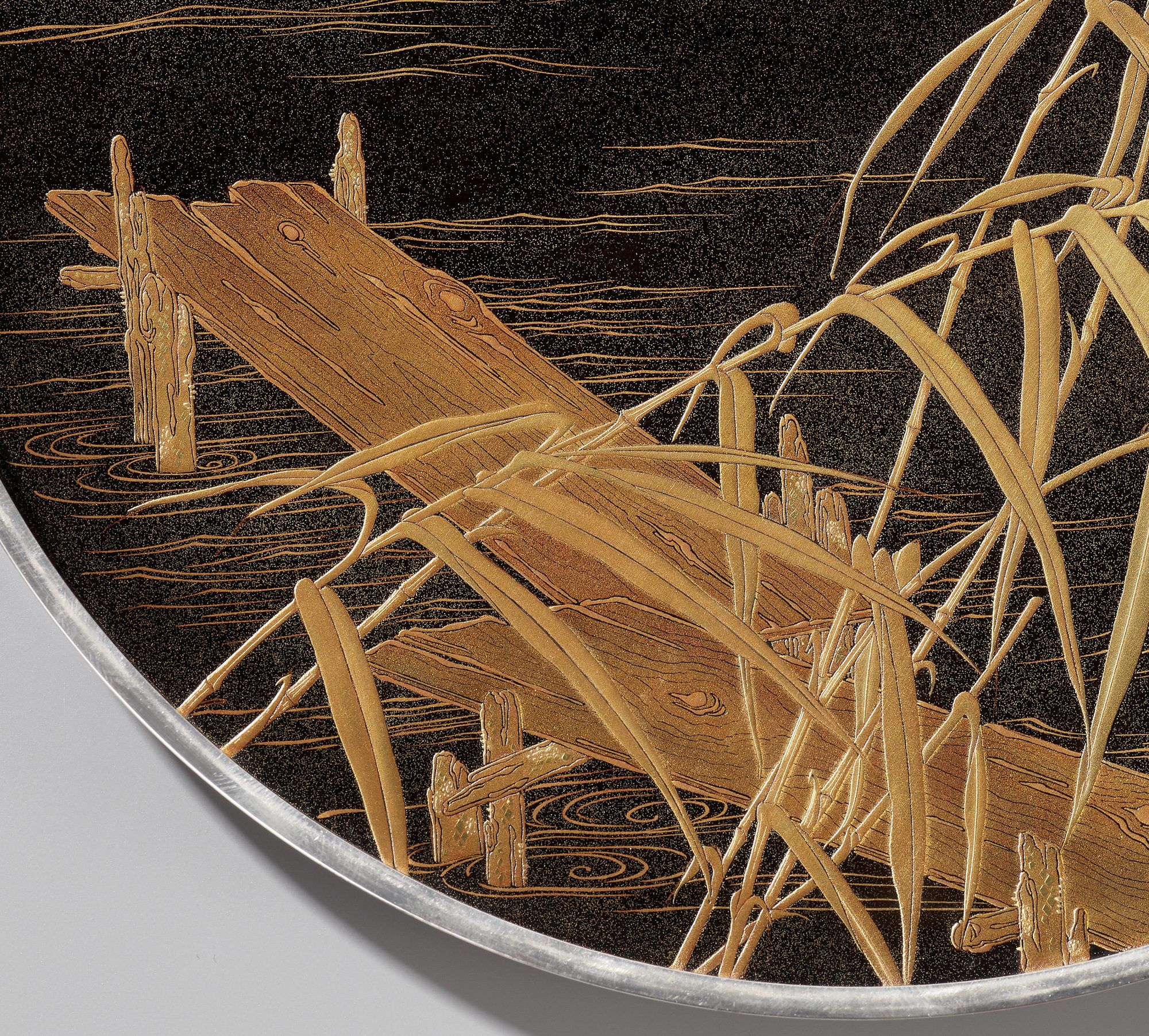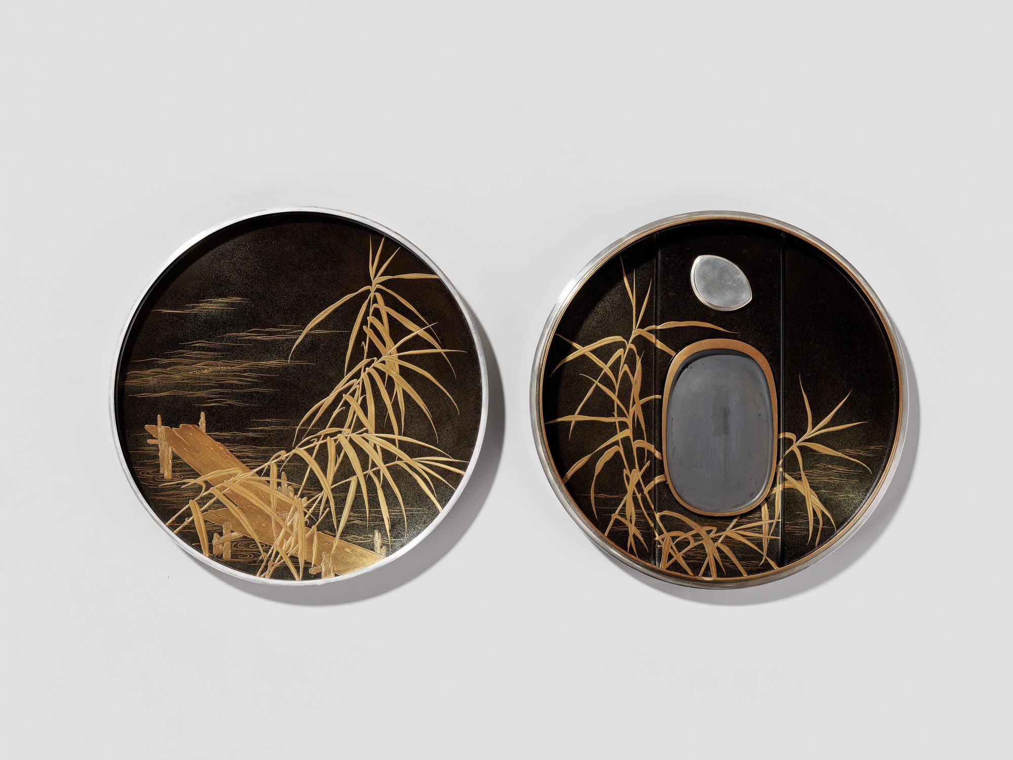 The interior of the cover bearing a densely sprinkled ground similarly decorated and with kirikane 切金 to depict a river with wooden planks and bamboo. Continued on the similarly lacquered interior of the box with a central raised section fitted with an oval inkstone 硯 (suzuri) and silver waterdropper, marked, in the form of a waning gibbous moon. The latter, reflecting the distinctive form of the writing box resembling a full moon. Including original wooden tomobako 供箱 (storage box) with inscriptions in ink.