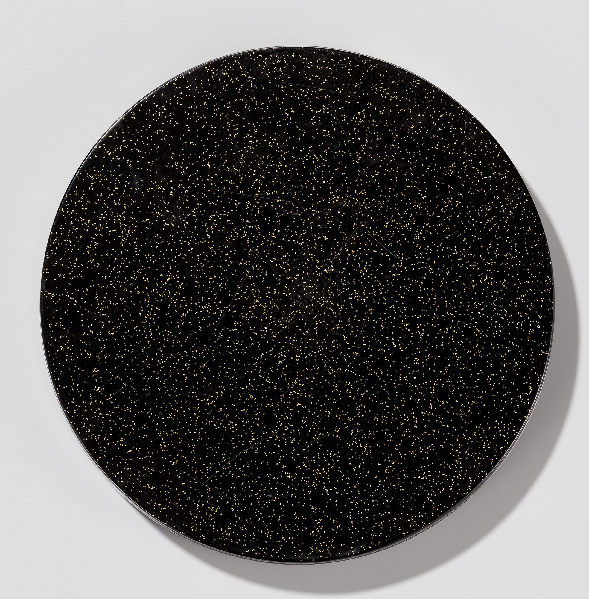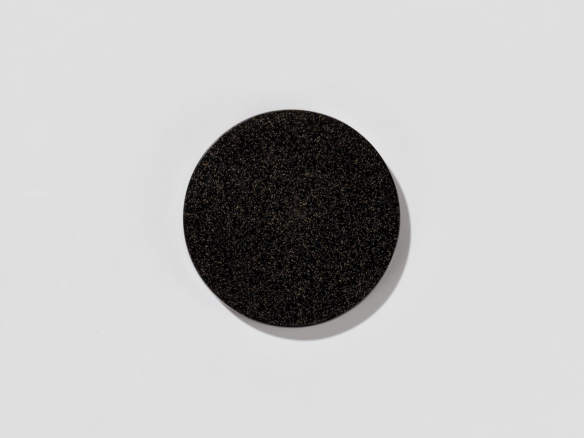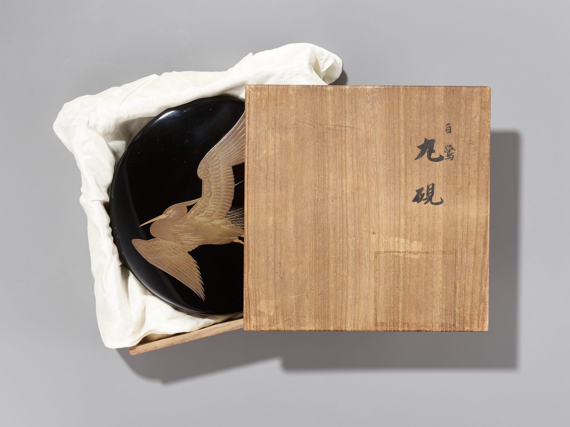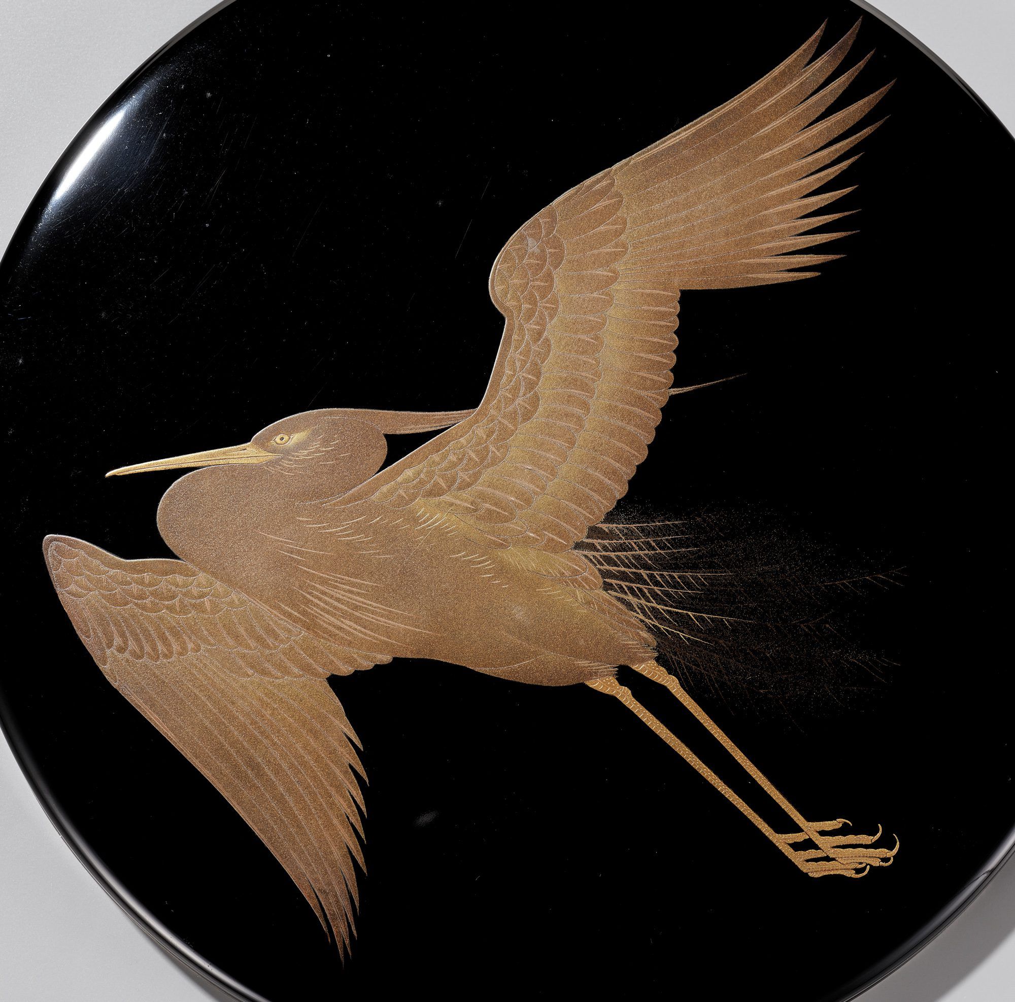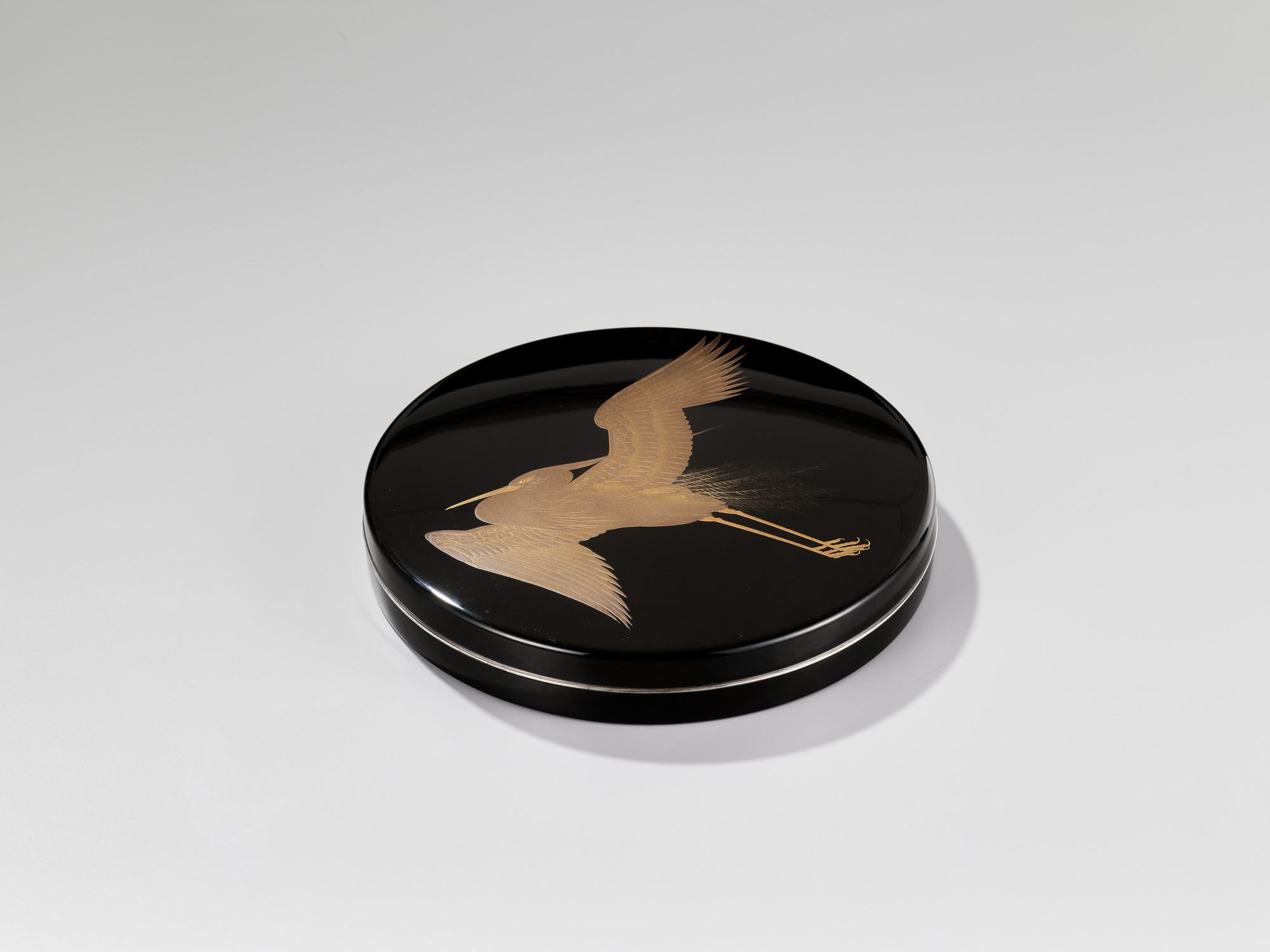 A lacquer suzuri’bako 硯箱 (writing box) of circular form depicting a flying heron 白鷺 (shirasagi) with its wings spread out.
