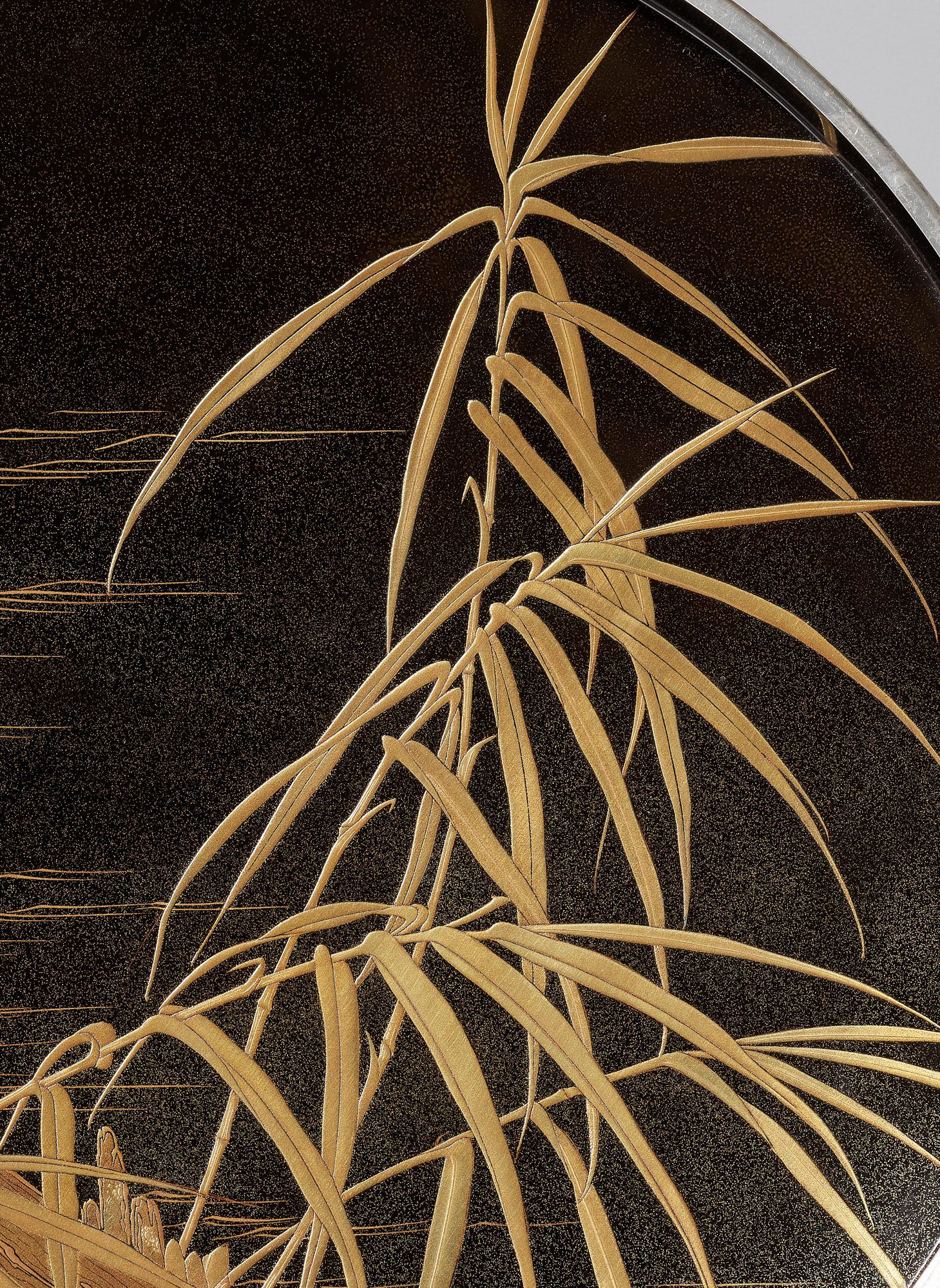 The flush-fitting cover finished with a rim of silver, and its motif executed in takamaki-e 高蒔絵 (high-relief lacquer design) in different shades of gold on a glossy black lacquer ground 蝋色漆 (rôiro). The tailfeathers subtly rendered in gold and silver togidashi-e 研出蒔絵 (burnished lacquer design).