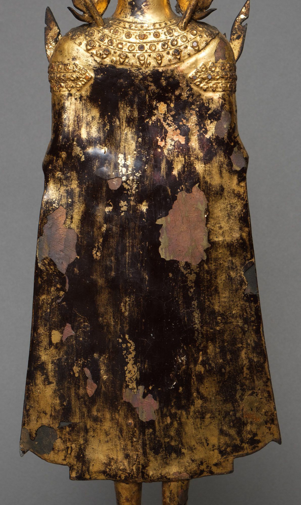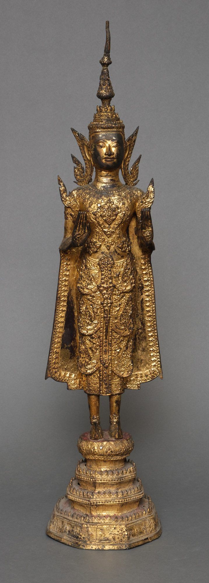 A gilded bronze sculpture with some mica inlay of a standing Pang Ham Yati (the Monday Buddha) holding his hands in a double abhaya mudra. He stands on a 4-tiered octagonal lotus pedestal with a pointy railing. A very refined shaped and painted face in a meditative expression. The Buddha is elaborately dressed in full royal regalia, he features a spire-like crown and royal upturned slippers.