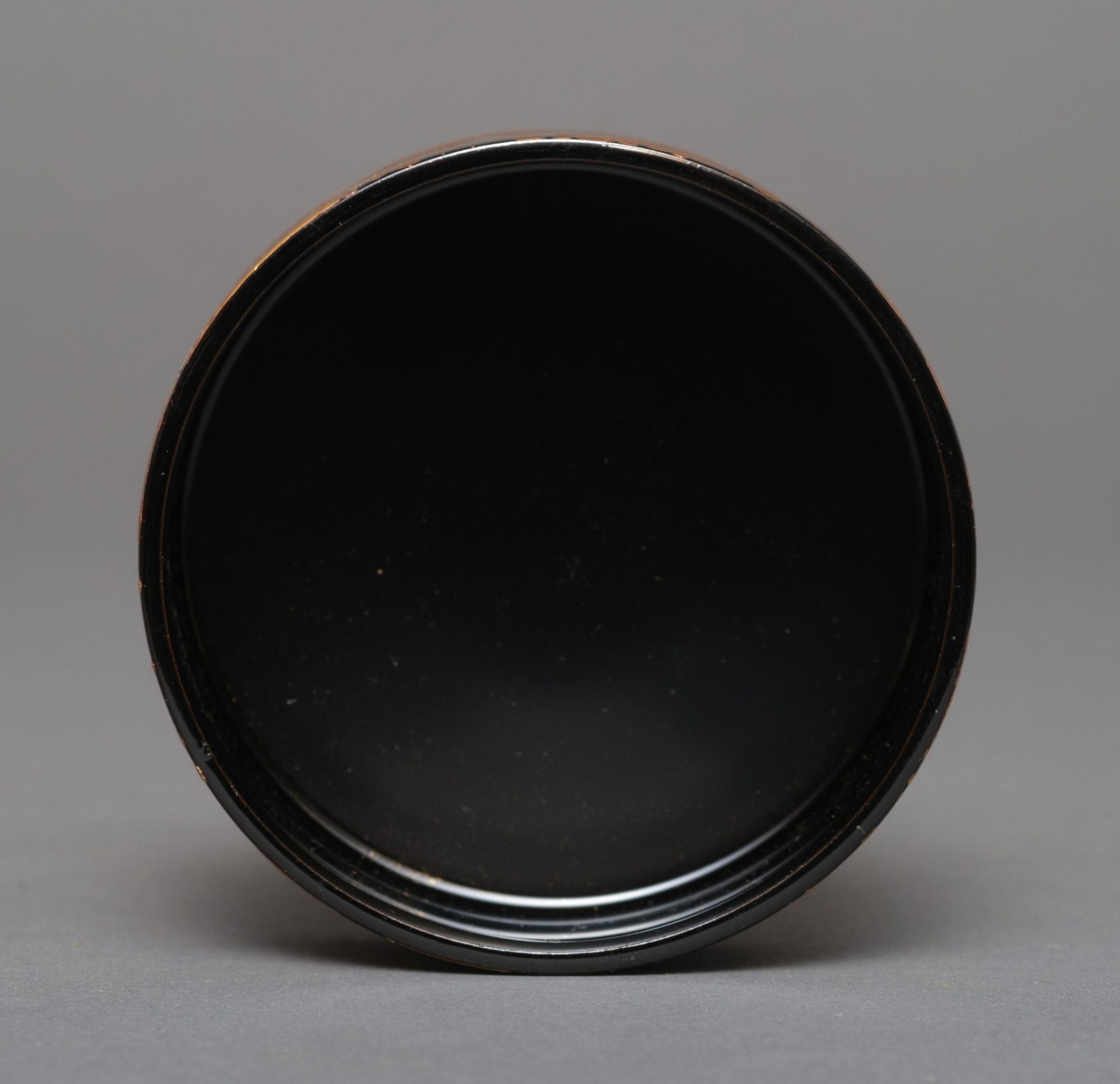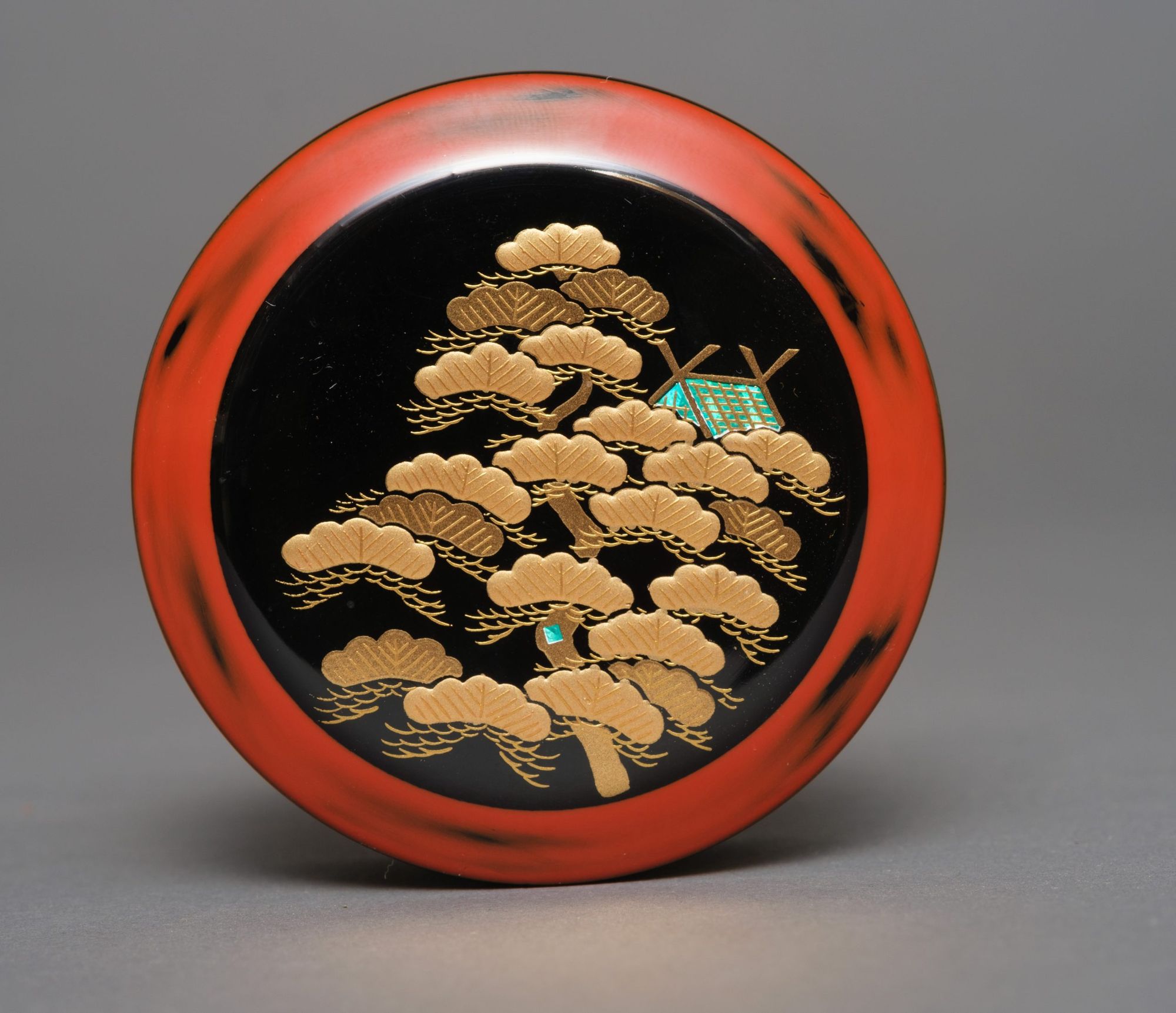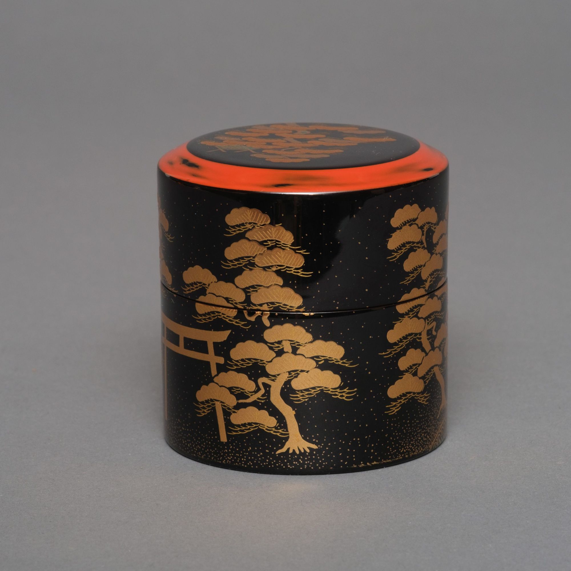 A lacquer tea caddy 棗 (natsume), cylindrical of shape with a refined design showcasing a pine tree forest 松 (matsu) surrounding a bridge over a meandering river with lively waves, and in the distance a torii 鳥居 (Shinto shrine archway). The lid’s top surface displays a prominent pine tree in front of a traditional Japanese house, bordered by a canted red negoro’nuri-style edge. The motif executed in golden hiramaki-e 平蒔絵 (low-relief lacquer design) and takamaki-e 高蒔絵 (high-relief lacquer design) over a glossy black lacquered ground, with the lid embellished by shiny blue mother-of-pearl 螺鈿 (raden). The interior and underside coated with glossy black lacquer as well. Including wooden tomobako 供箱 (storage box).