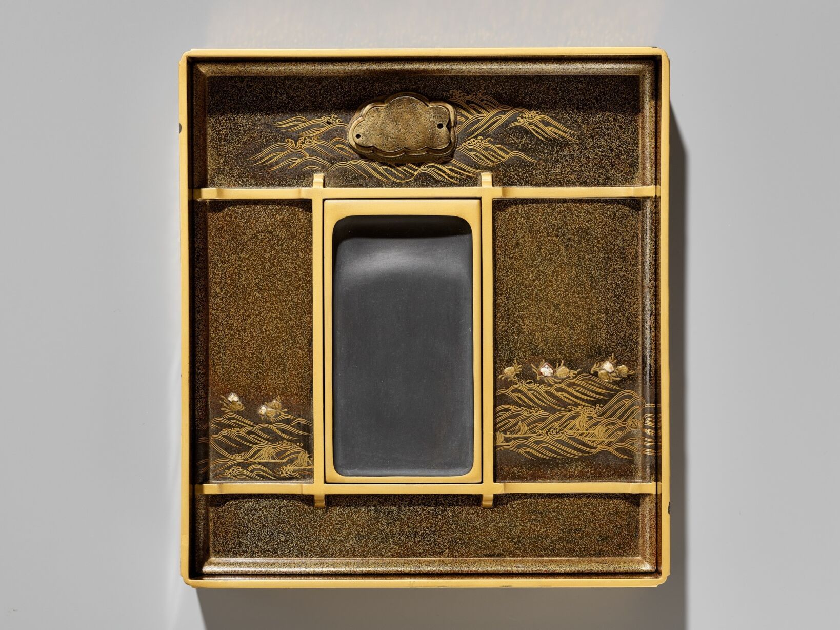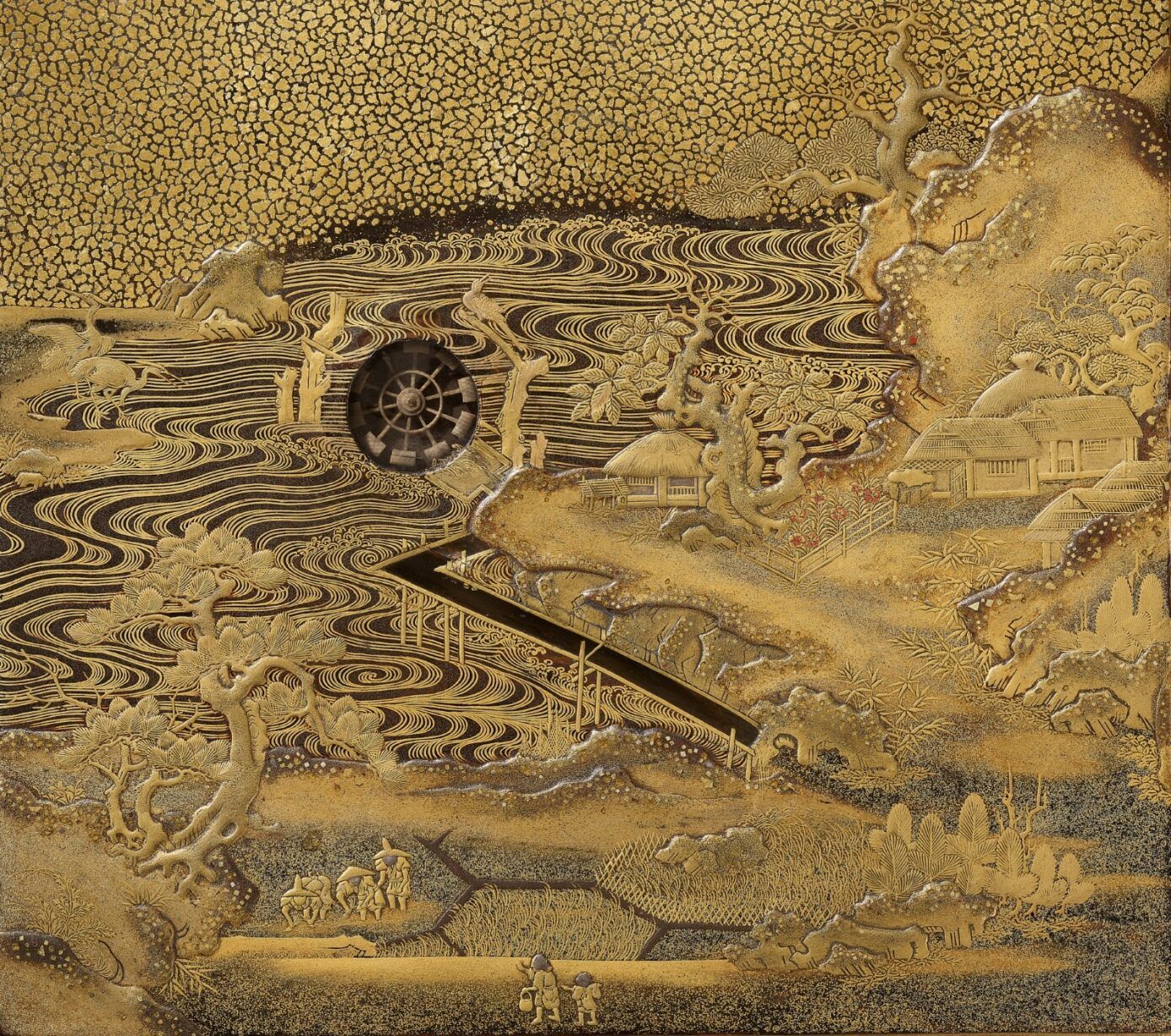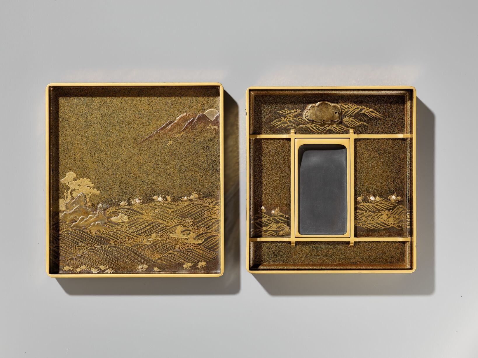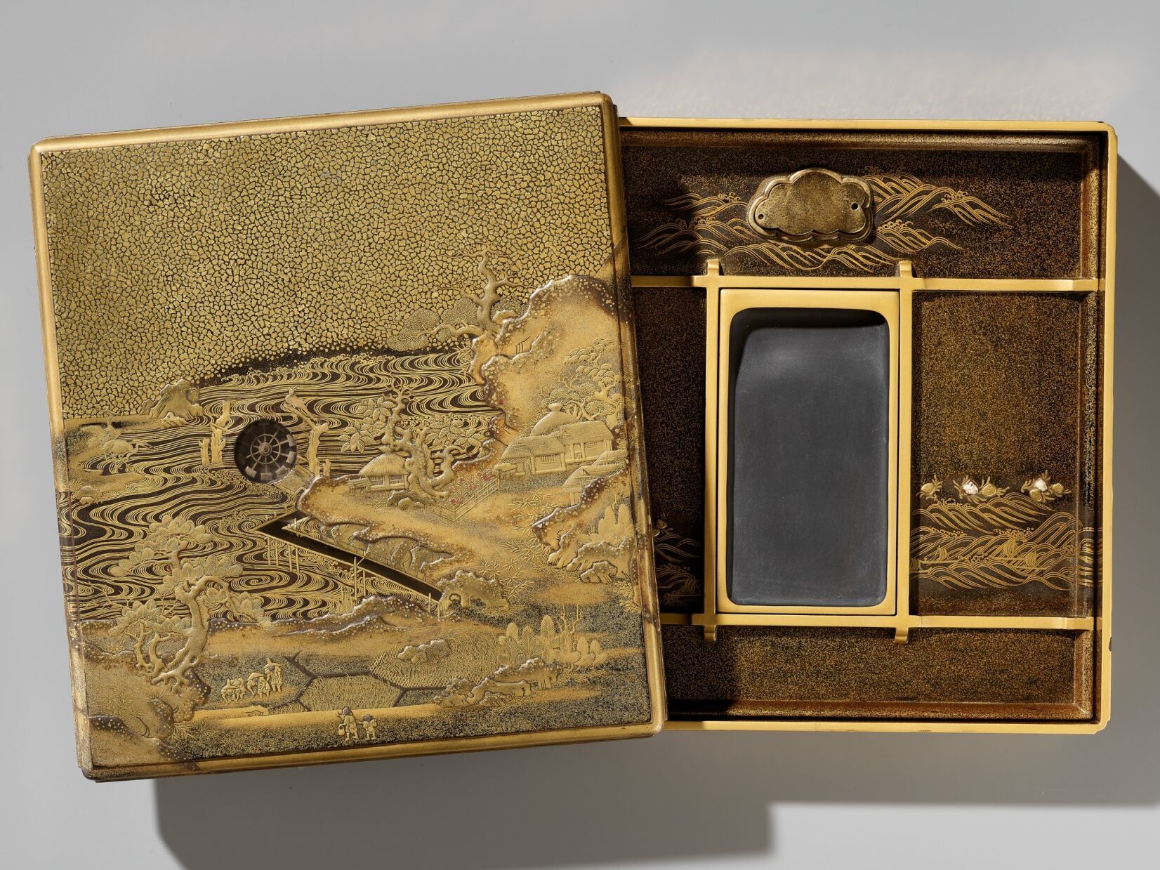 Of rectangular form with recessed gold fundame edges, bearing a superb gyobu nashiji ground finely decorated in gold, brown, and red hiramaki-e and takamaki-e with kirigane and enashiji with farmers working in rice-paddies, below a bone waterwheel and mercury waterfall contained in a cavity set into the thickness of the lid and covered with glass or crystal so that it can be tilted to make the mercury turn the waterwheel, the water running from the waterwheel through a channel onto the rice paddies, further with craggy rockwork, gnarled trees, huts and buildings and two cranes. The base and interior of rich nashiji, the interior further with gold fundame edges, the cover similarly decorated with a bird perched on a rocky outcrop over two ducks swimming in the gushing water with sailing boats and lined with clam shells, the bird and some of the shells subtly inlaid with glazed ceramic, all below mountains in the background, the roaring sea with boats and shells repeated on the removable ita (baseboard) fitted with a cloud-form gilt-metal waterdropper (suiteki) and rectangular slate inkstone (suzuri).