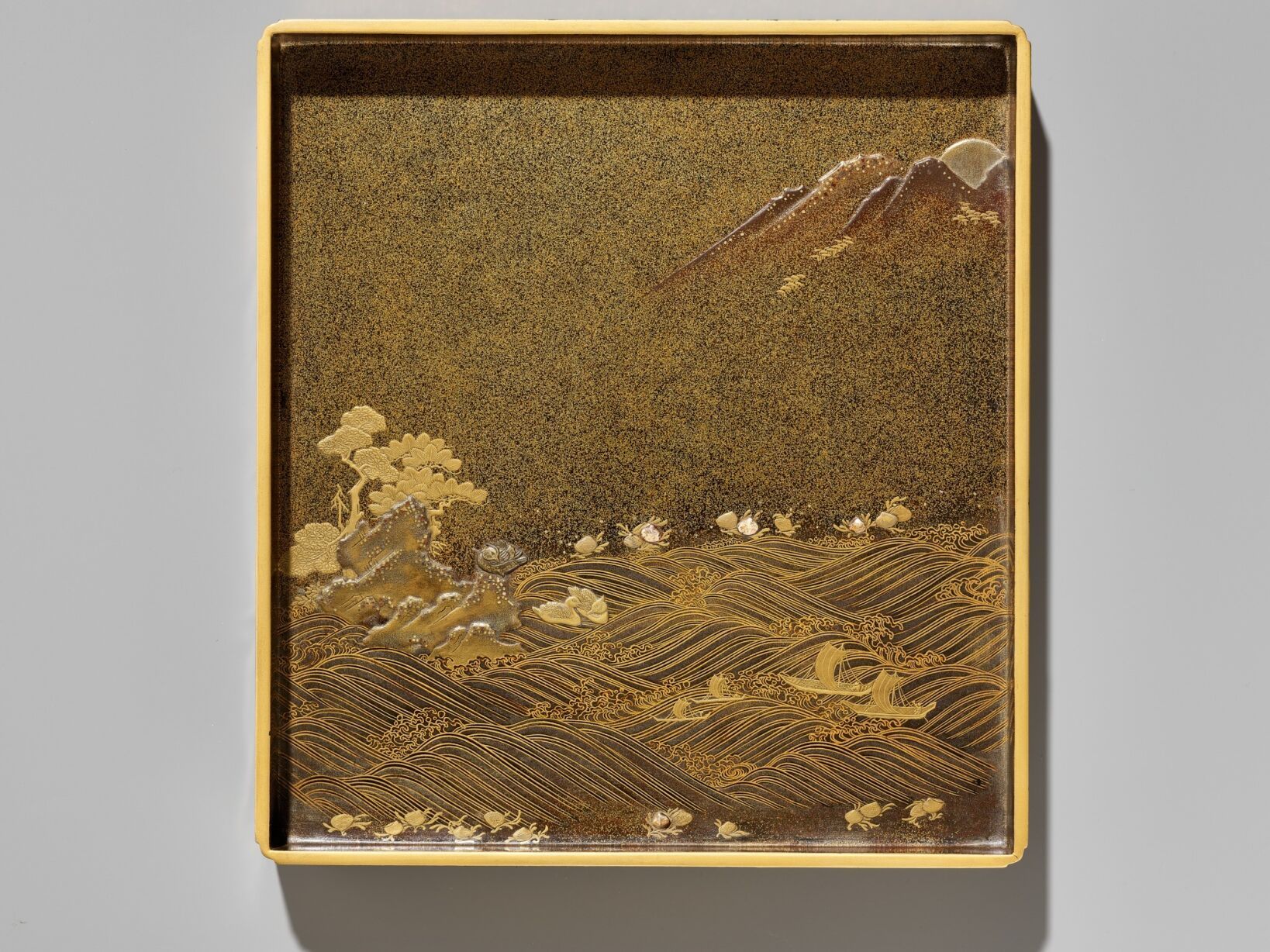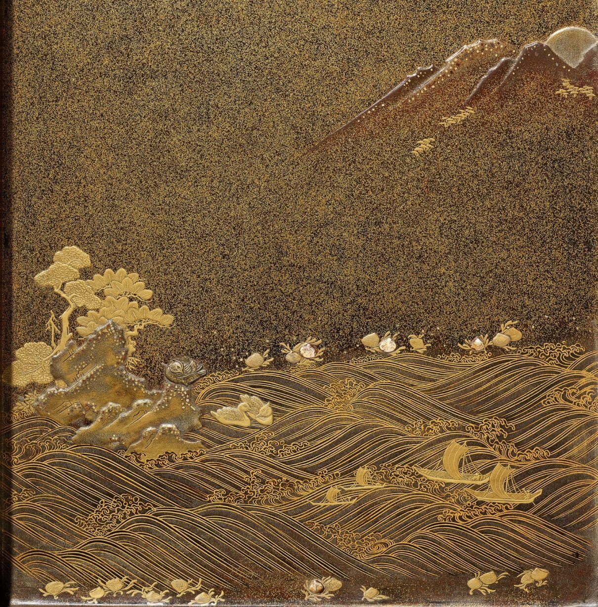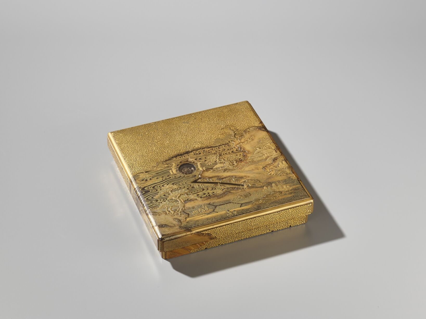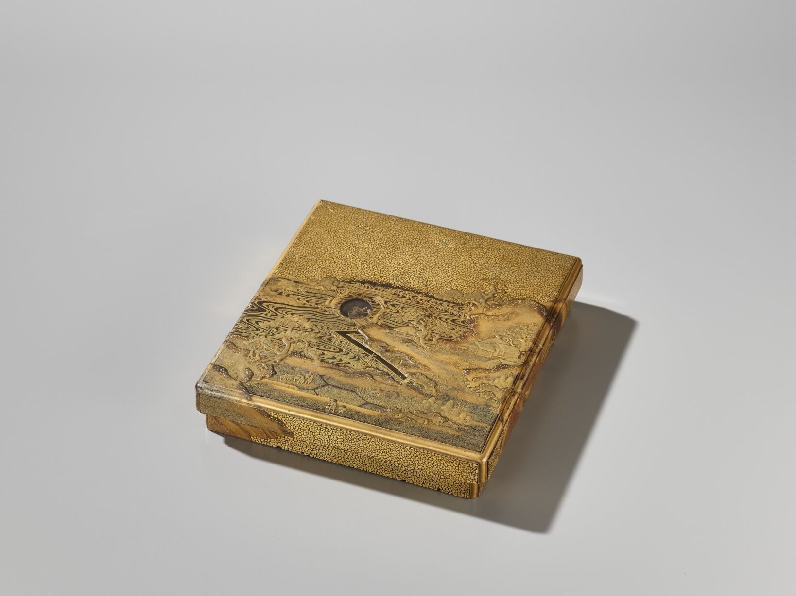 Of rectangular form with recessed gold fundame edges, bearing a superb gyobu nashiji ground finely decorated in gold, brown, and red hiramaki-e and takamaki-e with kirigane and enashiji with farmers working in rice-paddies, below a bone waterwheel and mercury waterfall contained in a cavity set into the thickness of the lid and covered with glass or crystal so that it can be tilted to make the mercury turn the waterwheel, the water running from the waterwheel through a channel onto the rice paddies, further with craggy rockwork, gnarled trees, huts and buildings and two cranes. The base and interior of rich nashiji, the interior further with gold fundame edges, the cover similarly decorated with a bird perched on a rocky outcrop over two ducks swimming in the gushing water with sailing boats and lined with clam shells, the bird and some of the shells subtly inlaid with glazed ceramic, all below mountains in the background, the roaring sea with boats and shells repeated on the removable ita (baseboard) fitted with a cloud-form gilt-metal waterdropper (suiteki) and rectangular slate inkstone (suzuri).
