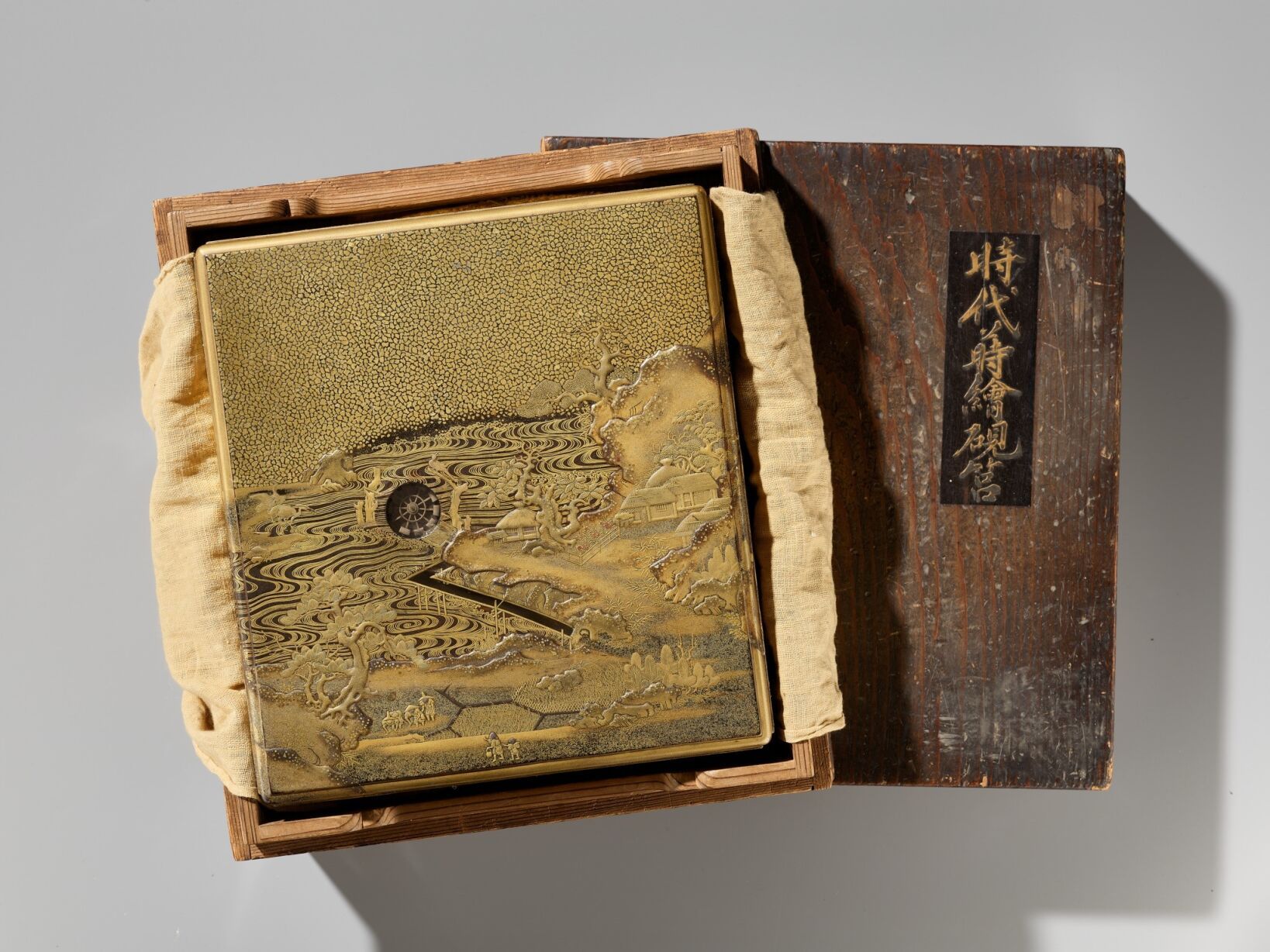 With an old wood tomobako inscribed to the lid Jidai makie suzuribako (‘An old period piece, lacquer writing box’), and a protective cloth.