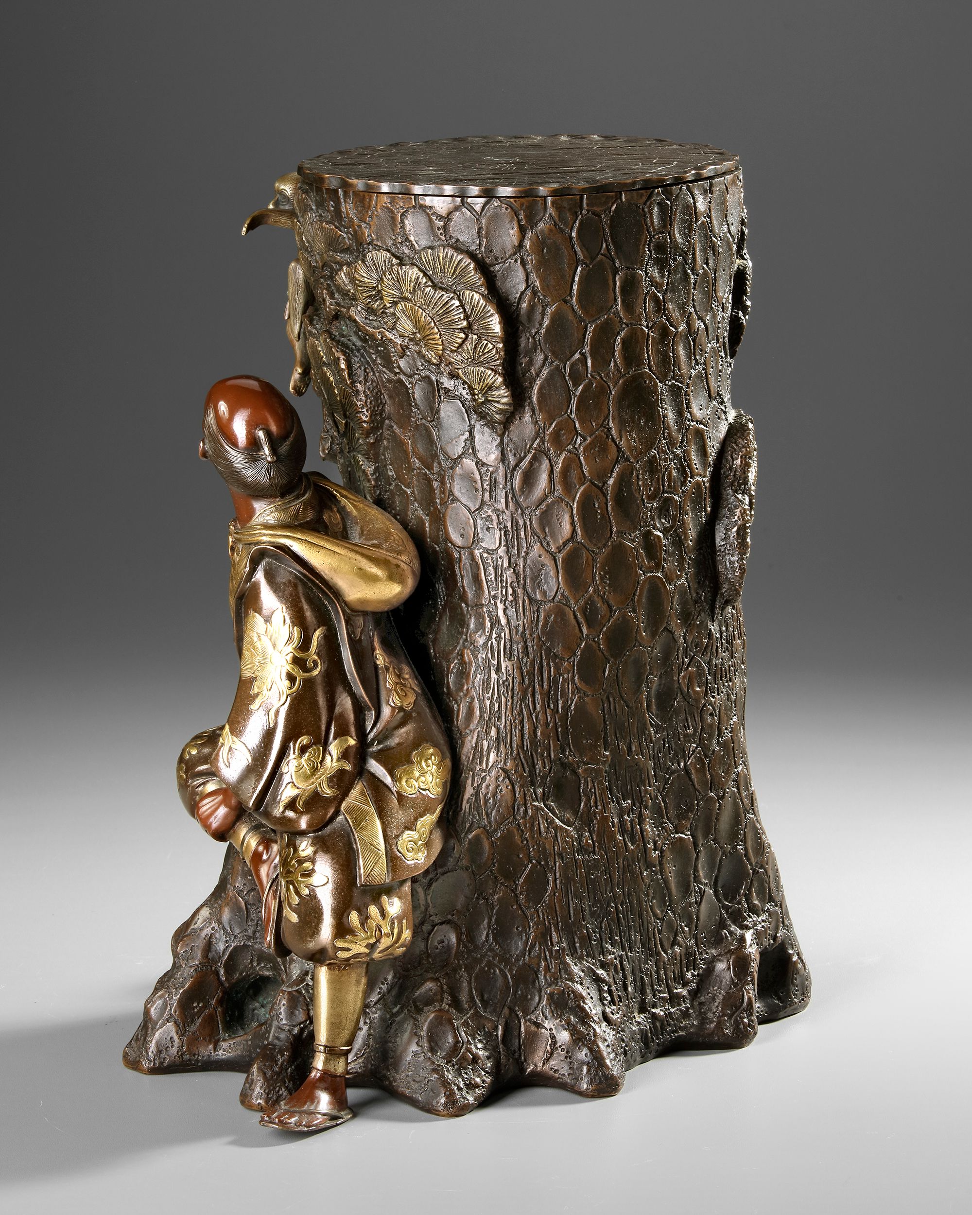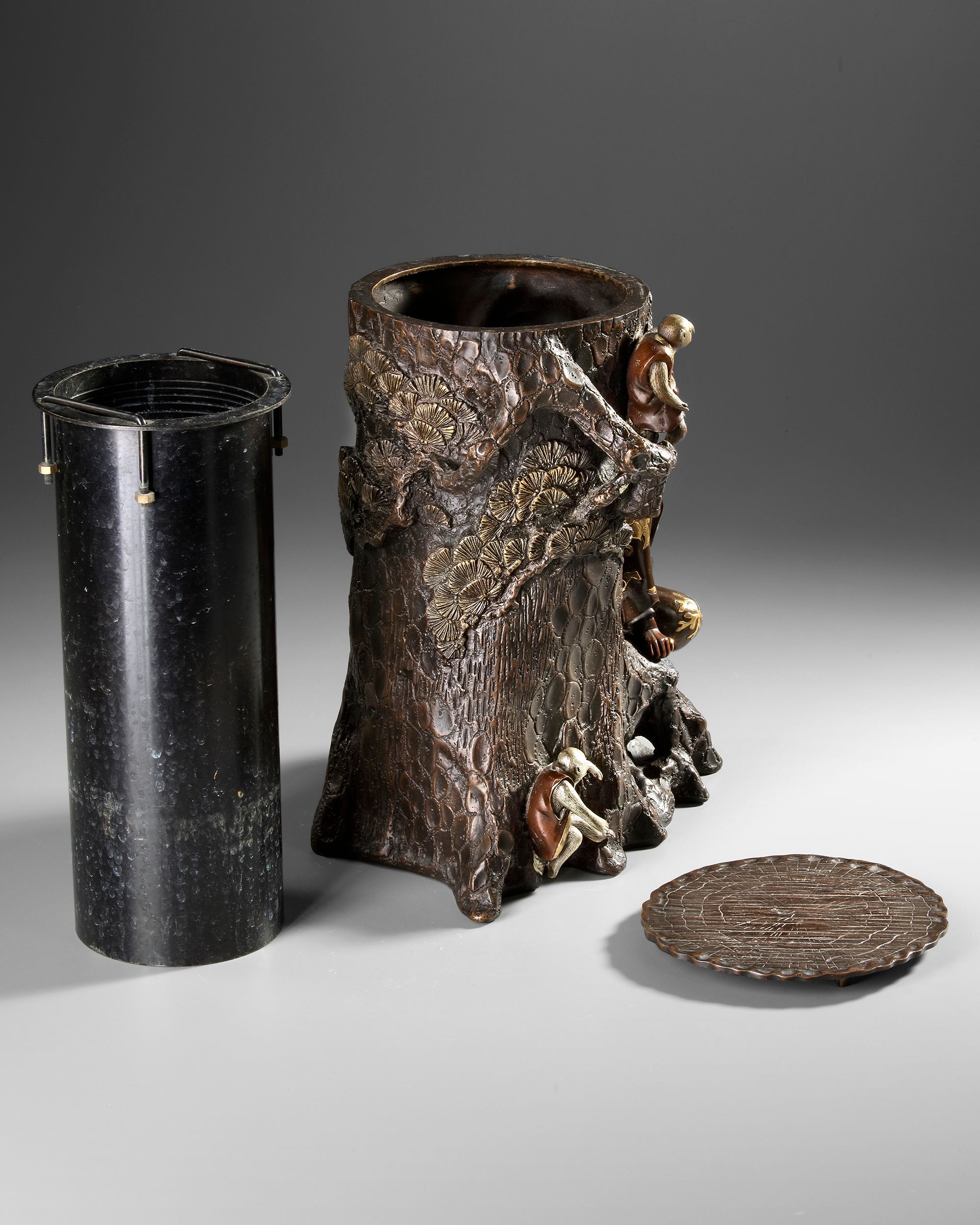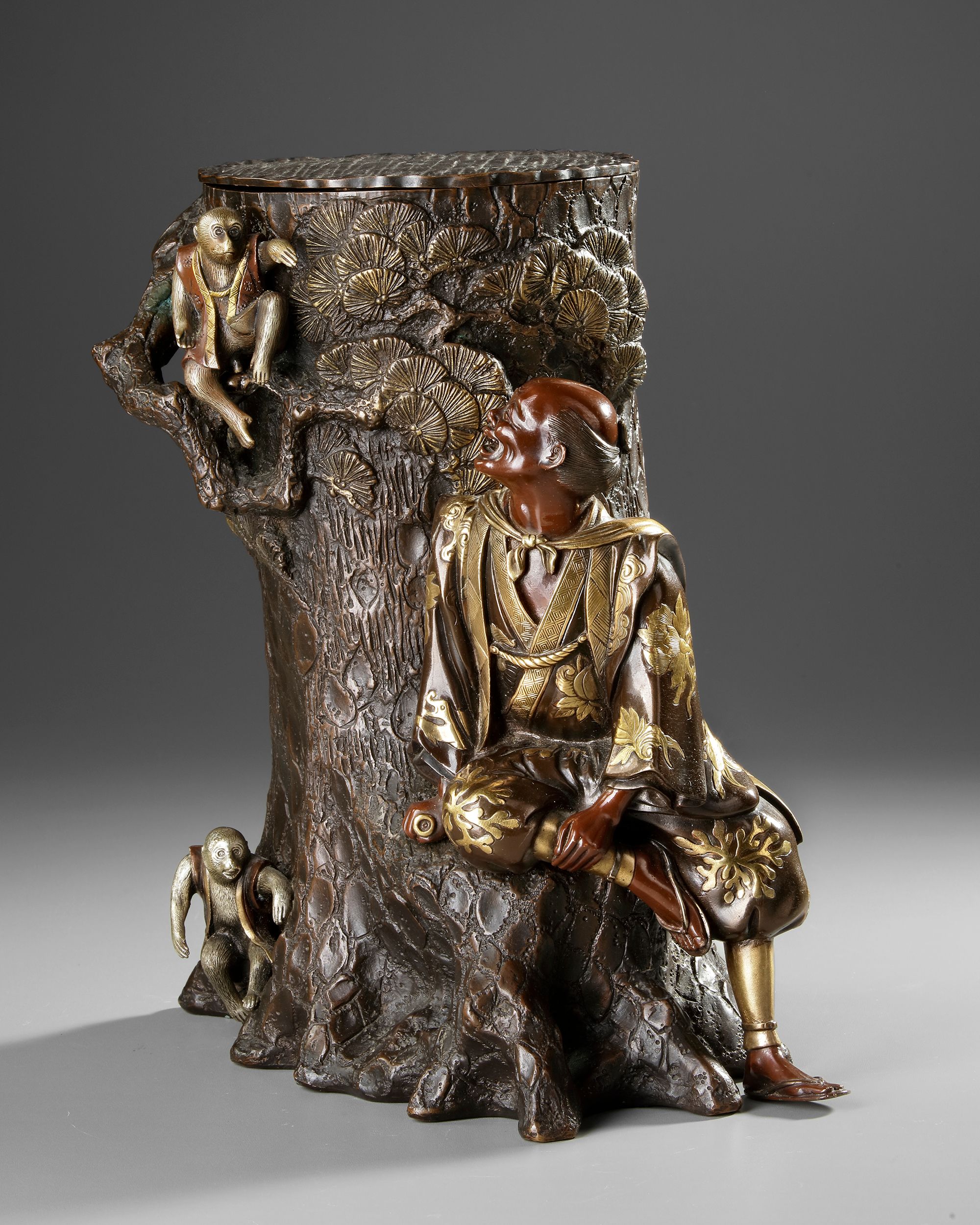 A fine gilded bronze sculpture of a man sitting on the side of a tree playing with two monkeys. Inside the tree is a removable vase. Height 36.5 cm.