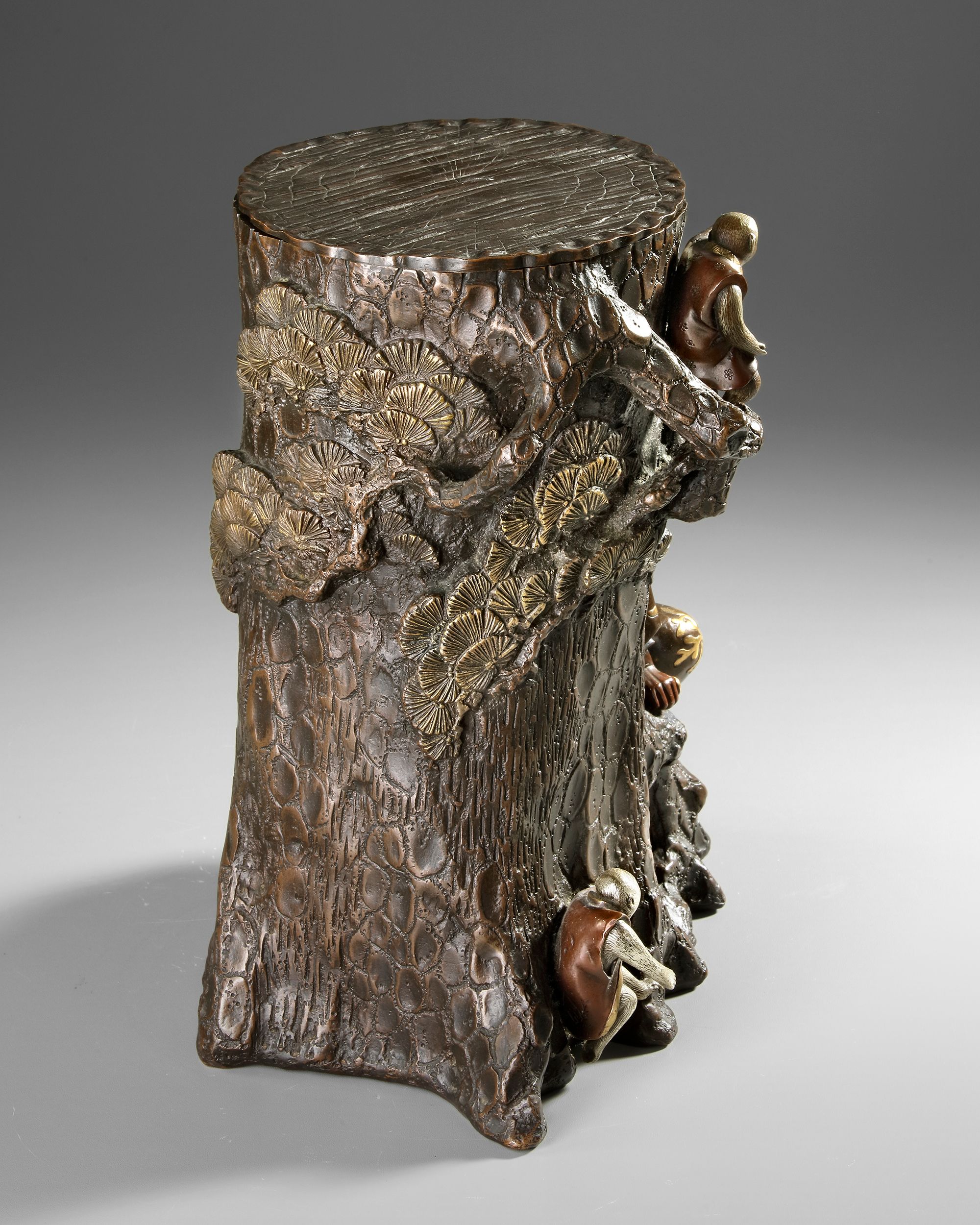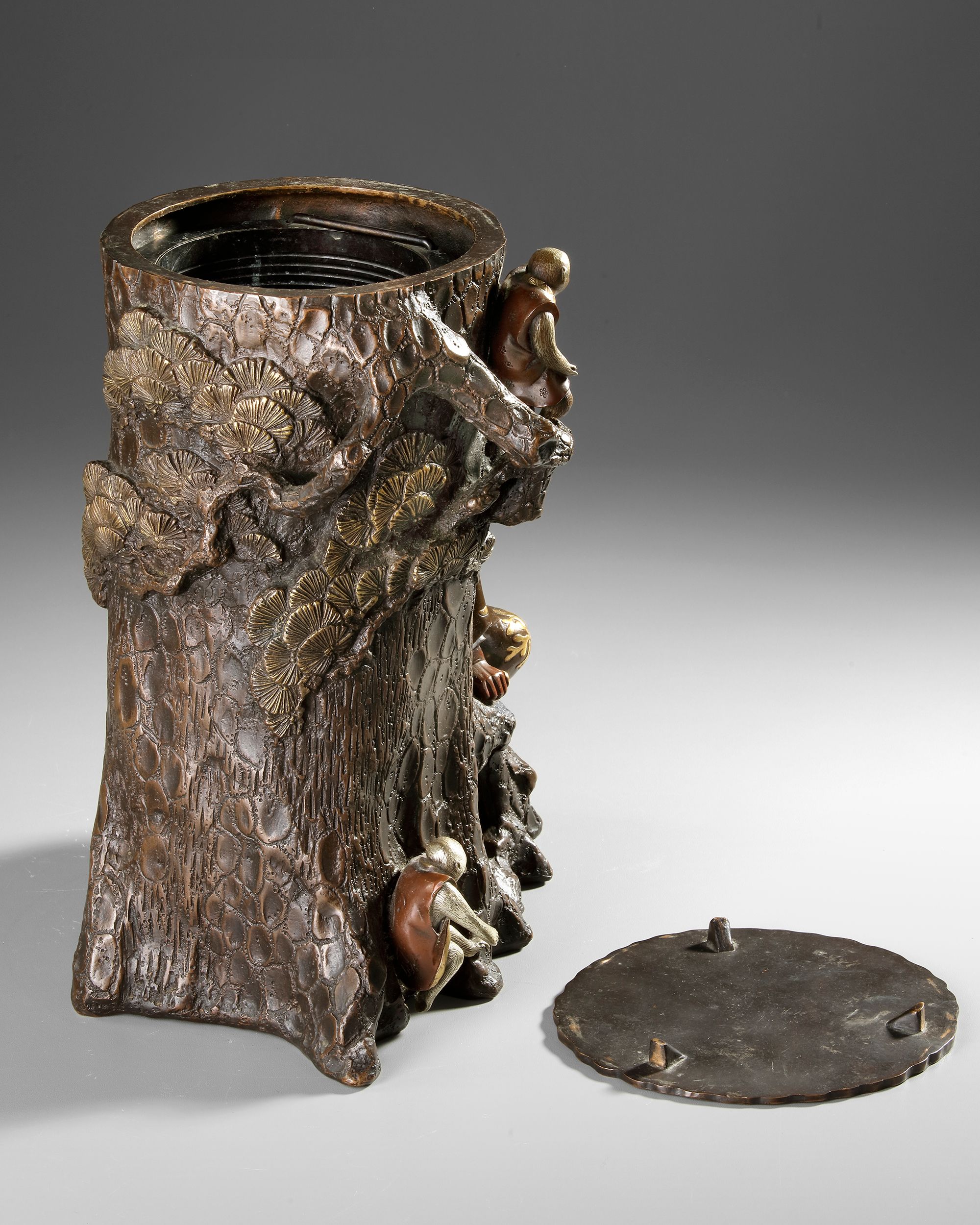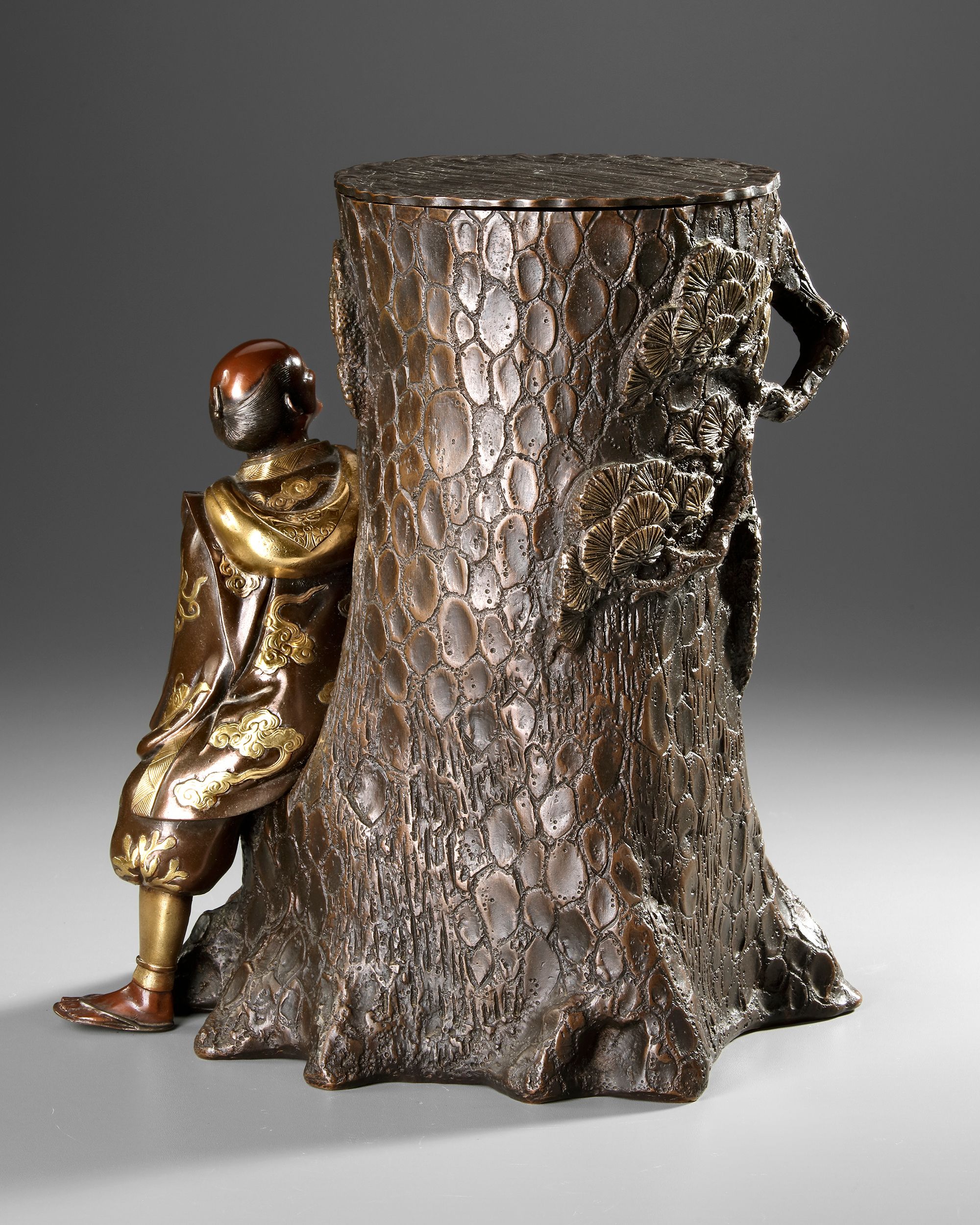A fine gilded bronze sculpture of a man sitting on the side of a tree playing with two monkeys. Inside the tree is a removable vase. Height 36.5 cm.
