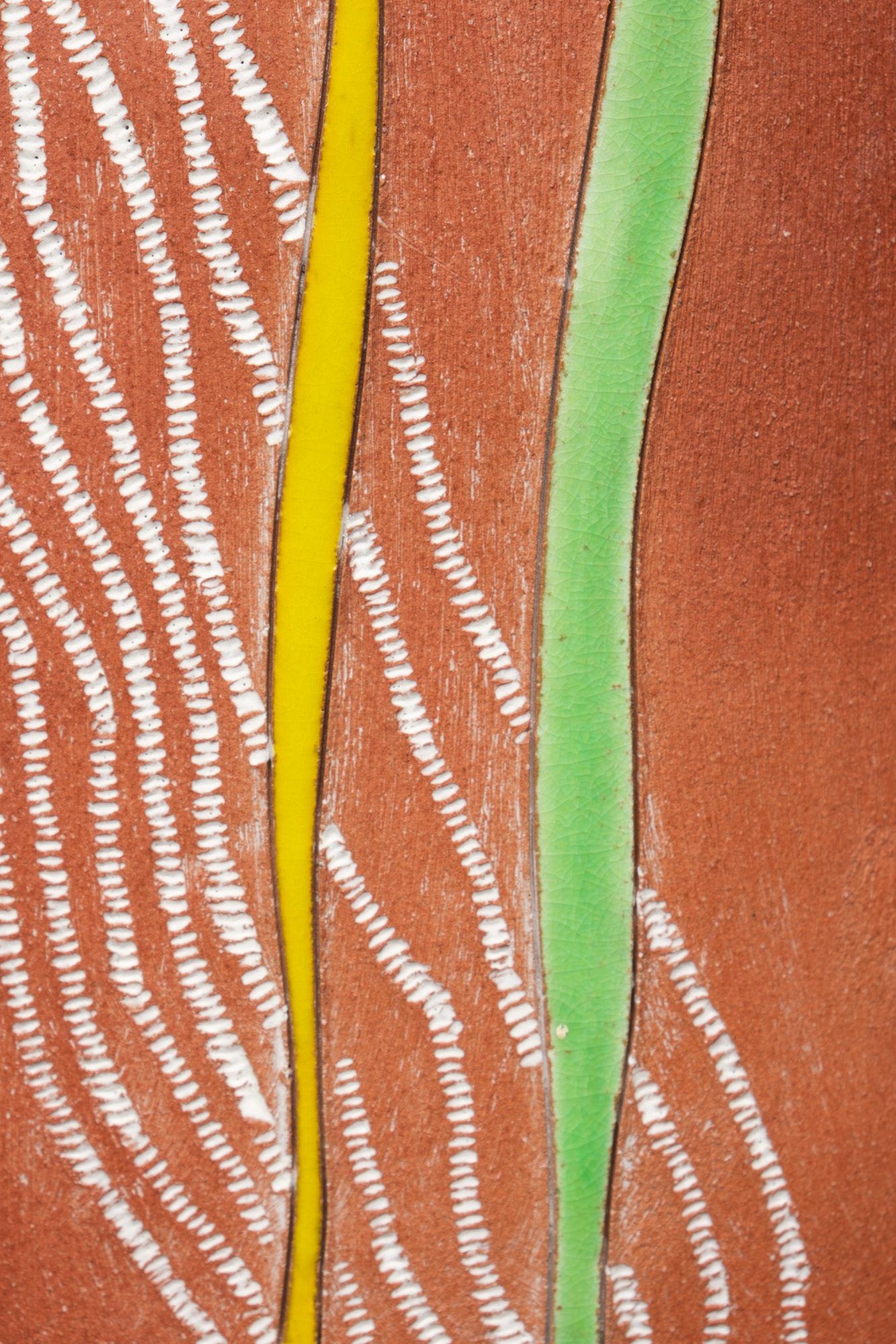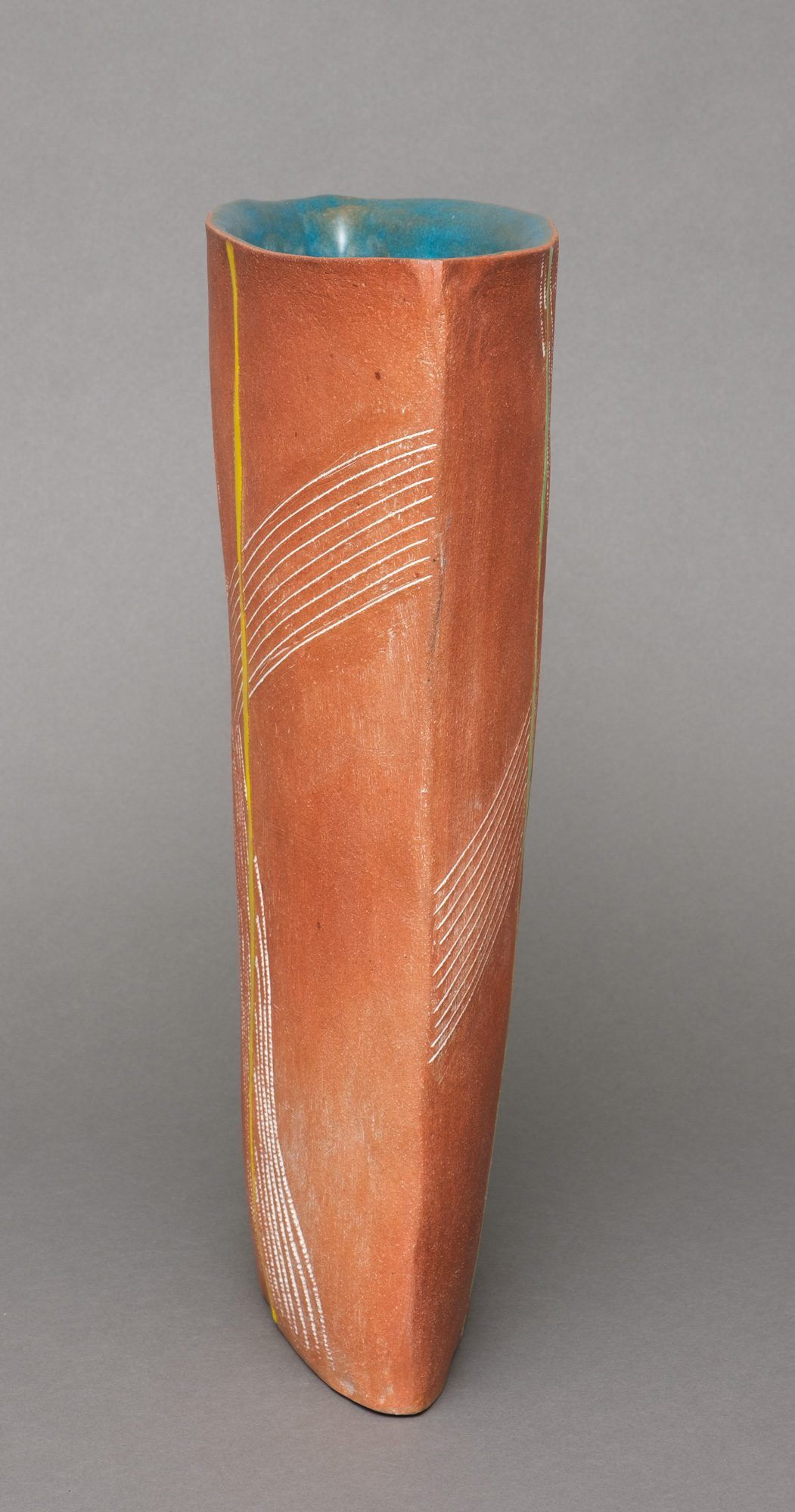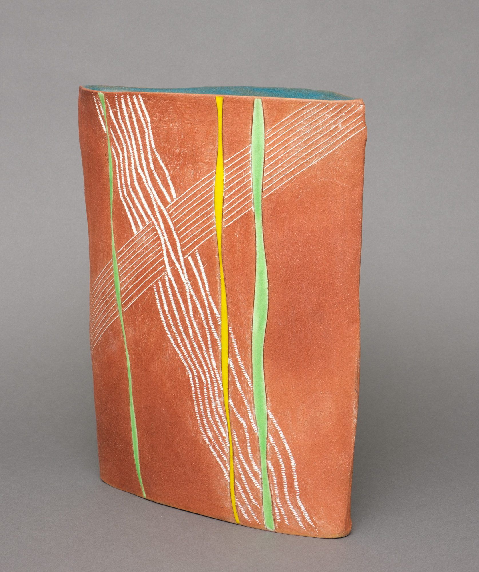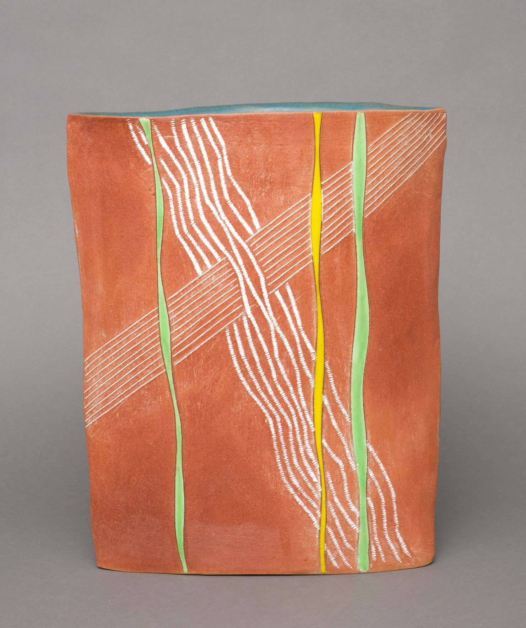 Attractive red stoneware vase with an abstract line design executed in yellow, green and white glaze.