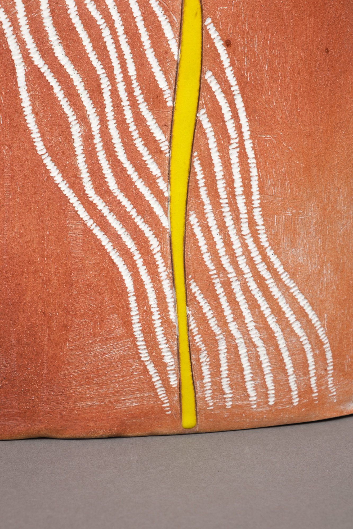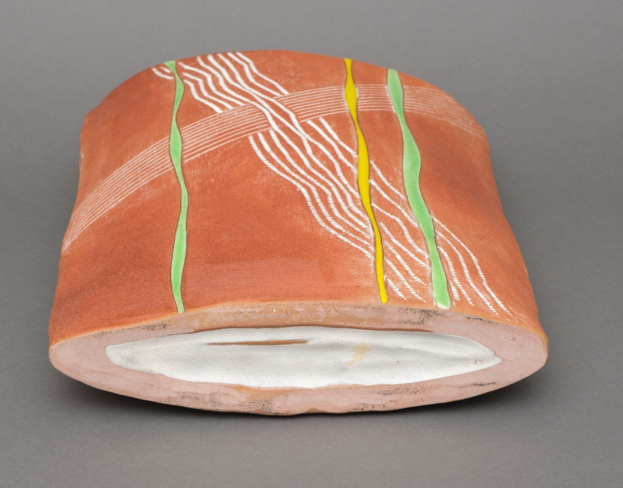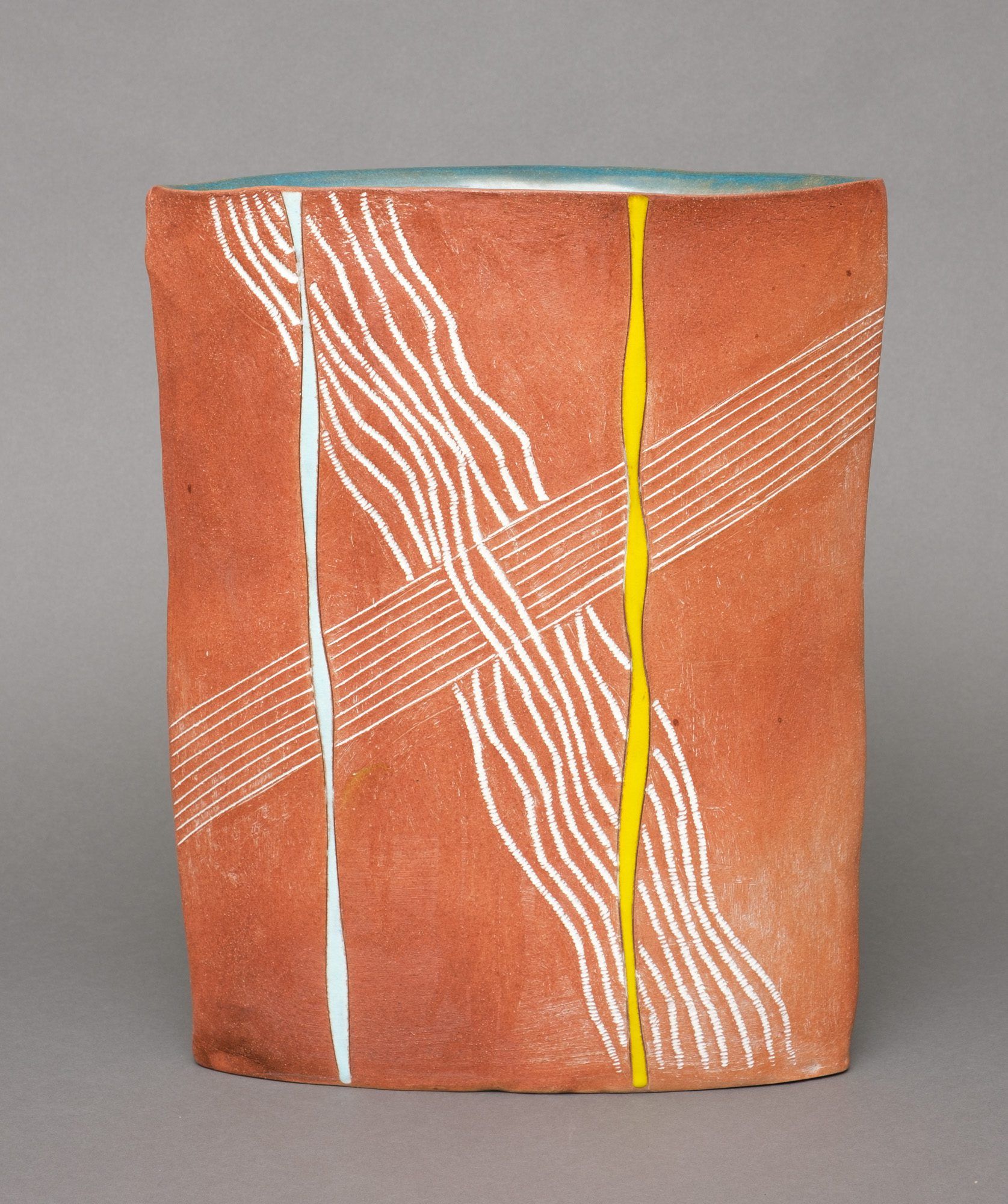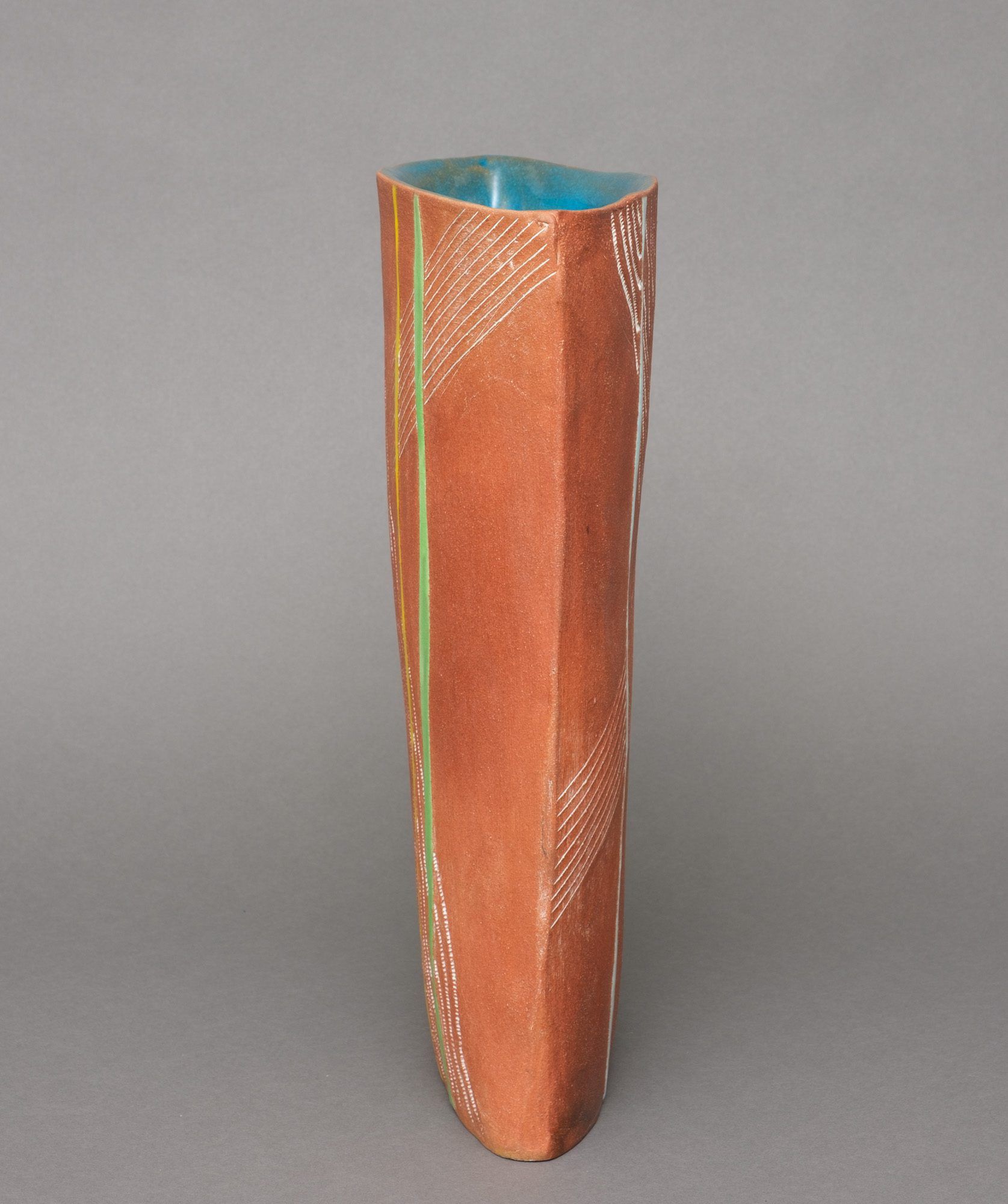 Attractive red stoneware vase with an abstract line design executed in yellow, green and white glaze.