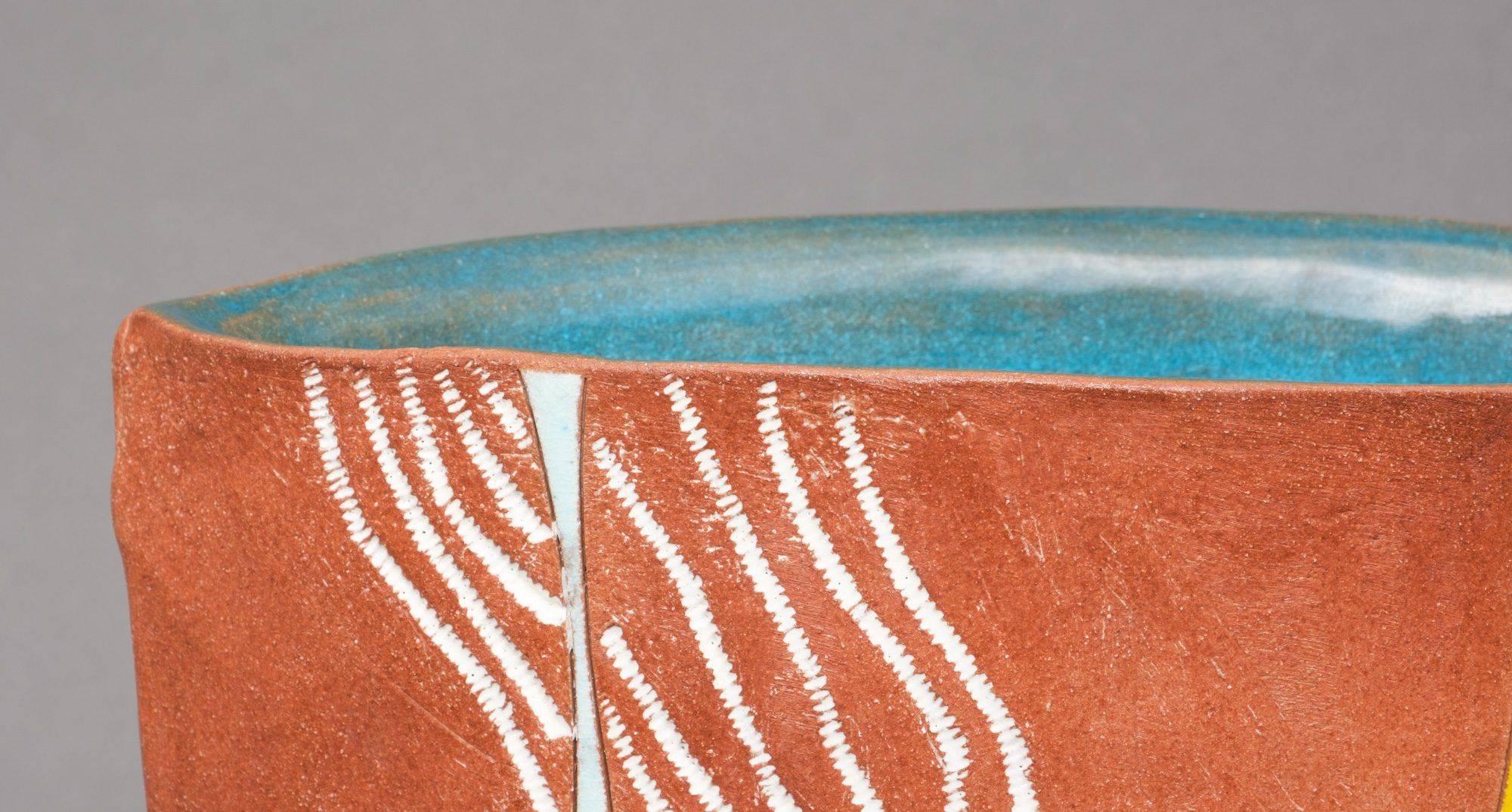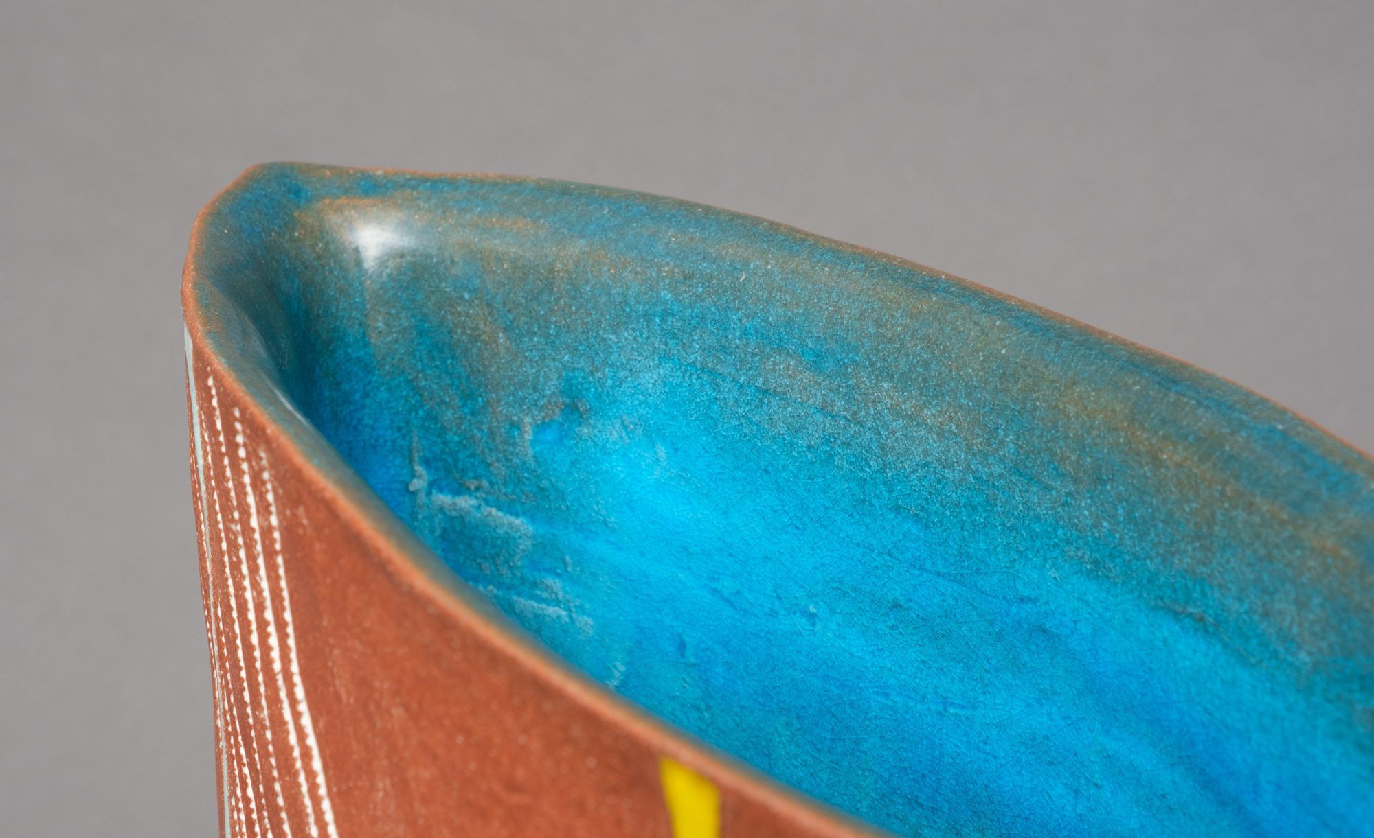 The rectangular surfaces together form a navette-shaped mouth. The interior is finished with a blue craquelé glaze.