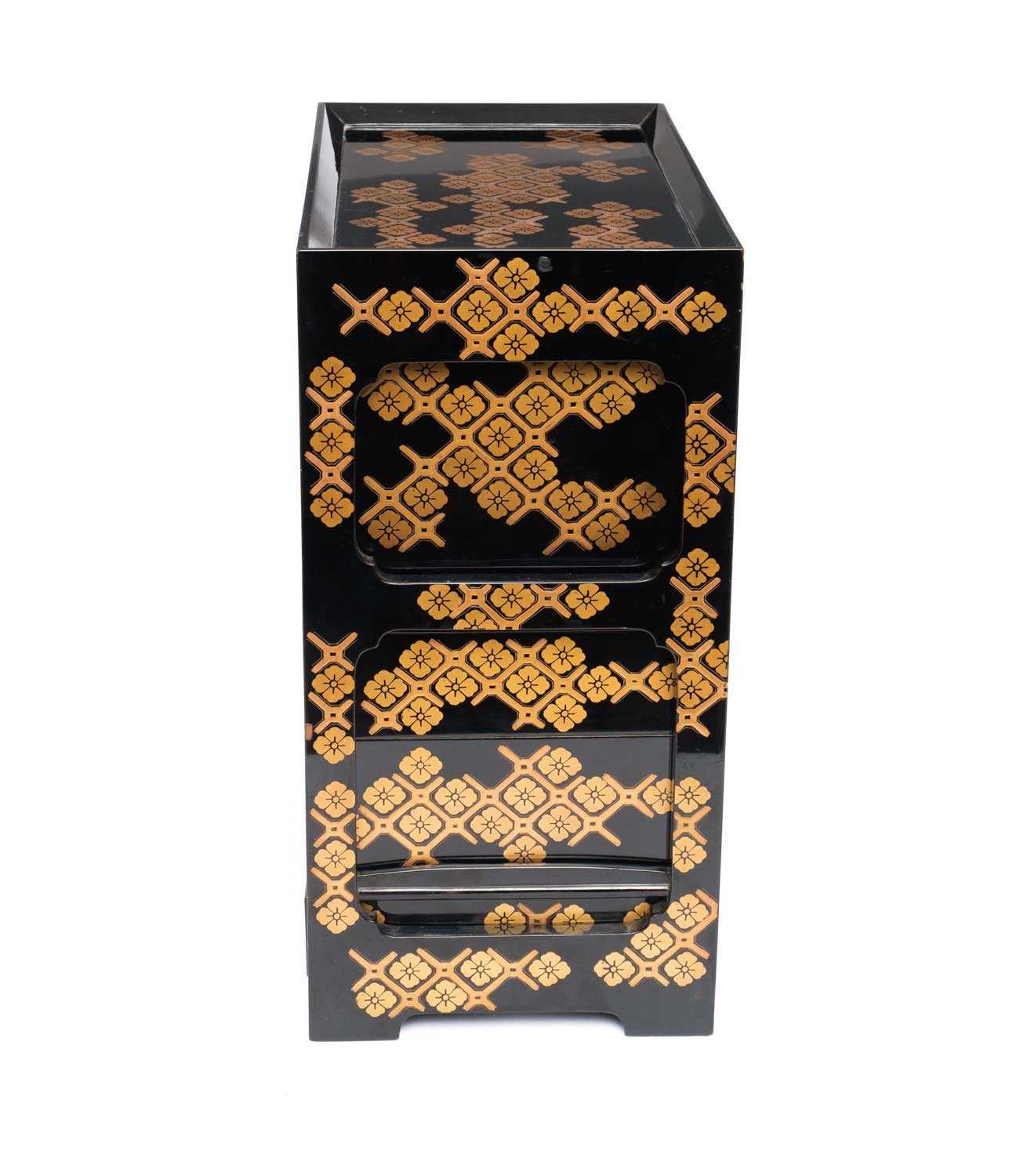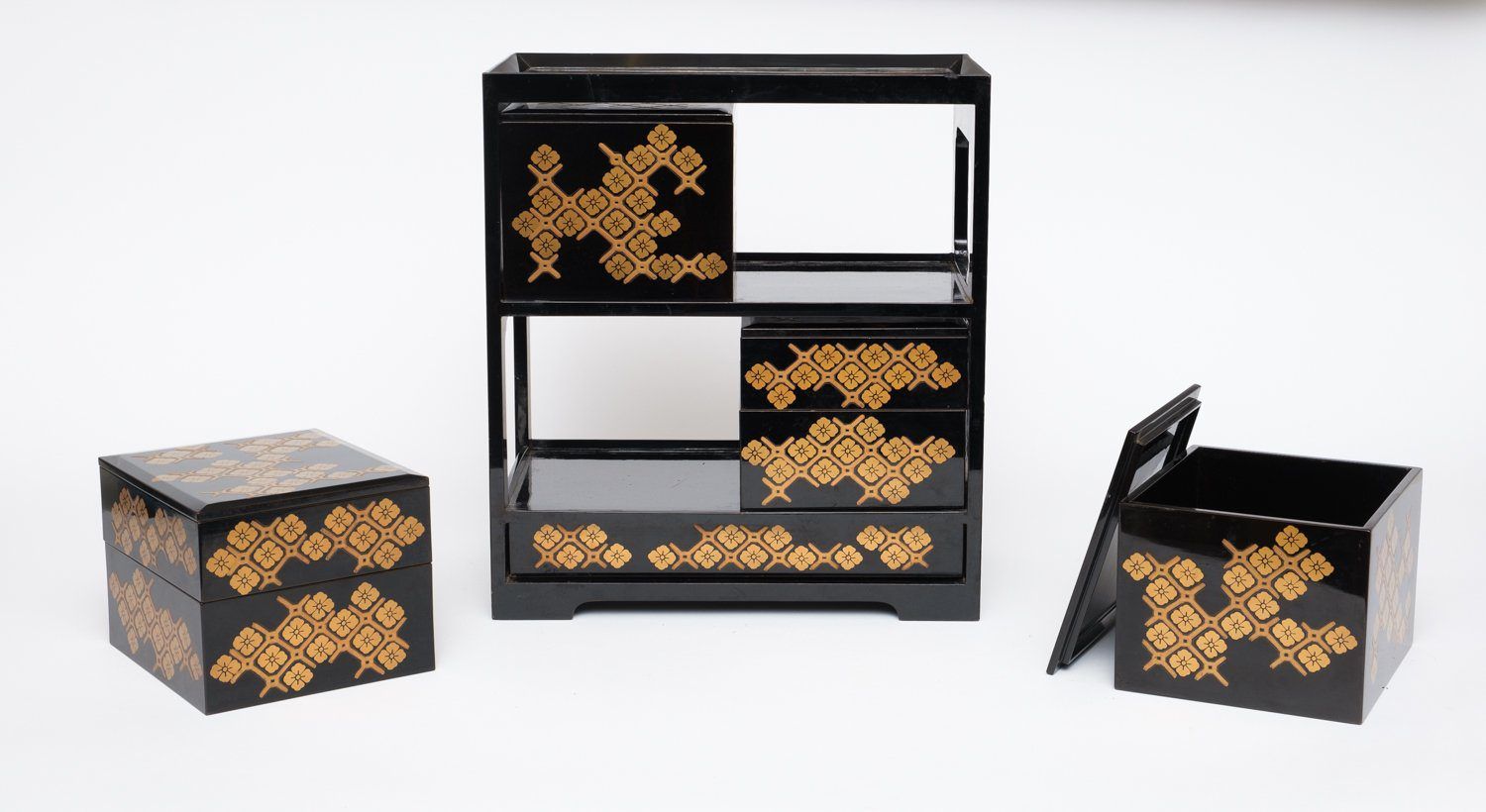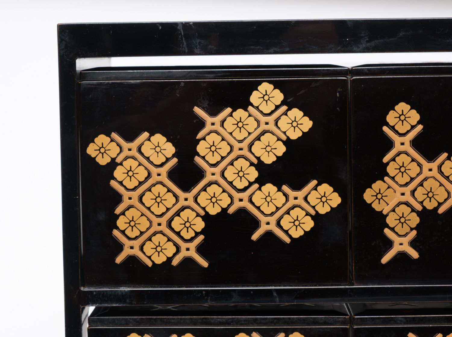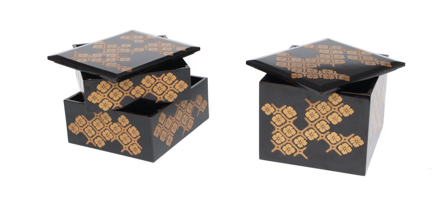 Marvelous black lacquered 蝋色漆 (roiro’urushi) sage’jûbako 提げ重箱 (multi-tiered food boxes/picnic box that can be carried by hand) with a fantastic hiramaki-e 平蒔絵 (low-relief design) and takamaki-e 高蒔絵 (high-relief design) design of flowers and lines.