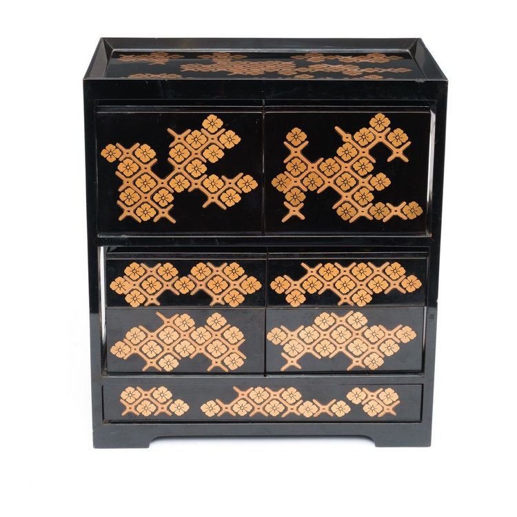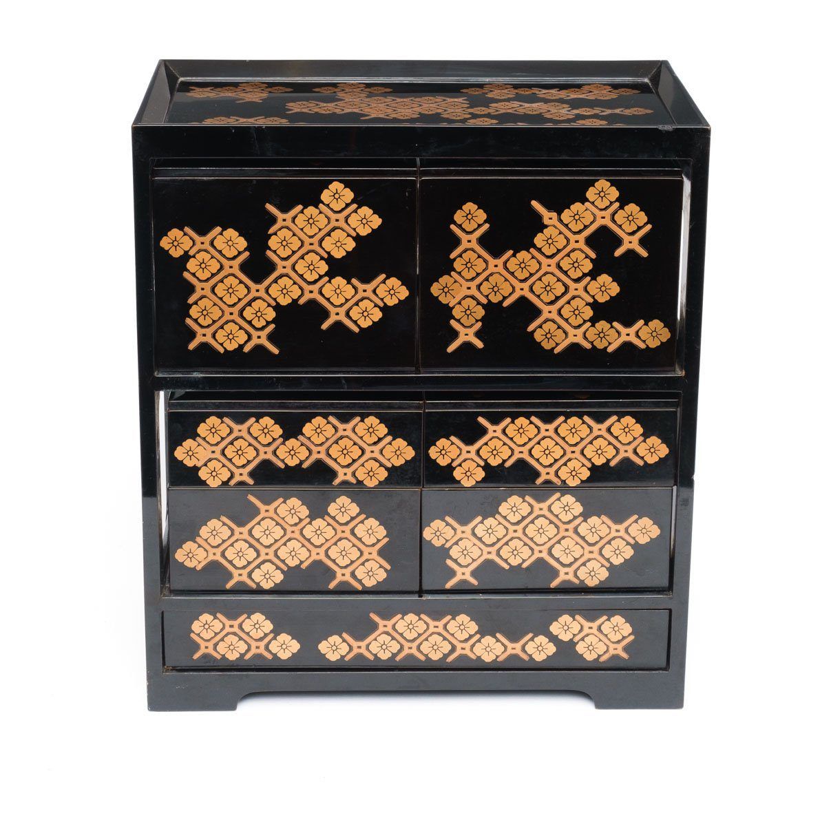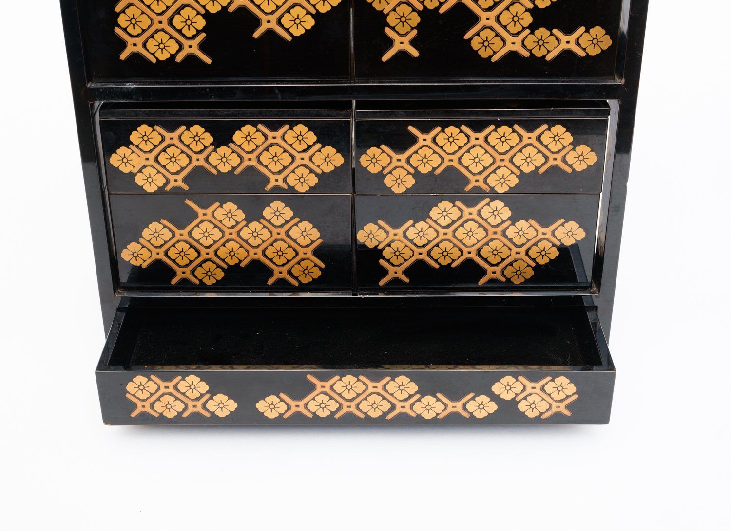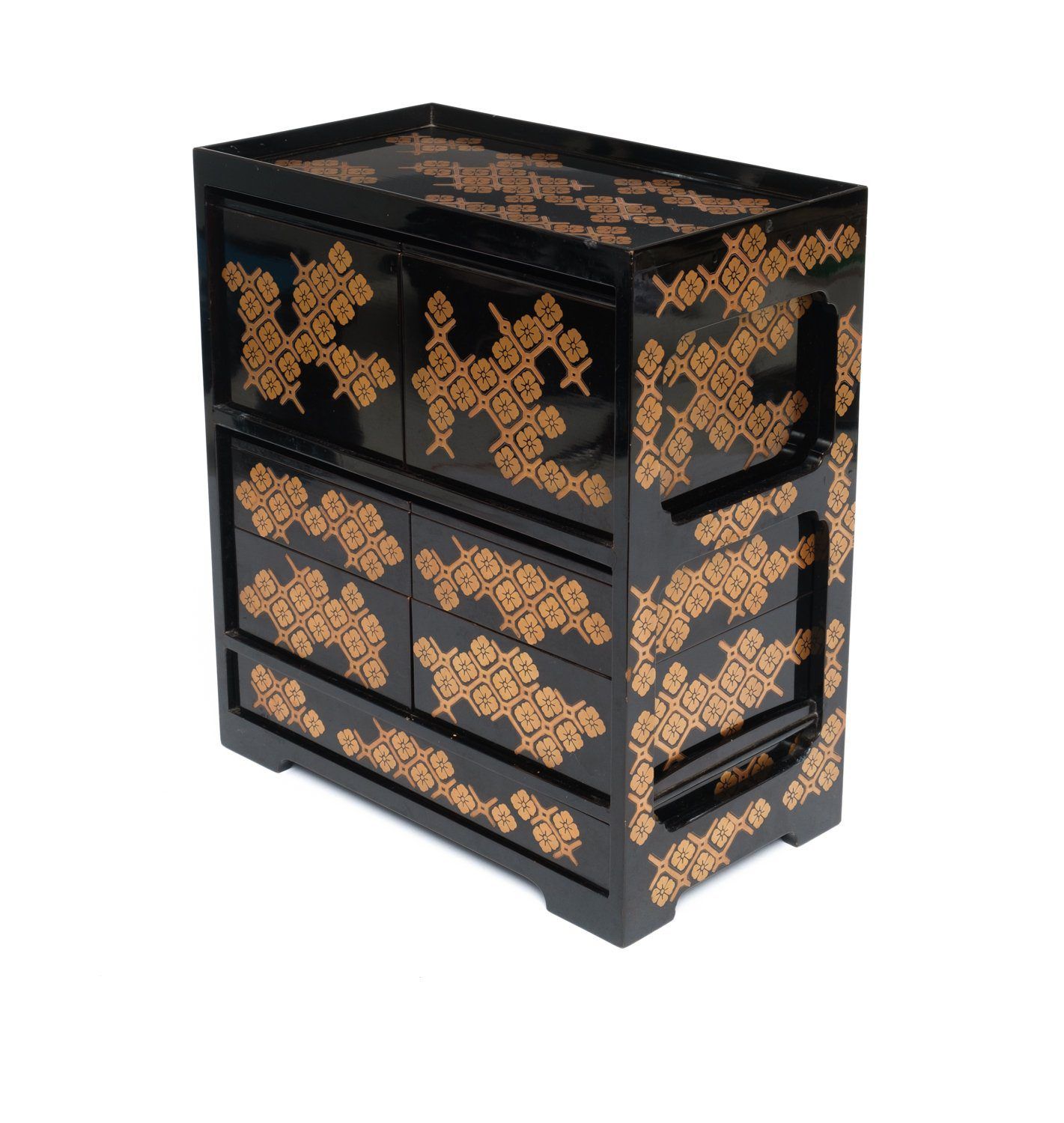 Marvelous black lacquered 蝋色漆 (roiro’urushi) sage’jûbako 提げ重箱 (multi-tiered food boxes/picnic box that can be carried by hand) with a fantastic hiramaki-e 平蒔絵 (low-relief design) and takamaki-e 高蒔絵 (high-relief design) design of flowers and lines.