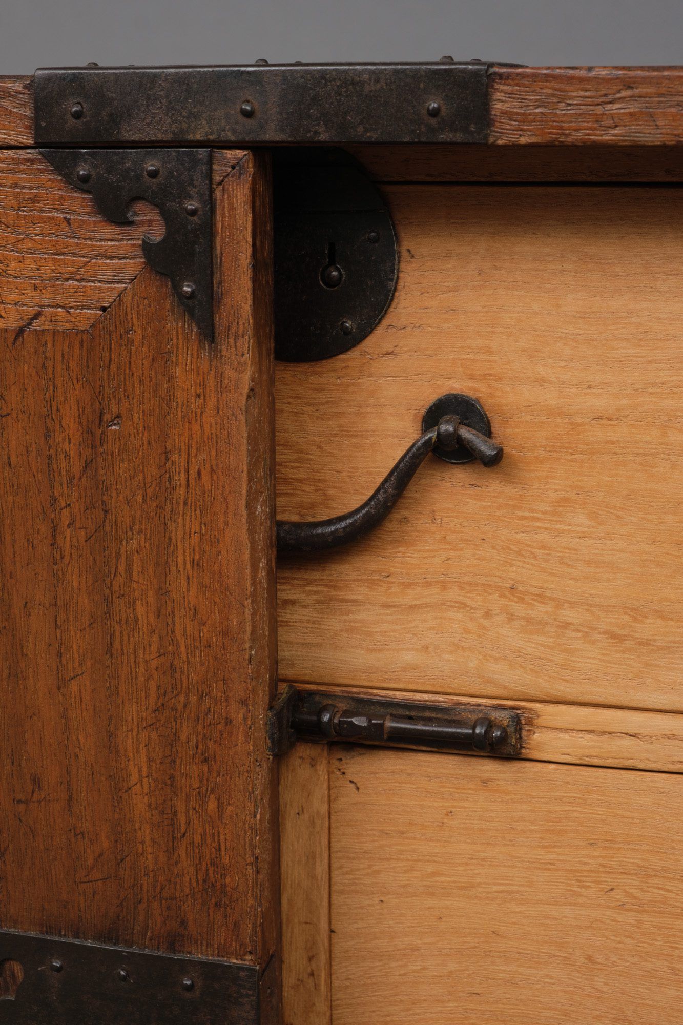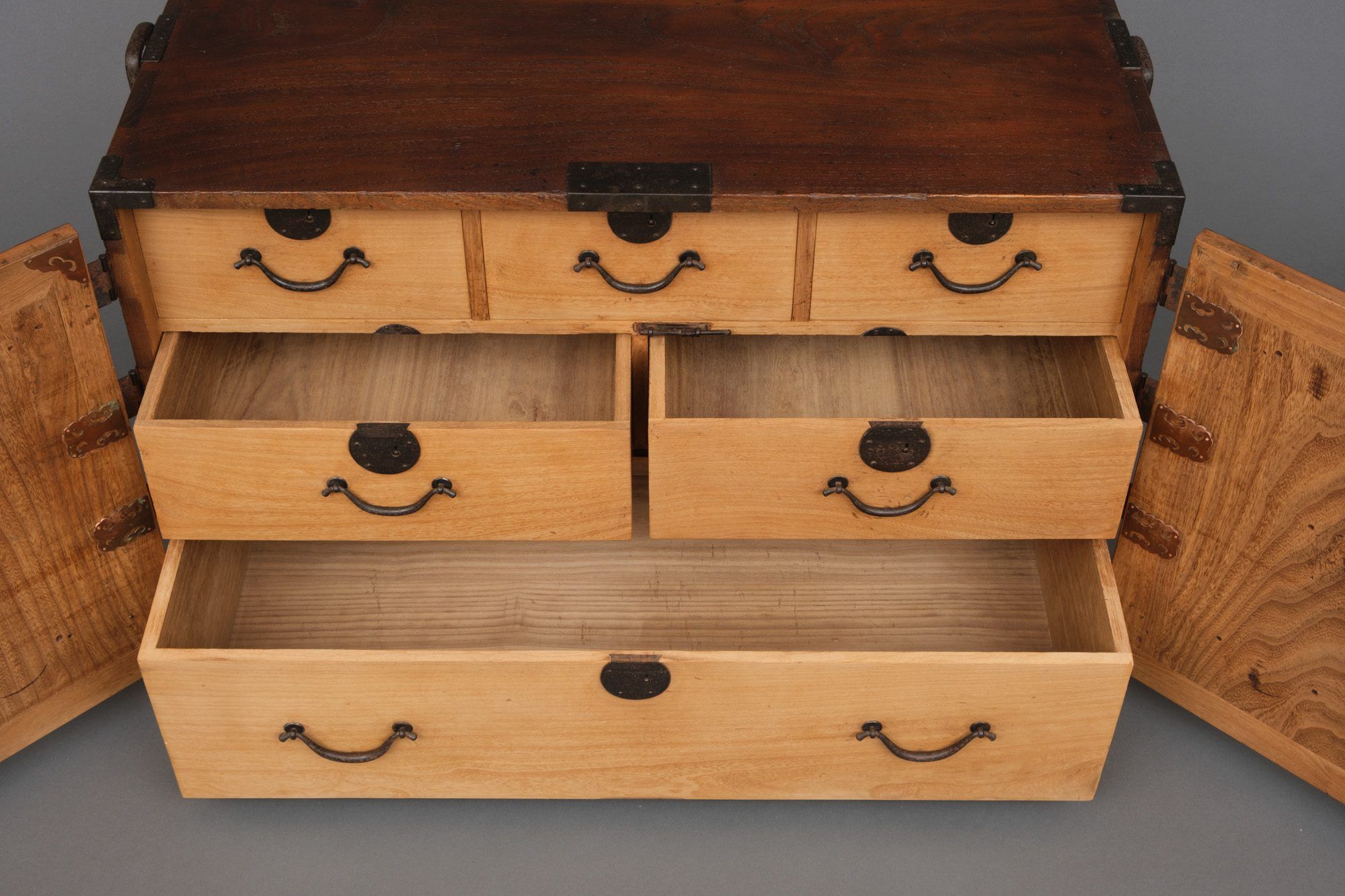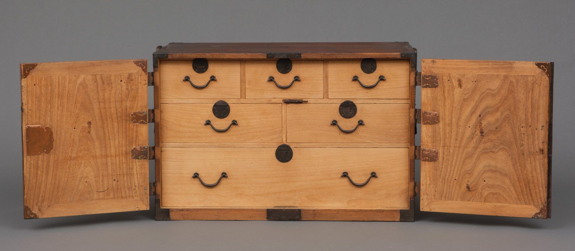 The doors open to an interior with six drawers of different shape. They are equipped with circular iron lock plates and ‘hirute’-shaped bail handles.