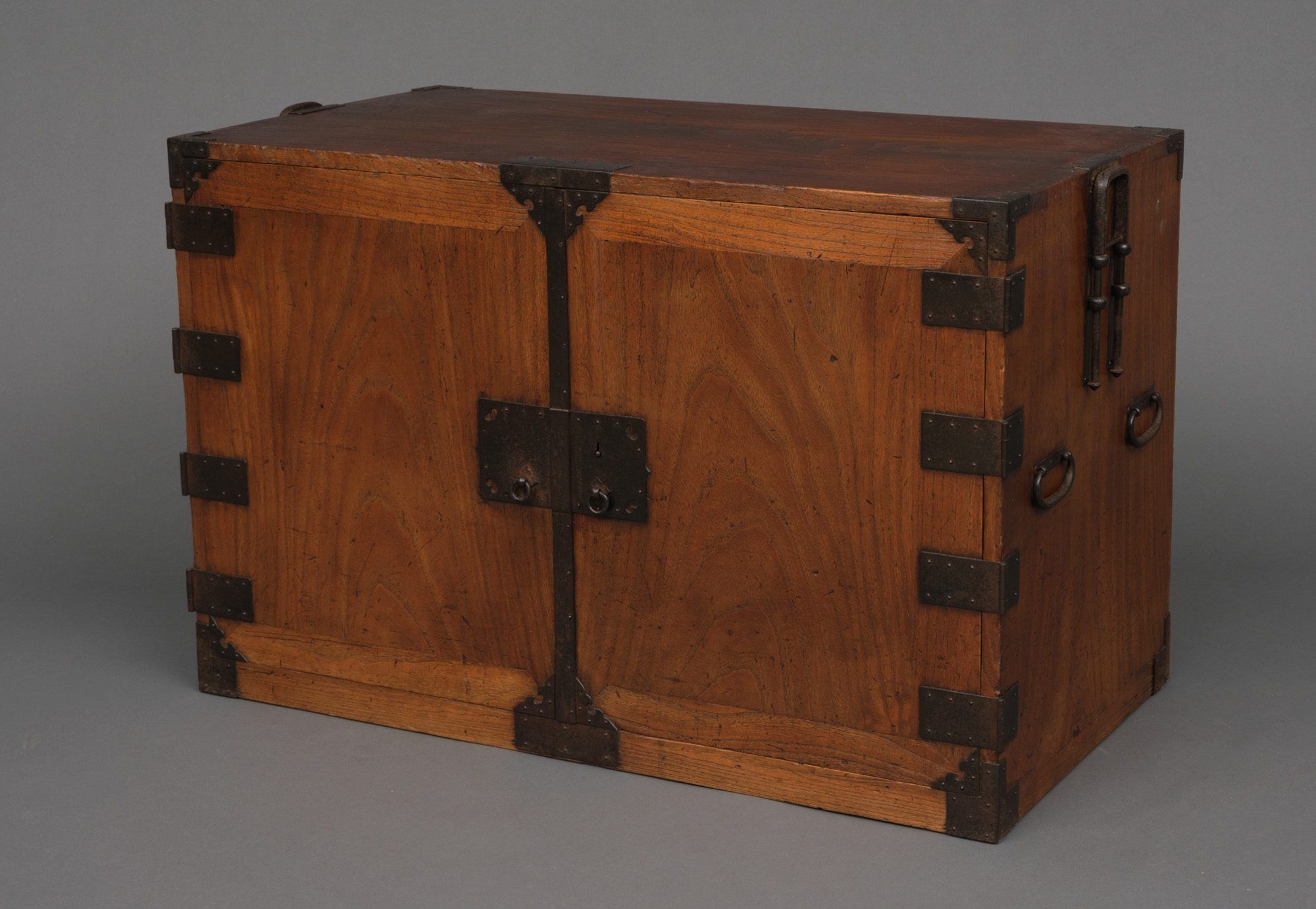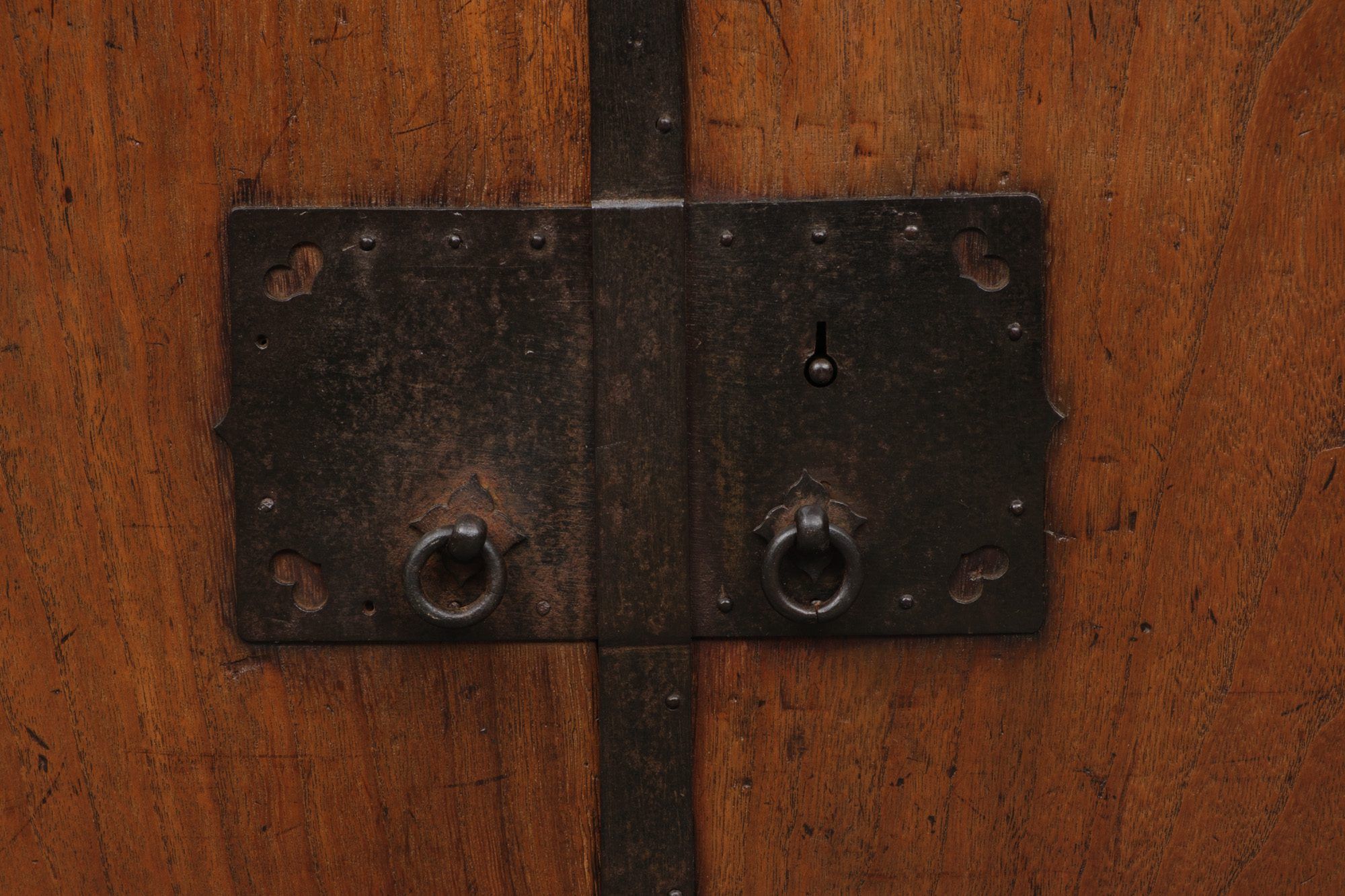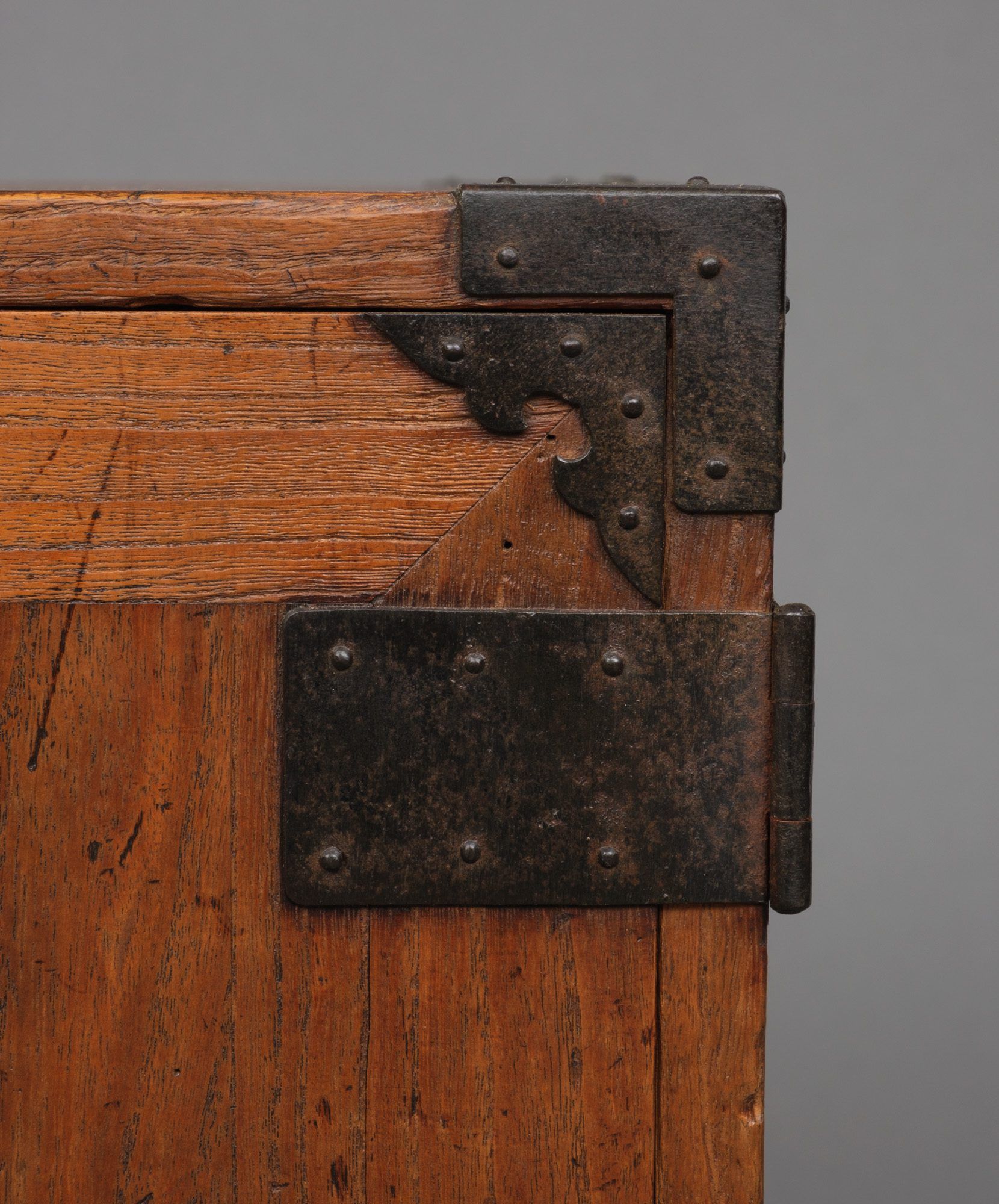 The doors open to an interior with six drawers of different shape. They are equipped with circular iron lock plates and ‘hirute’-shaped bail handles.