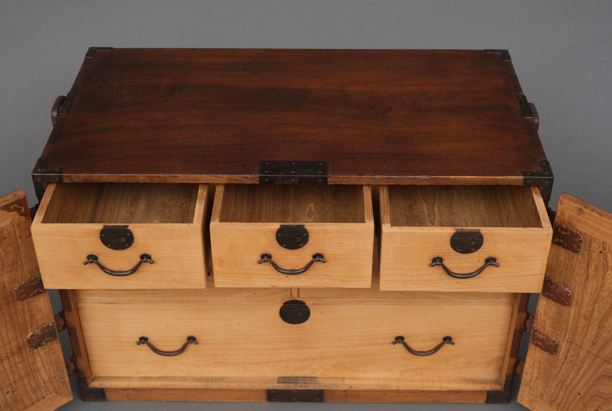 The chôba’dansu is in a very good restored condition with some minimal traces of age. The drawers run very smoothly. The cabinet is deep so there is a lot of volume for easy storage. One key included working on the door lock. The key functions in the old fashioned Japanese way, not very smooth.
