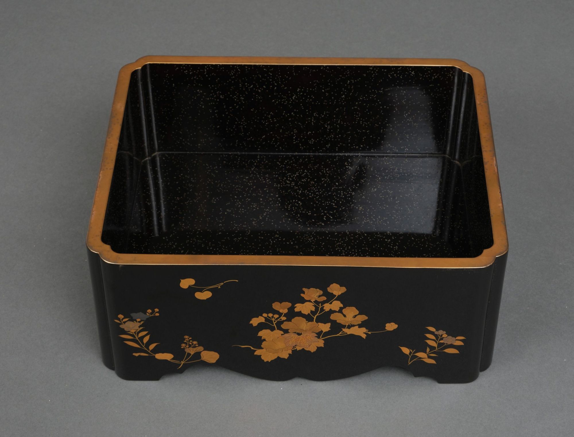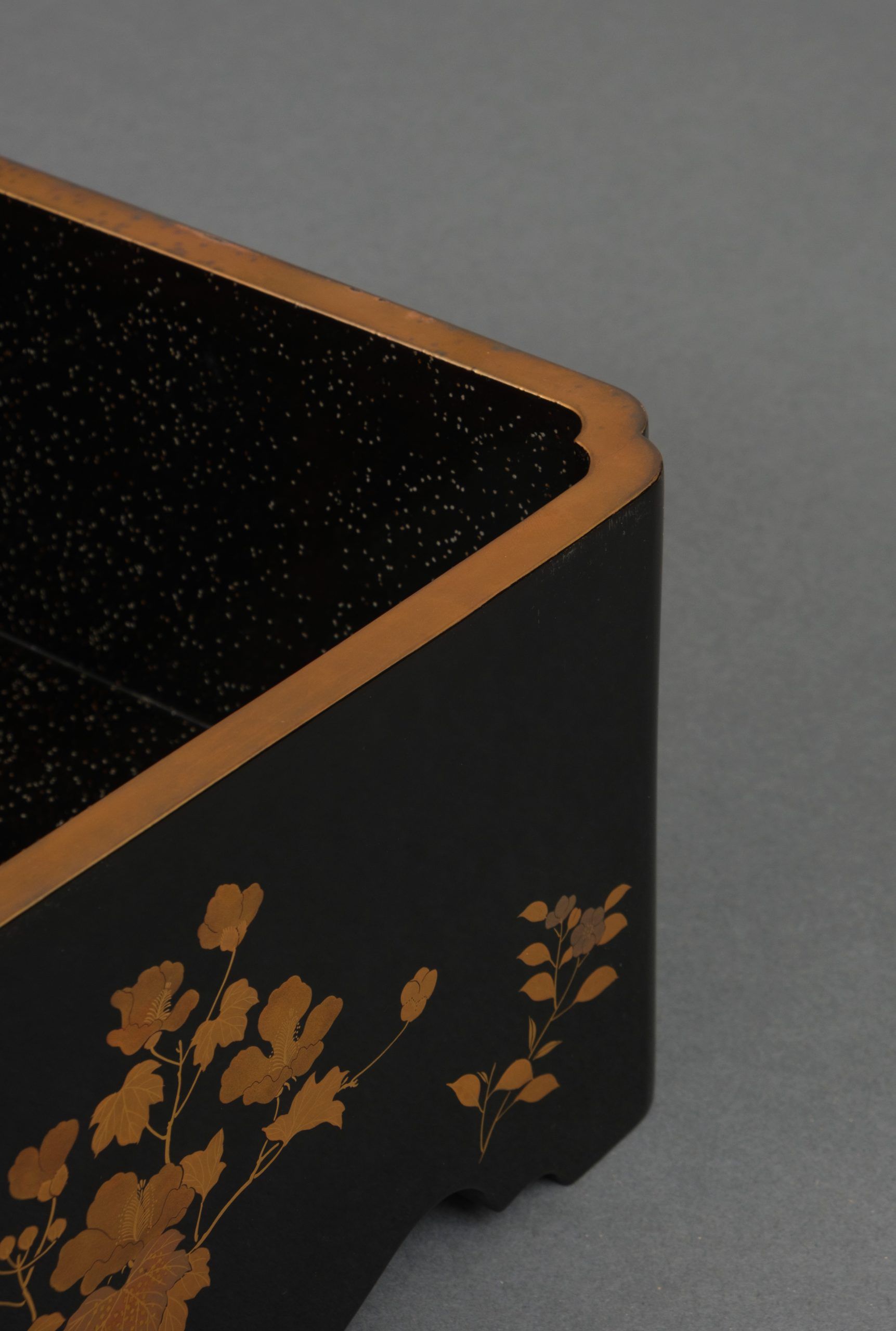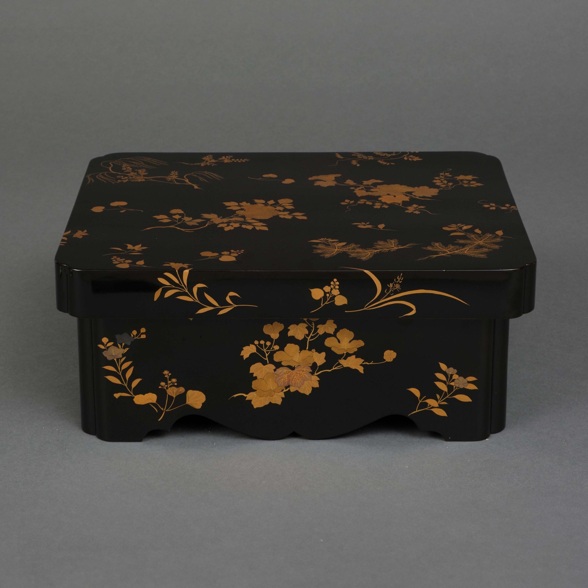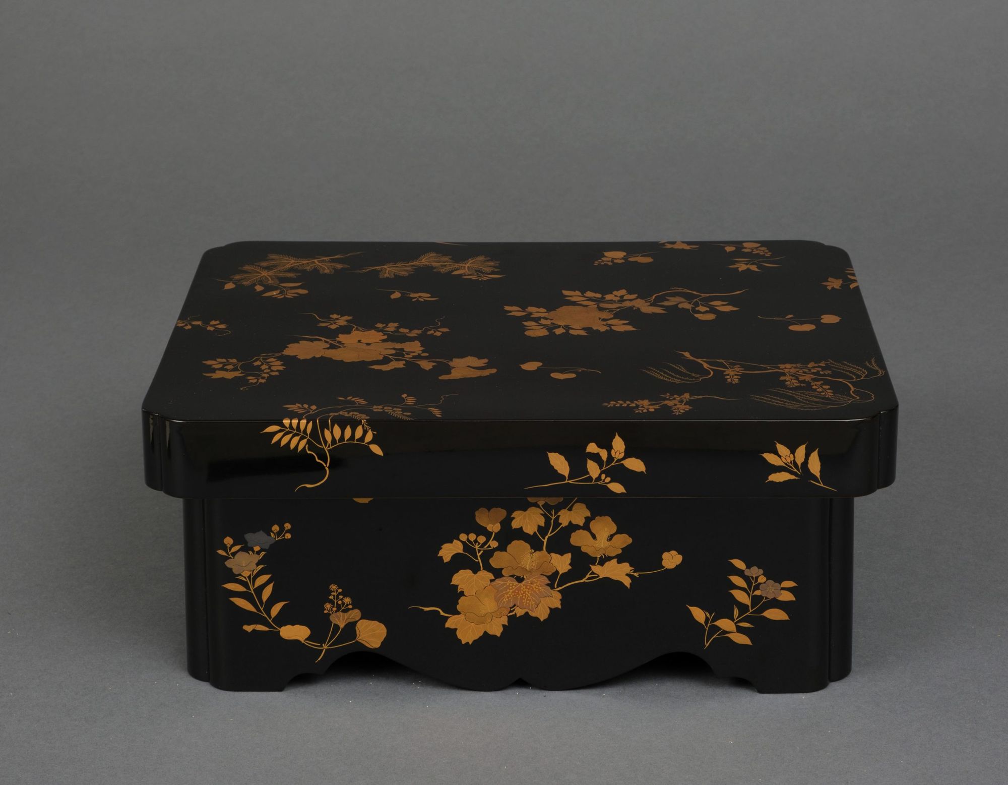 The sides of the box and the well-fitted overhanging cover are adorned with a covering floral design, depicting an array of branches of plants and flowers, like hibiscus 芙蓉 (fuyô), bell flowers 桔梗 (kikyô), pine tree 松 (matsu), wisteria 藤 (fuji), weeping willow 柳 (yanagi), and many more.