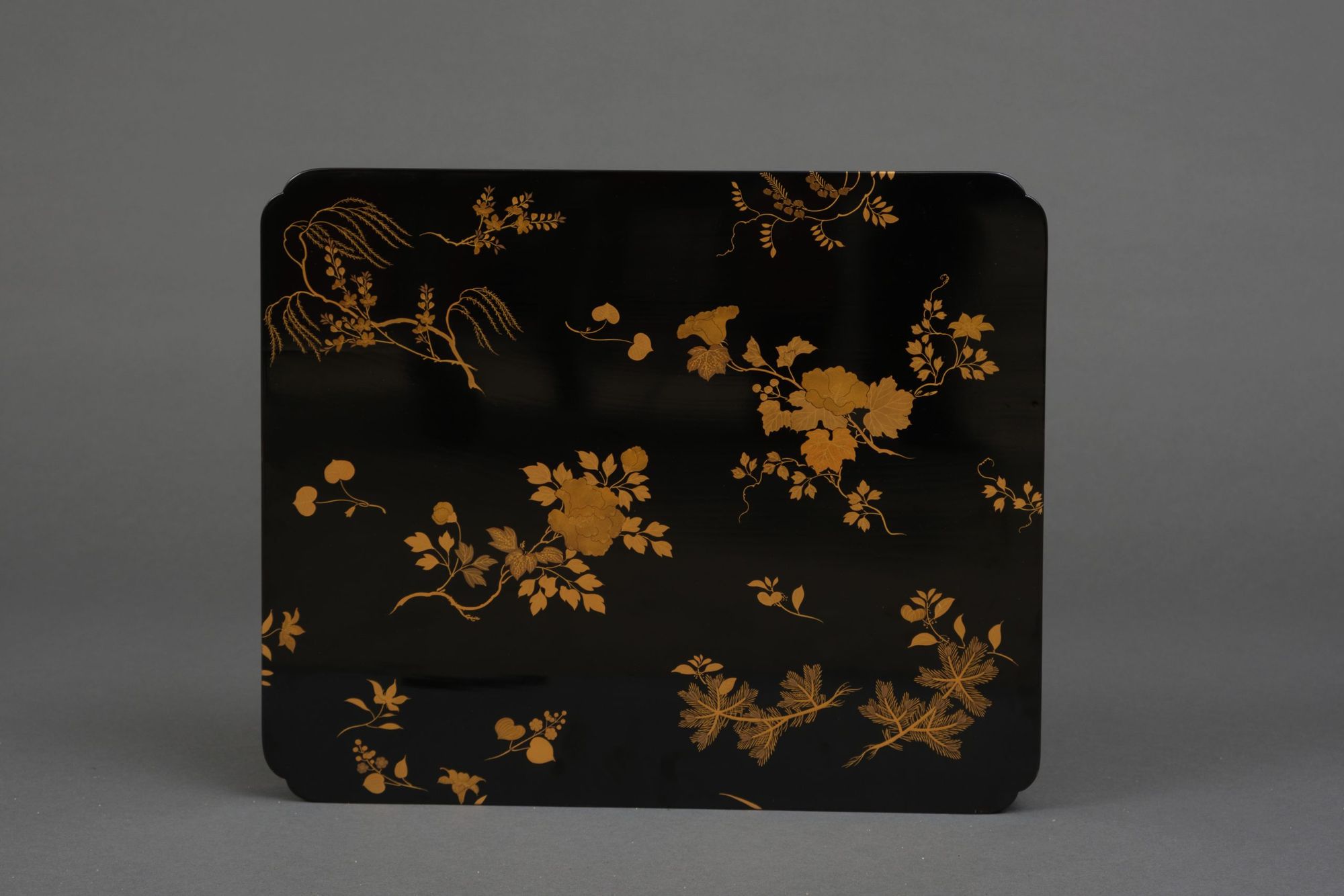 Executed in hiramaki-e 平蒔絵 (low-relief lacquer design) and takamaki-e 高蒔絵 (high-relief lacquer design) in different shades of gold and silver with kirigane 切金 (cut and inlaid pieces of gold leaf) accents. Set on a glossy black lacquer substrate 蝋色漆 (rôiro’urushi).