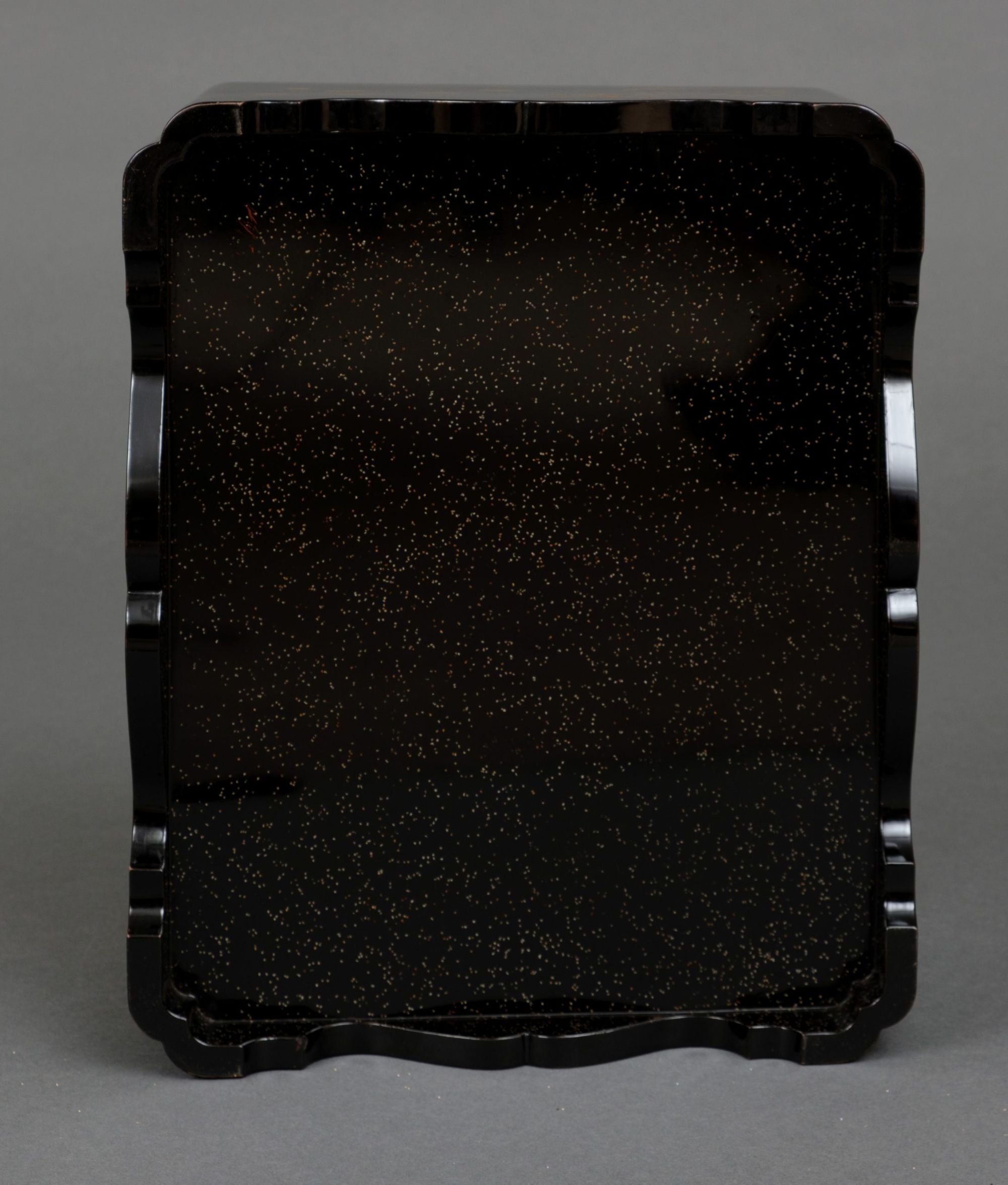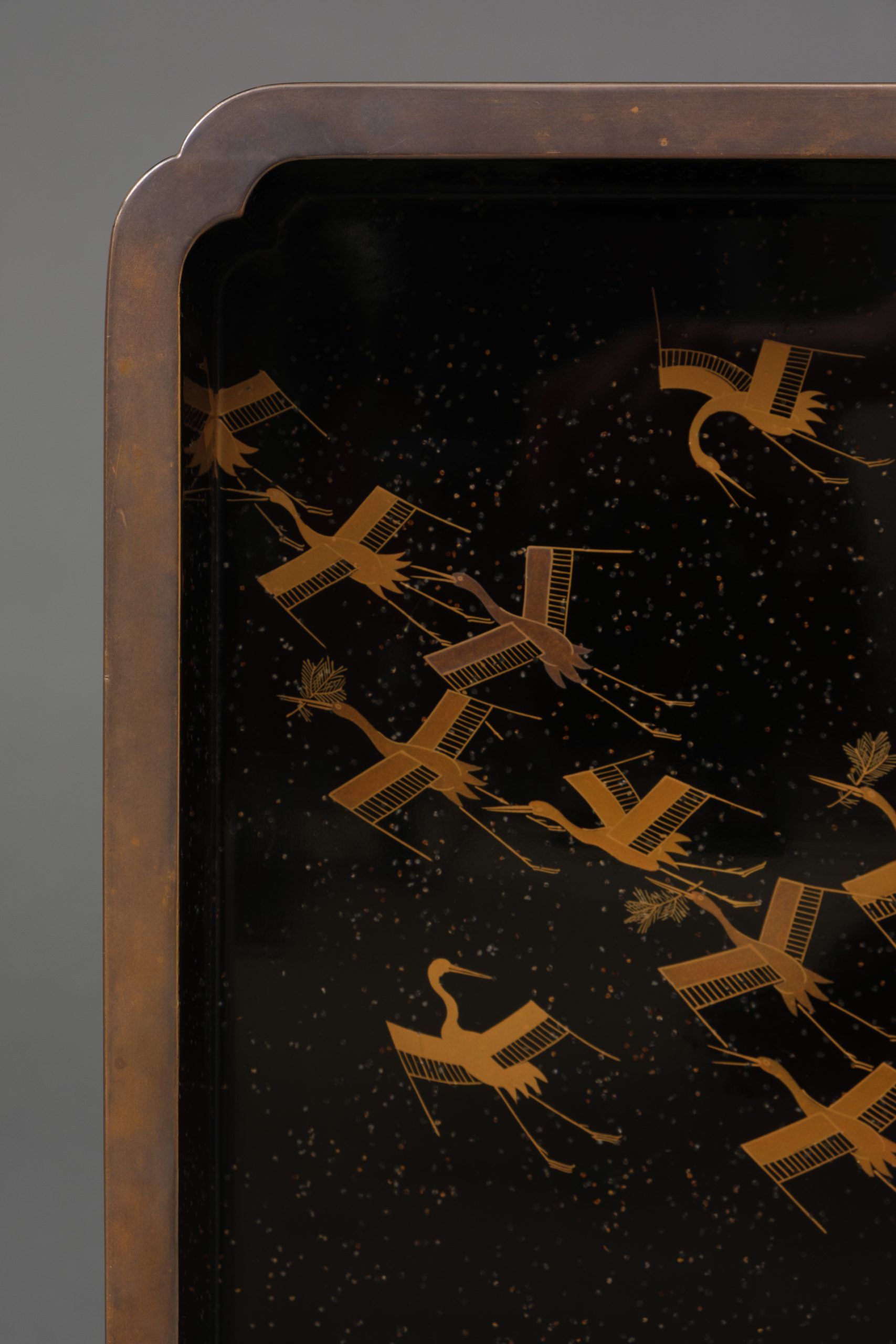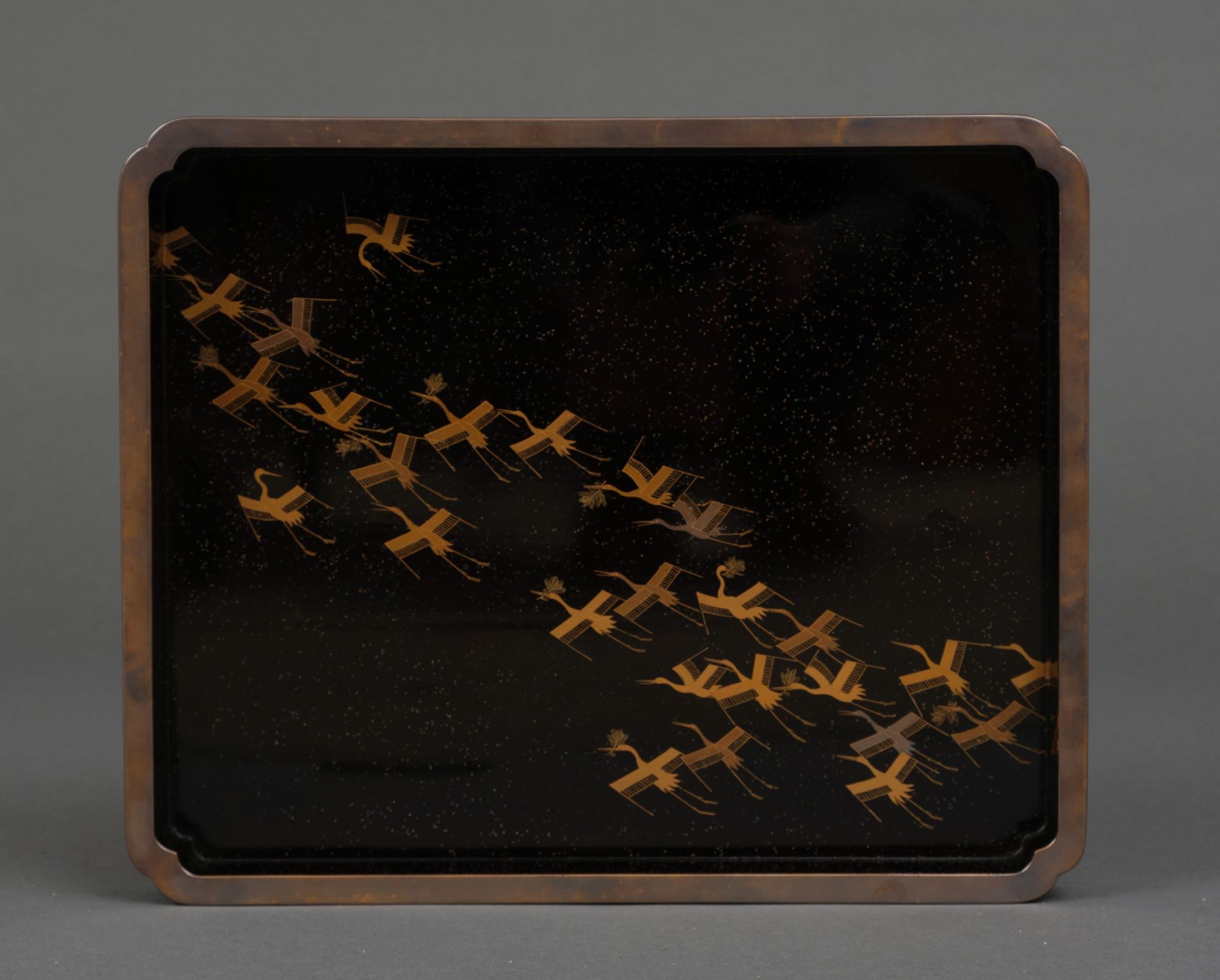 The interior of the cover with a design of a large flock of cranes 鶴 (tsuru) flying through the starry sky, some carrying a pine tree branch in their beaks. The starry sky is created by a dispersed silver nashiji 梨子地 (sprinkled gold lacquer) with a few golden hints. Bordered by a broad golden fundame rim 粉溜地 (matt lacquer) with a soft silver finish.