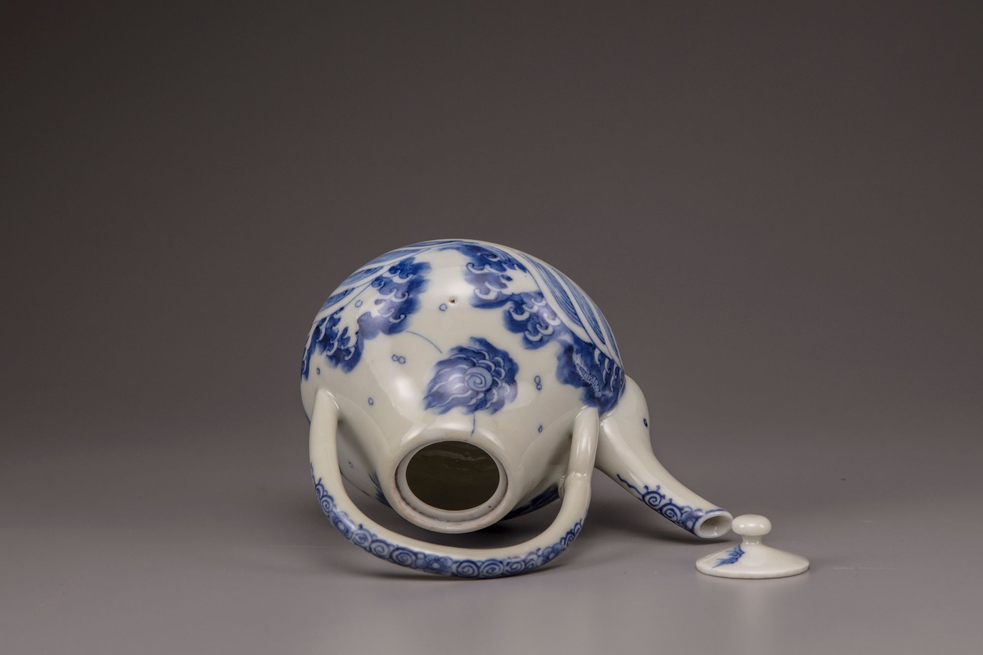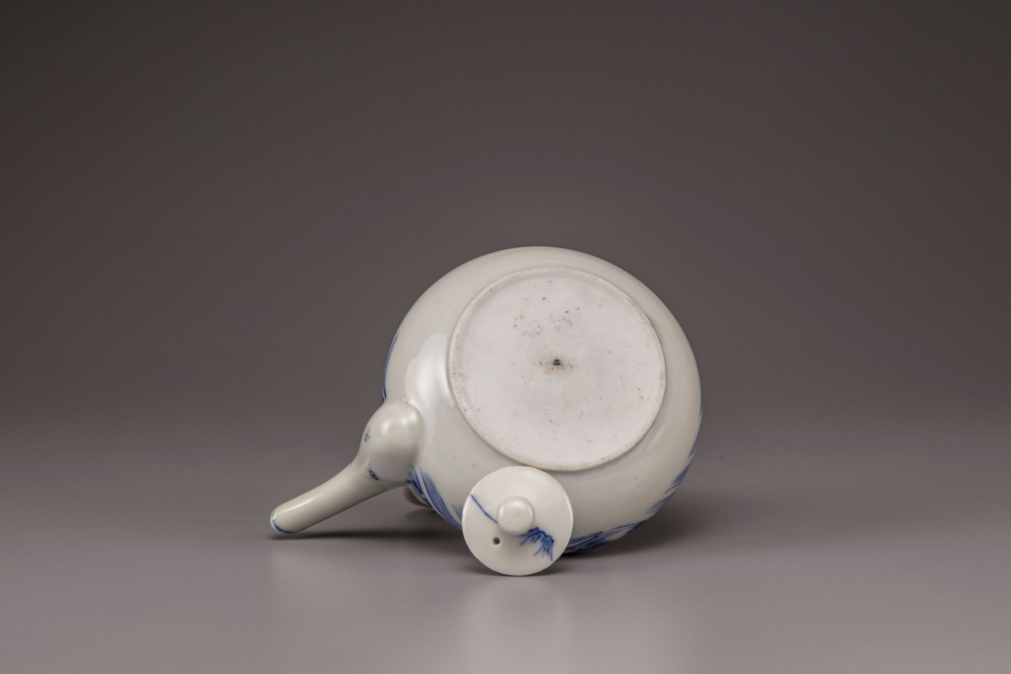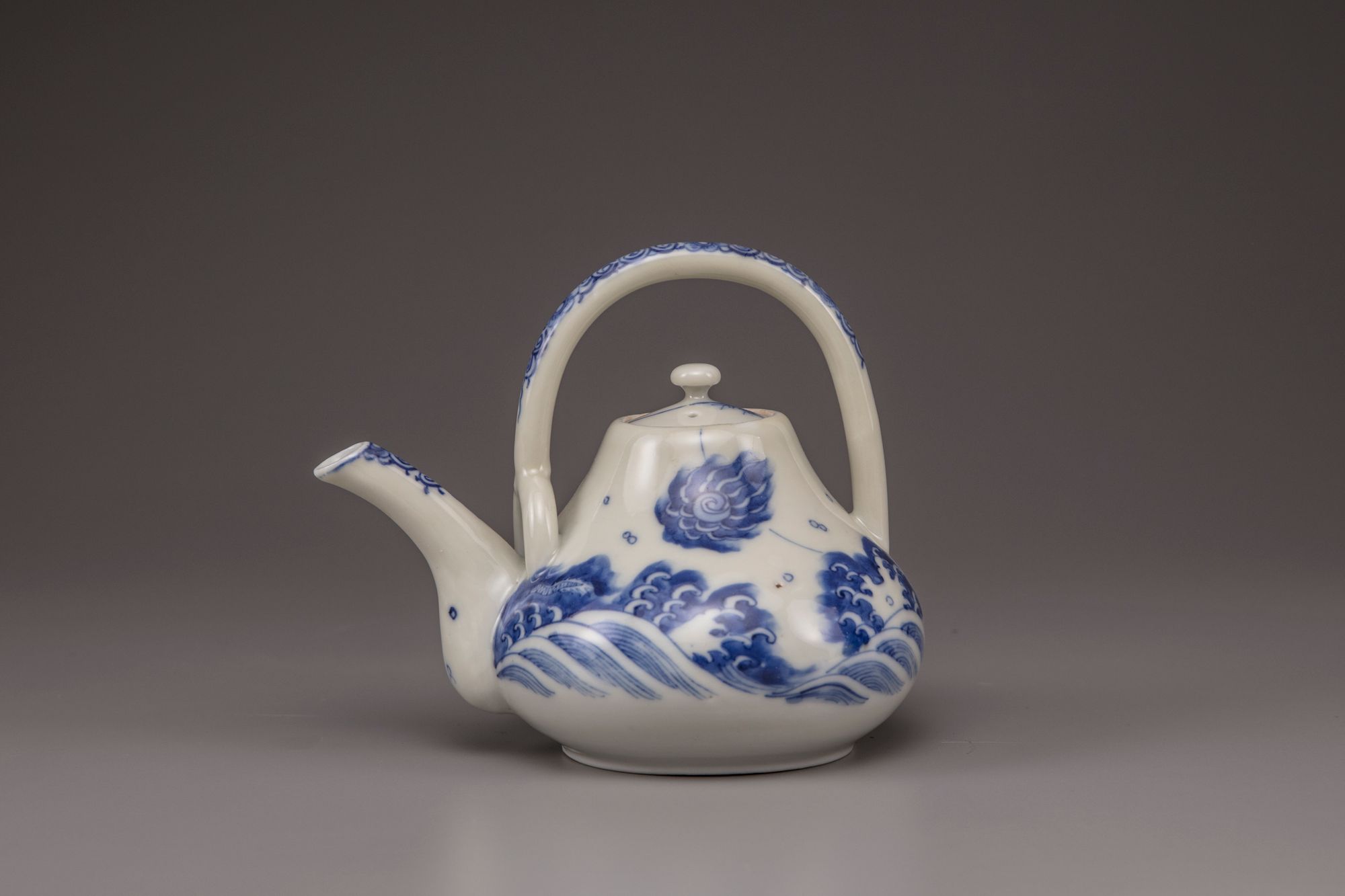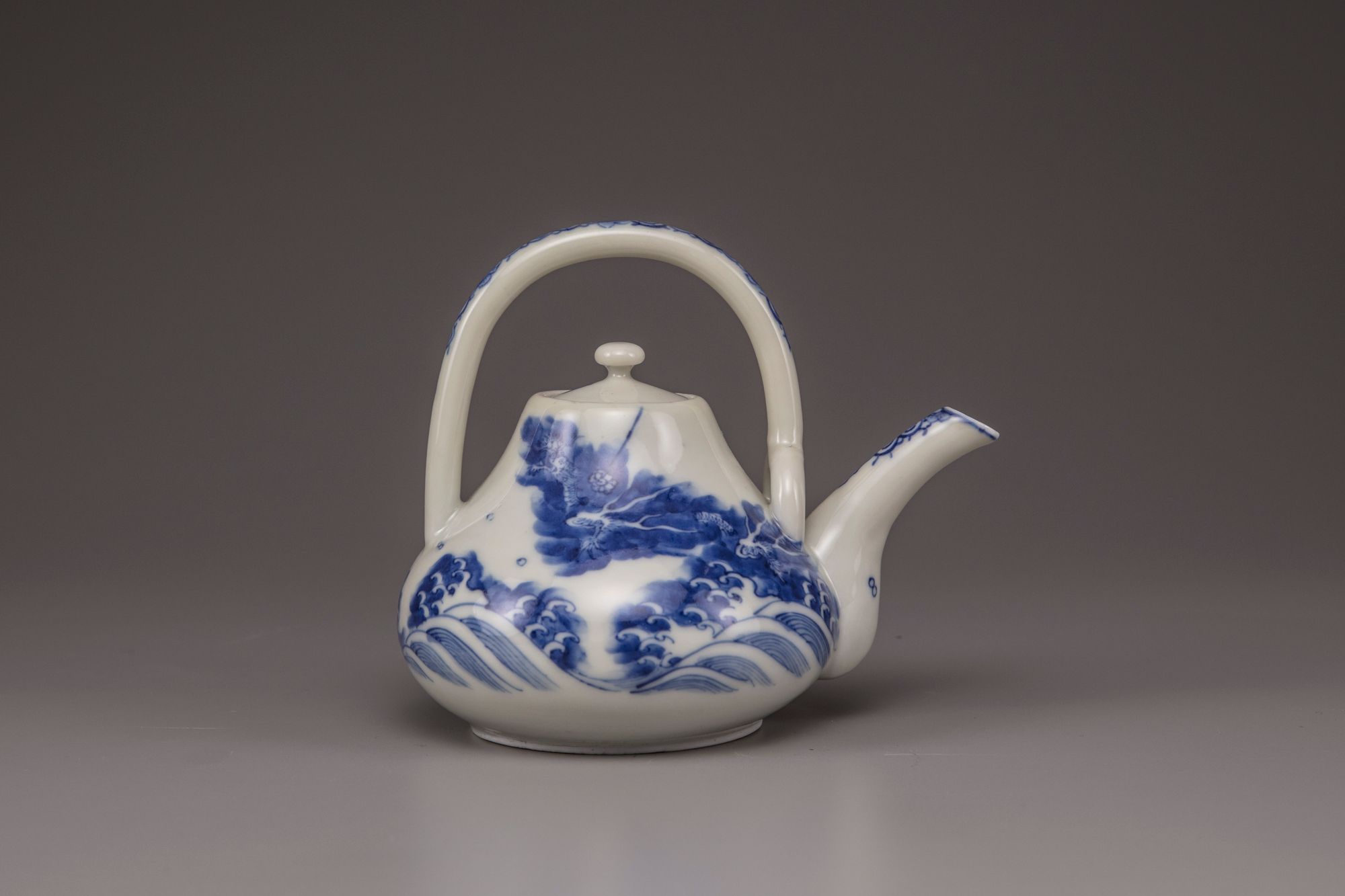 Decorated in underglaze blue with a flying dragon chasing the flaming pearl above stormy waves. Height: 13 cm. Width: 11 cm.