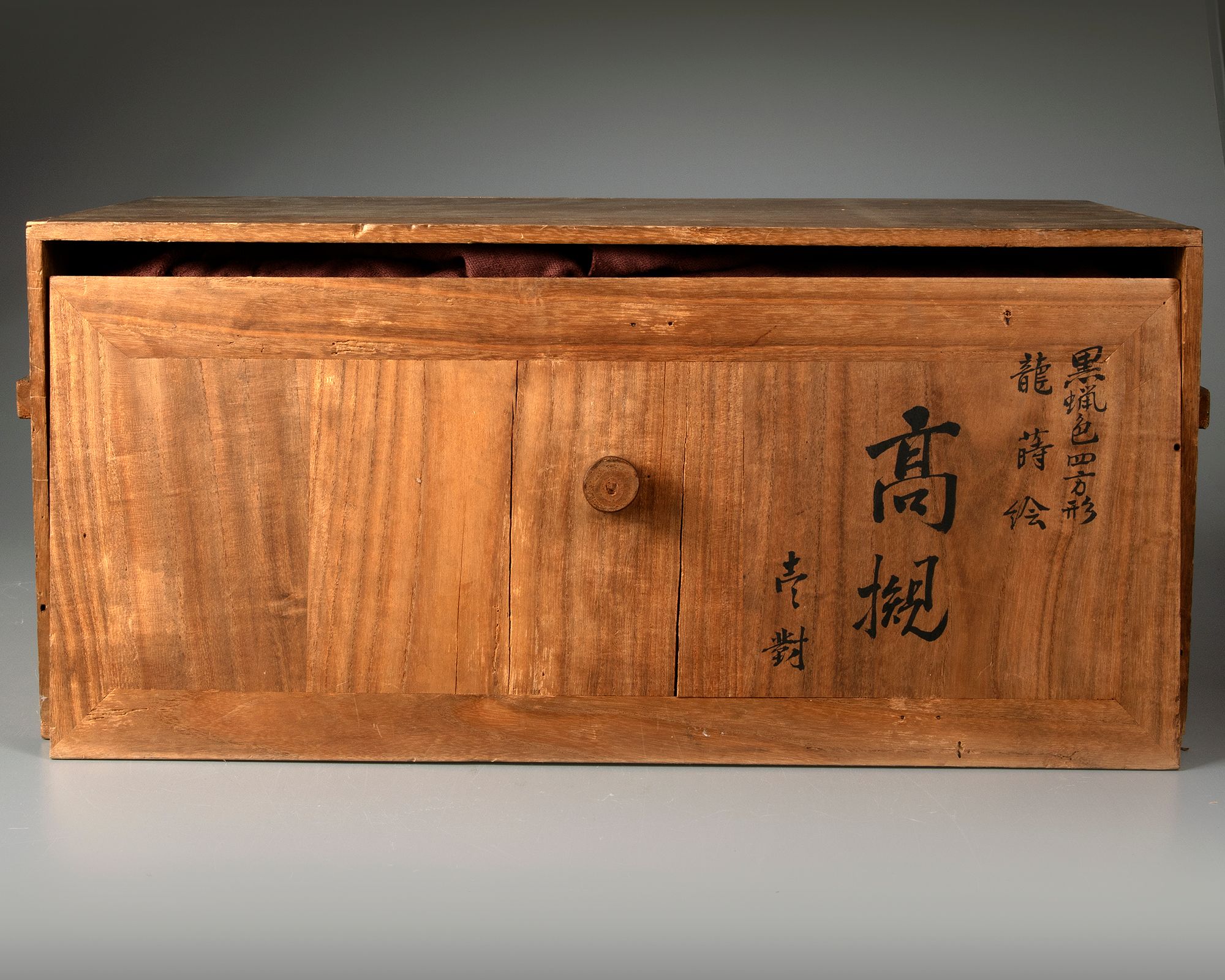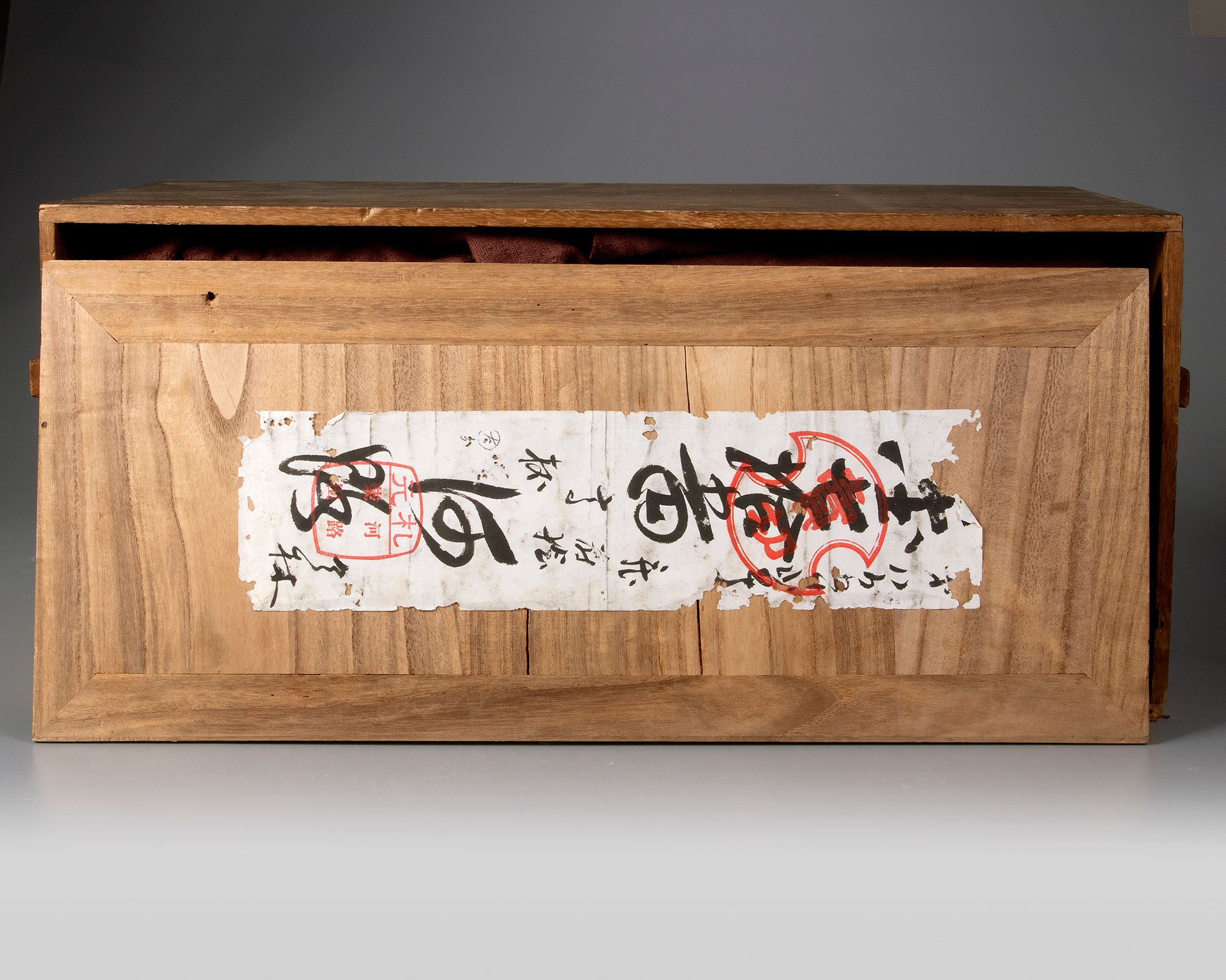Complete with original wood storage box 供箱 (tomobako) with an inscription describing the trays, and the interior of the lid with an old stamped Japanese auction slip.