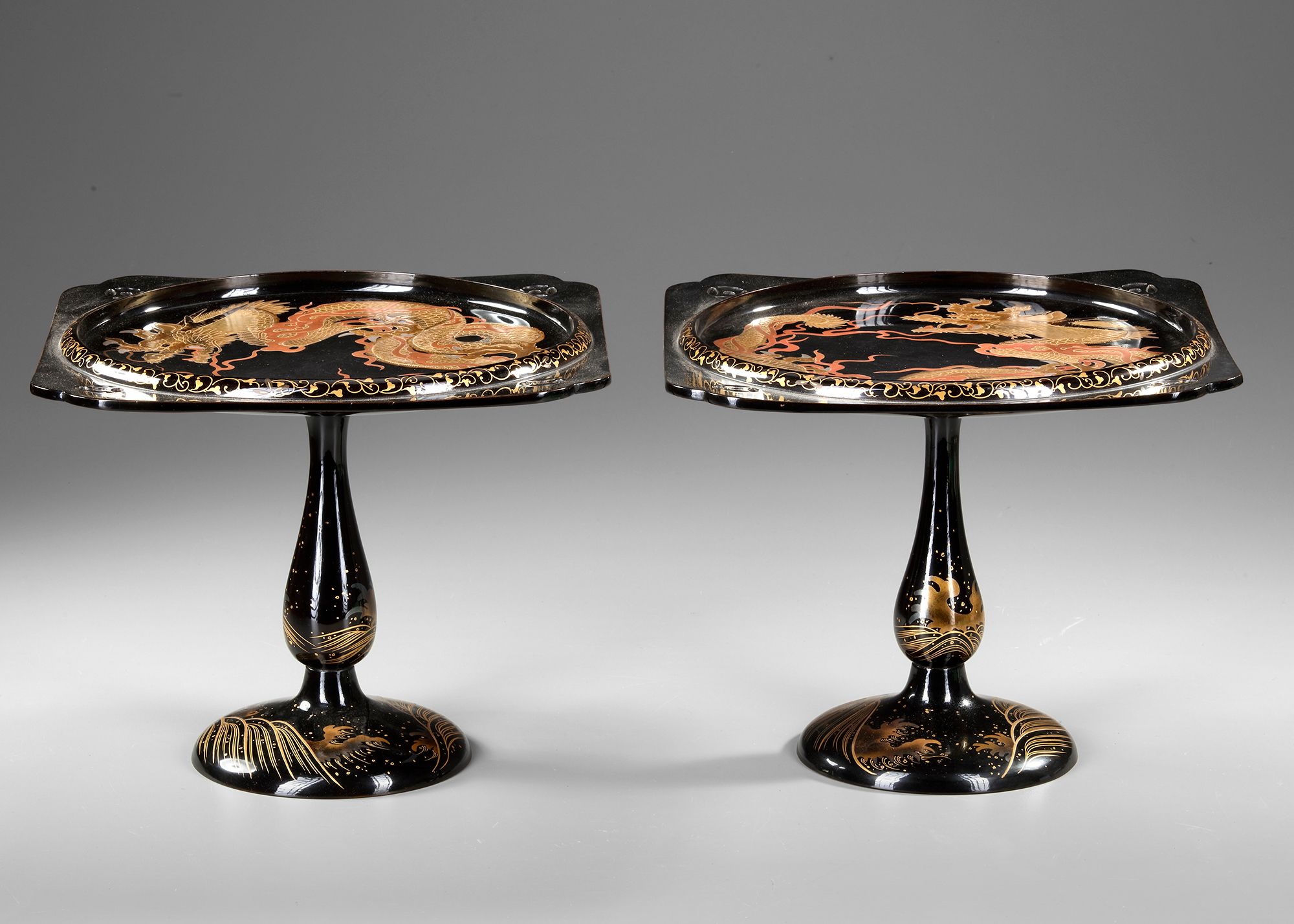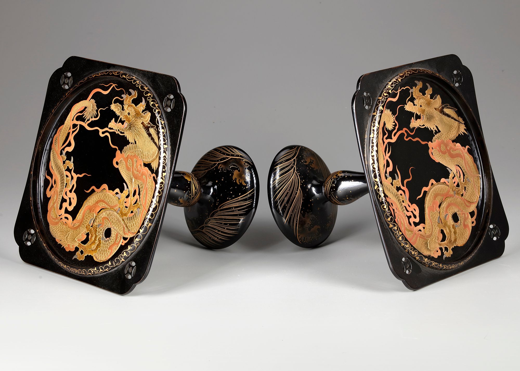 An outstanding and large pair of lacquered offering trays with a refined dragon 龍 (ryû) design.