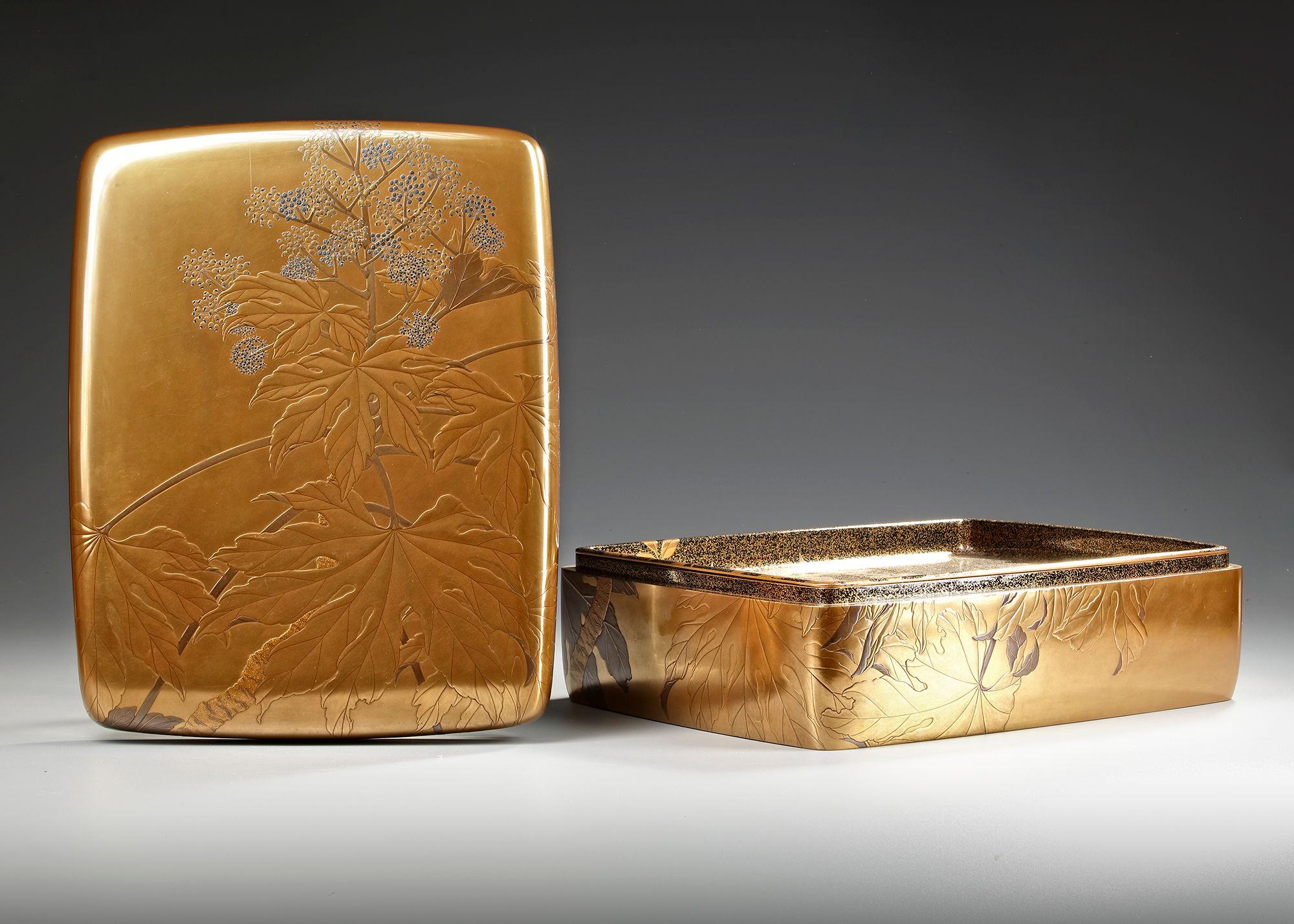 The cover, extending onto the sides, showcases an impressive ‘hanaudo’ 花独活 (Heracleum nipponicum - species of hogweed) with large, deeply lobed leaves hanging from a curving stem, surmounted by a cluster of silver umbel flowers. This design is rendered in various shades of golden and silver hiramaki-e 平蒔絵 (low-relief lacquer design) on a golden substrate, with the stem highlighted by dense nashiji 梨子地 (sprinkled gold lacquer).
