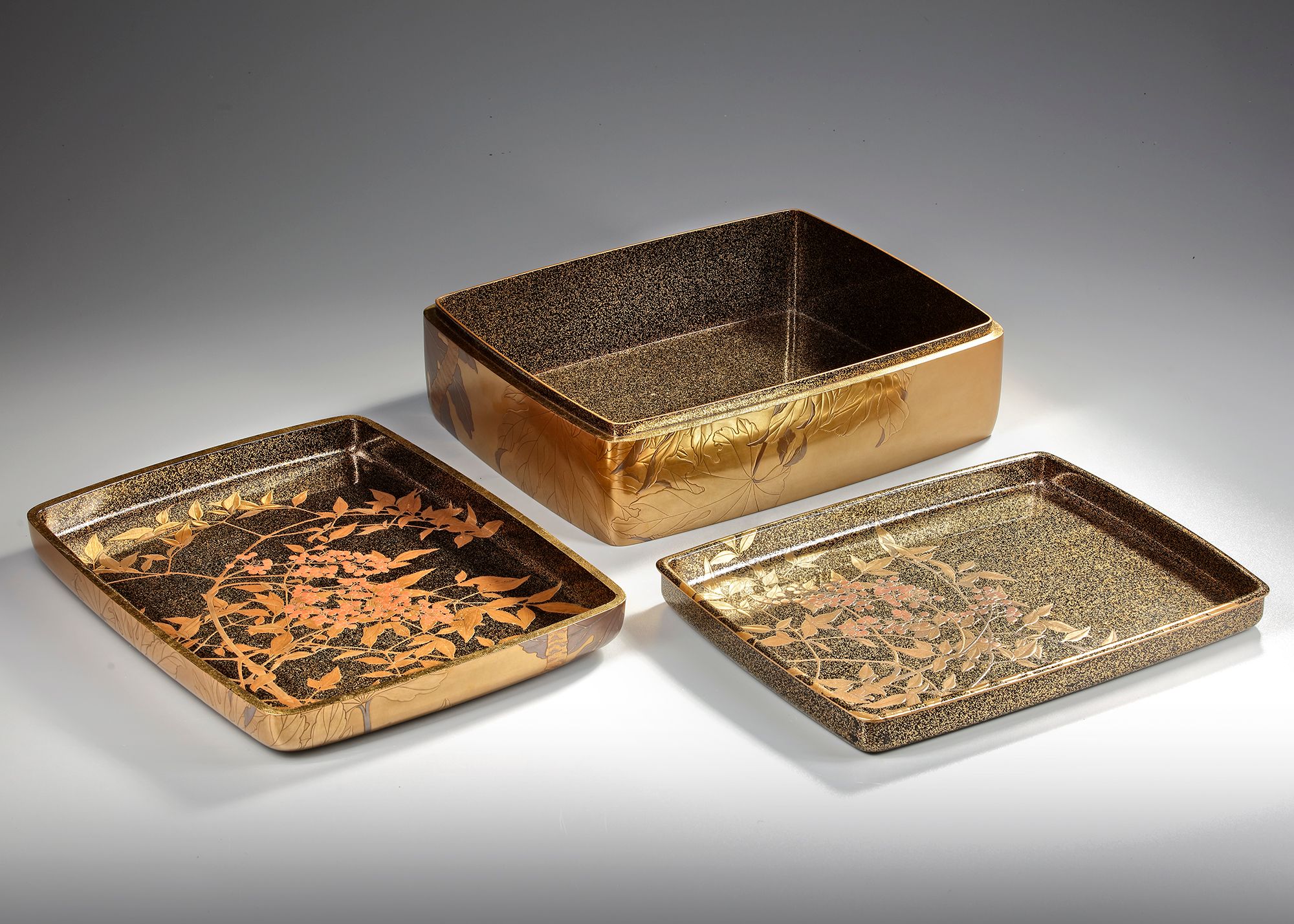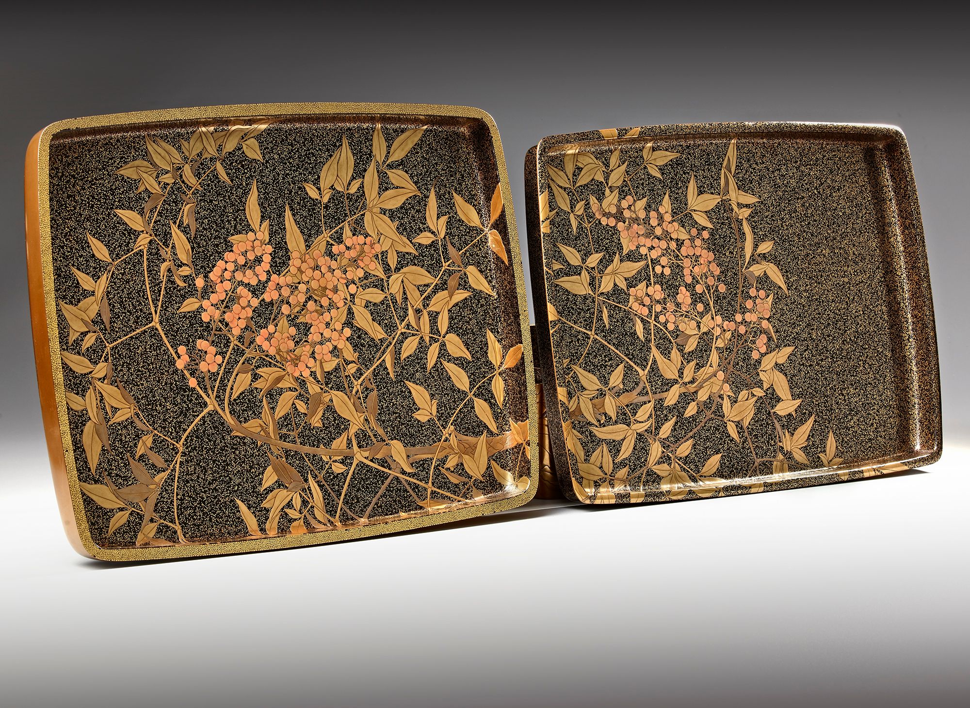 The interior of the cover and the removable tray are adorned with branches of ‘heavenly bamboo’ 難点 (nanten) bearing red berries, set against a more sparsely applied nashiji on a black lacquer ground, and finished with dense golden nashiji edges.