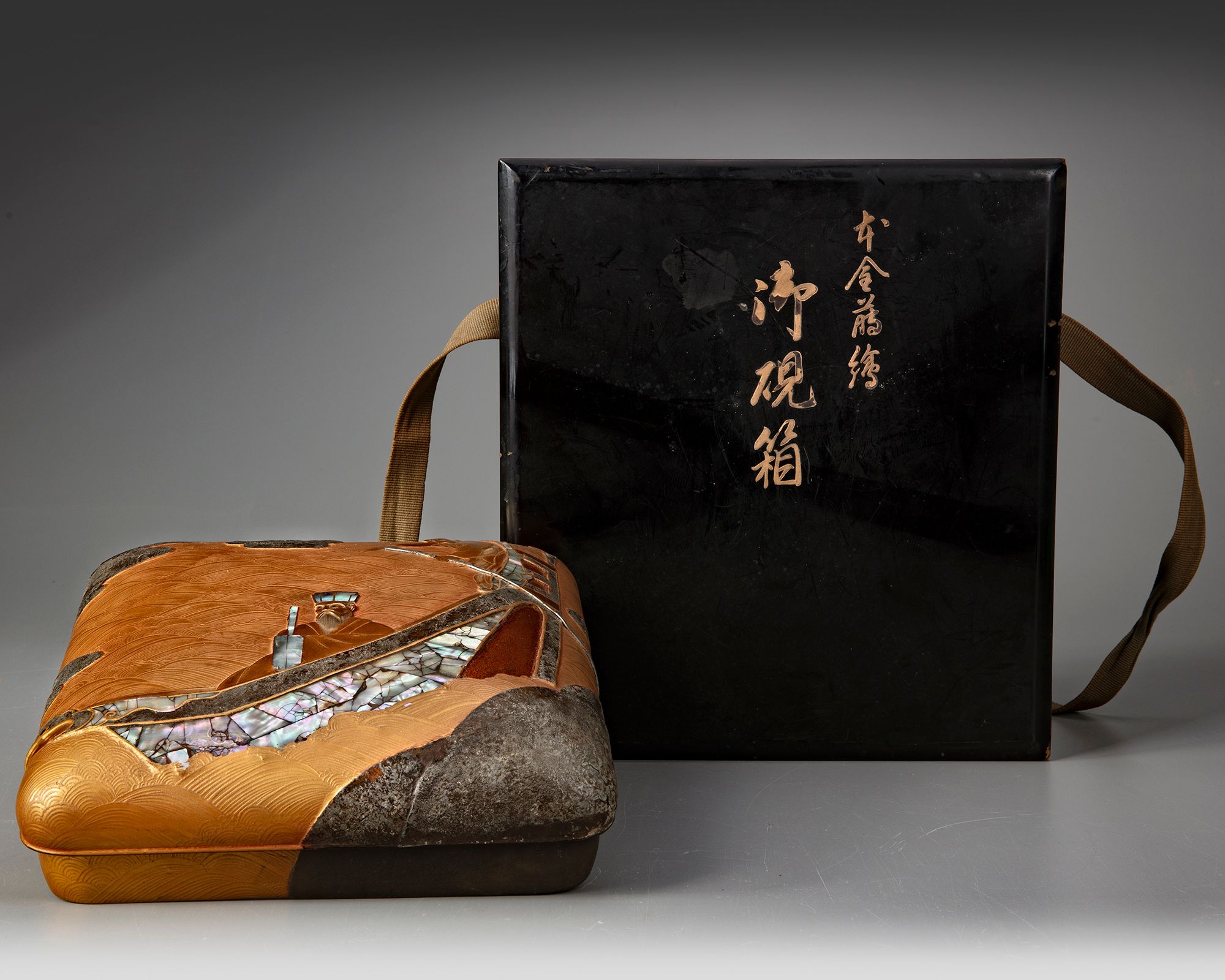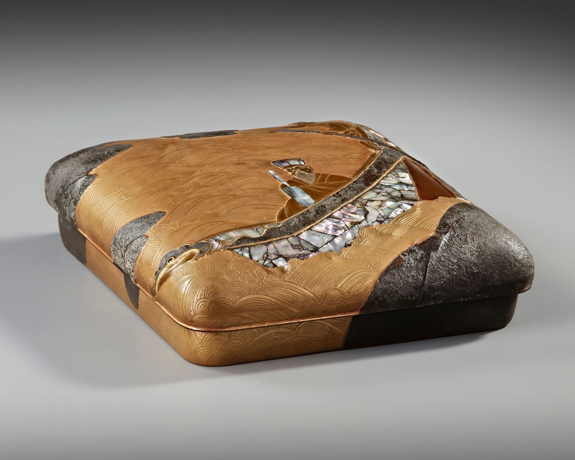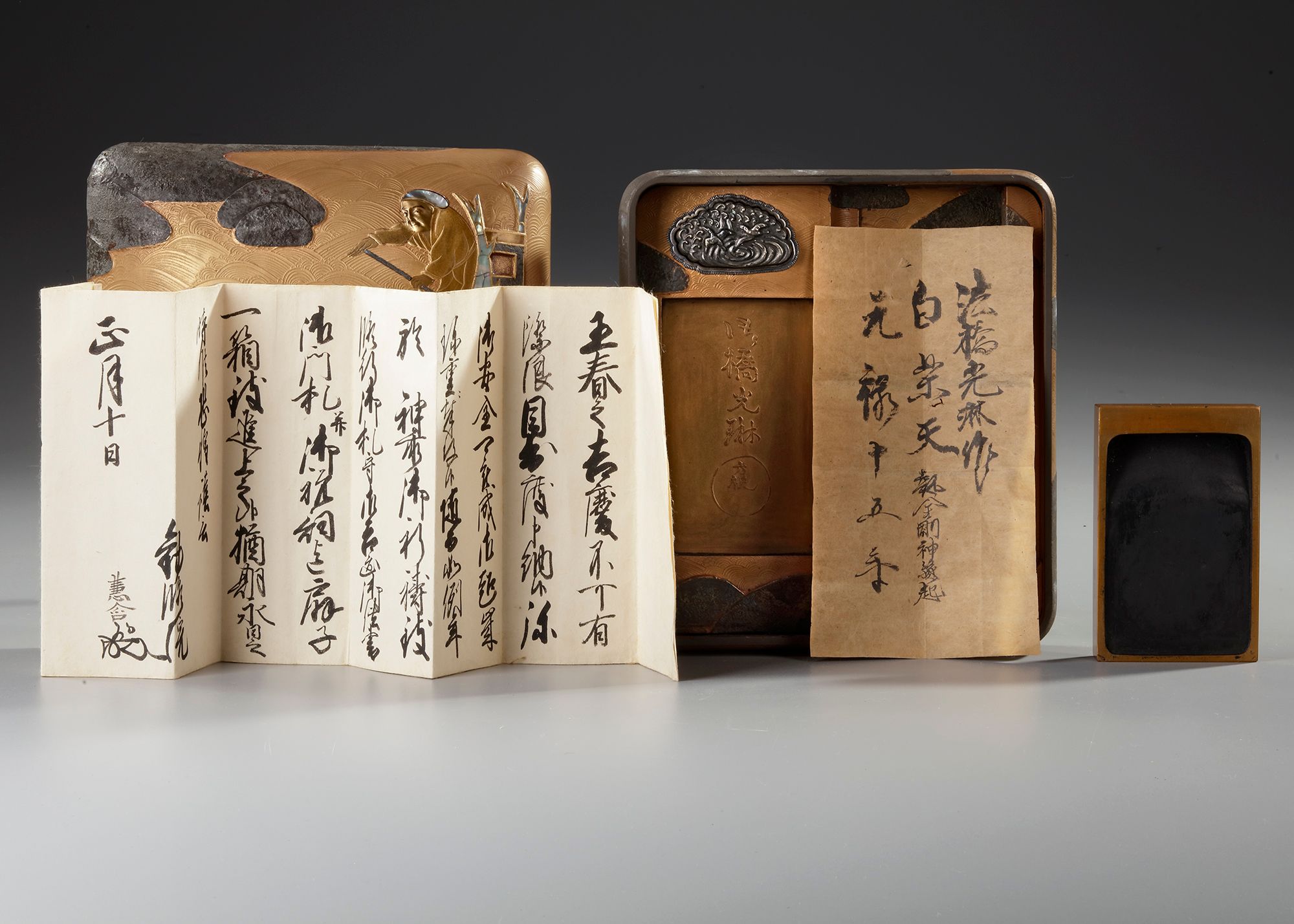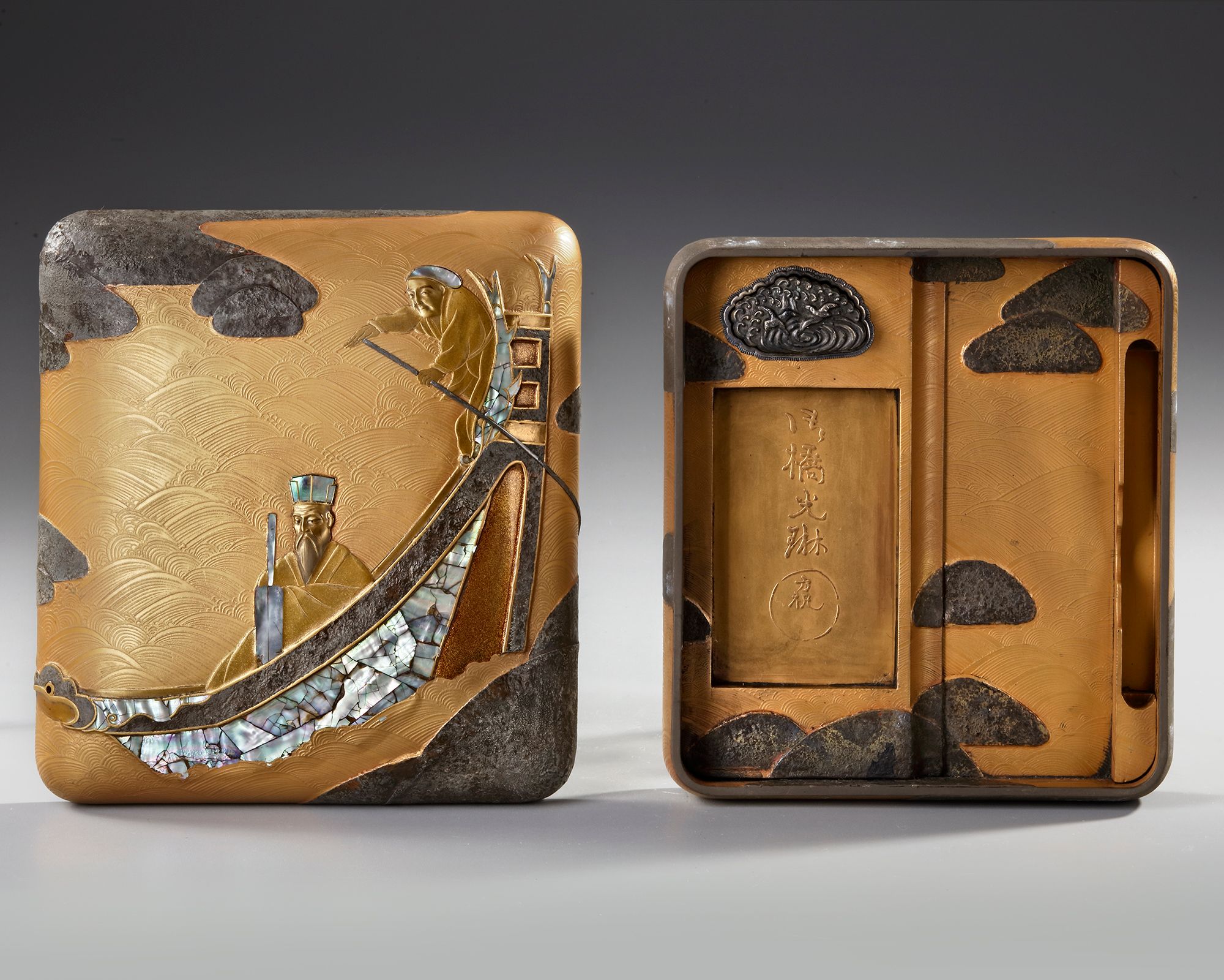 A suzuribako writing box with rounded corners. A stern looking Chinese statesman (possibly the loyal statesman and poet Qu Yuan who is going to drown himself in the river) holding a gui-baton in his hands (a sign of dignity and authority) being rowed in a boat. The design is executed in raised gold and silver lacquer with mother-of-pearl inlay work. In inside of the box were the ink stone is placed is signed: hokkyo Korin and sealed Masatoki (both in raised gold lacquer), names and title of the Rinpa-school artist Ogata Korin (1658-1716). With a rectangular ink stone with a gold lacquered rim and a cloud shaped silver water dropper. With a light brown paper stating that the box is by Ogata Korin, dated Genroku 15 (1703).