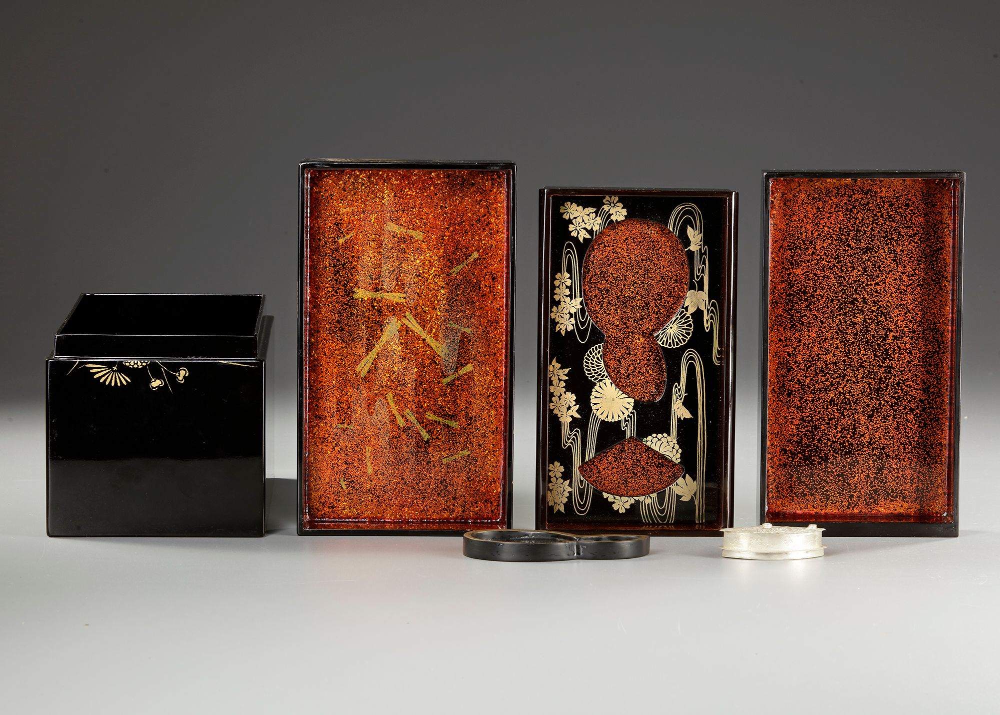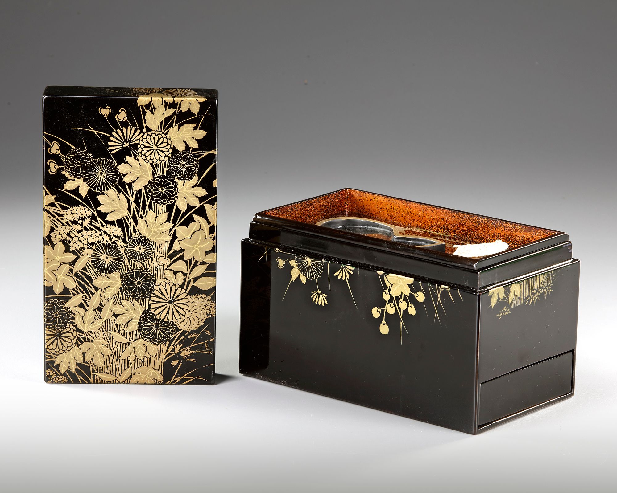 A suzuribako writing box with an extra compartment, its lid decorated in gold makie-lacquer depicting various flowers. The tray of the box for the ink-stone shows chrysanthemums and cherry-blossoms drifting on running water in gold-makie-lacquer. With a gourd-shaped ink-stone and a folding-fan shaped water dropper. The trays of the box are sprinkled nashiji-gold lacquered.