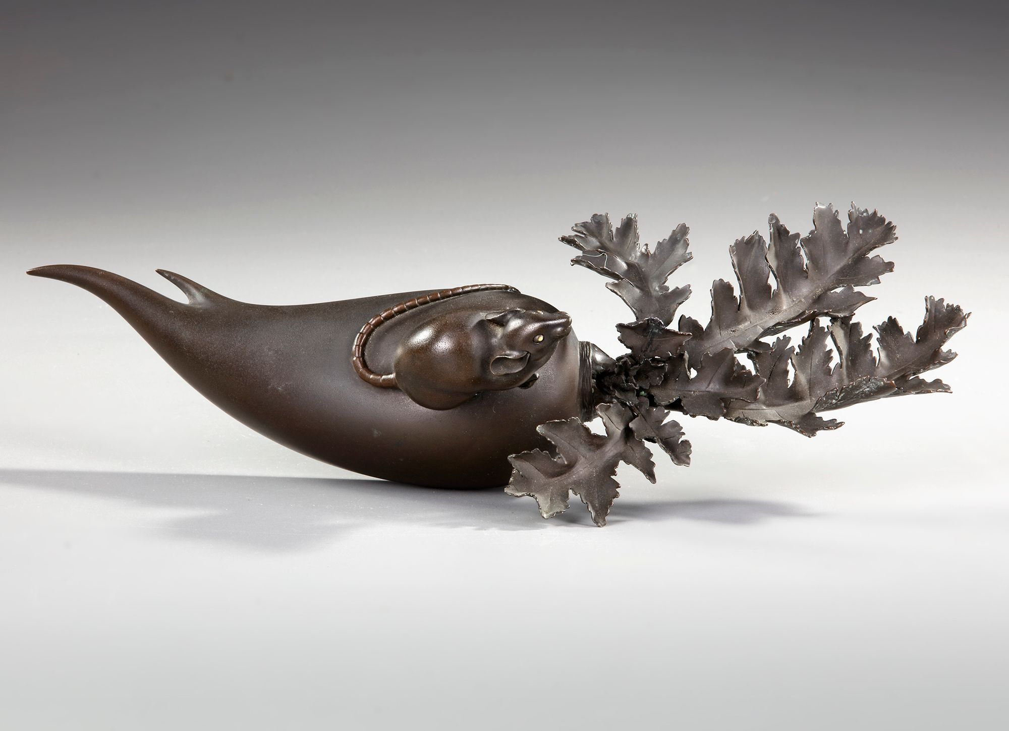 A bronze okimono has a very well modeled and cast mouse sitting atop a daikon radish with elaborate foliage. Length 40 cm. Height 13 cm.