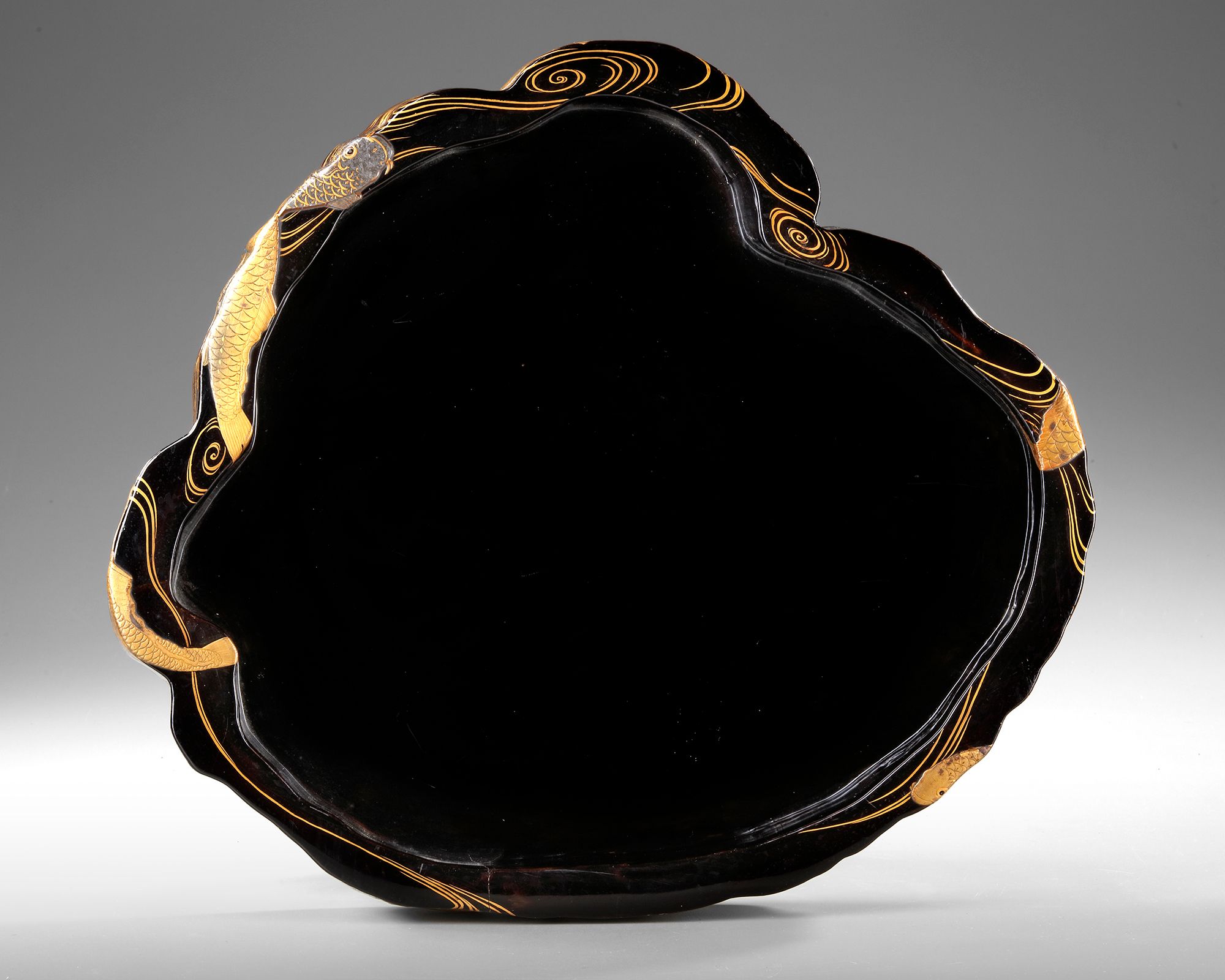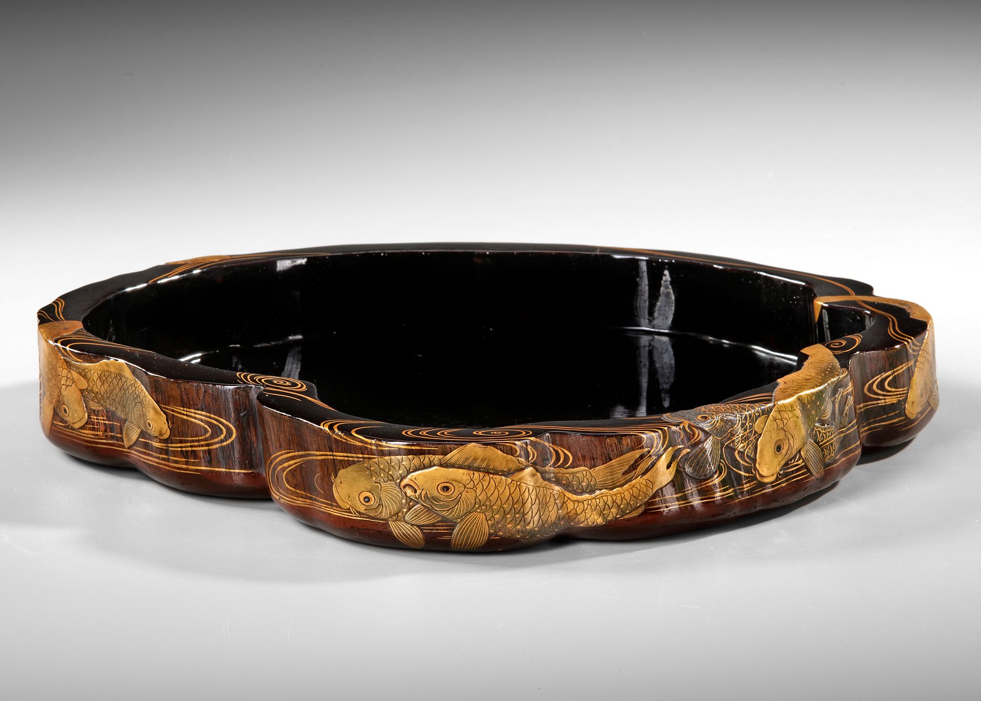 Its wall decorated with swimming carps in raised takamakie-gold lacquer. Height 6.5 cm. Diameter 47 cm.