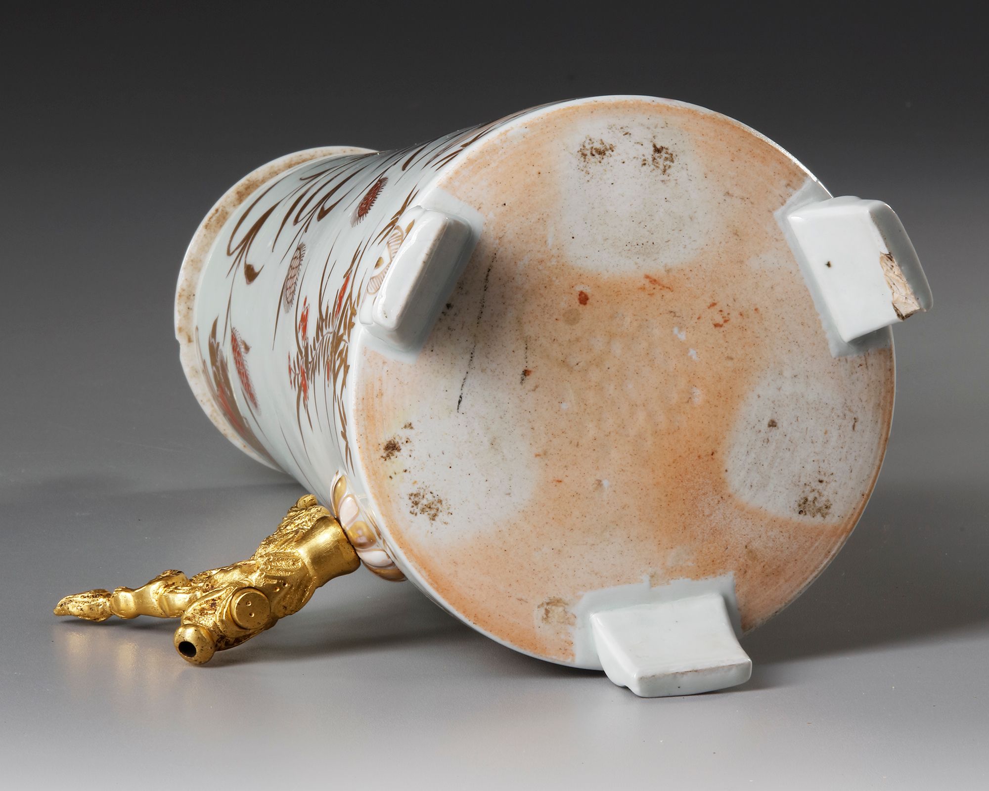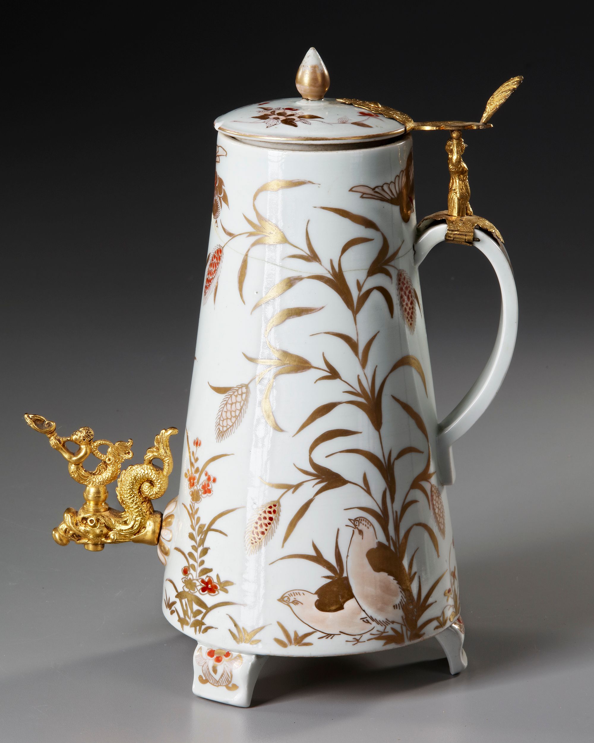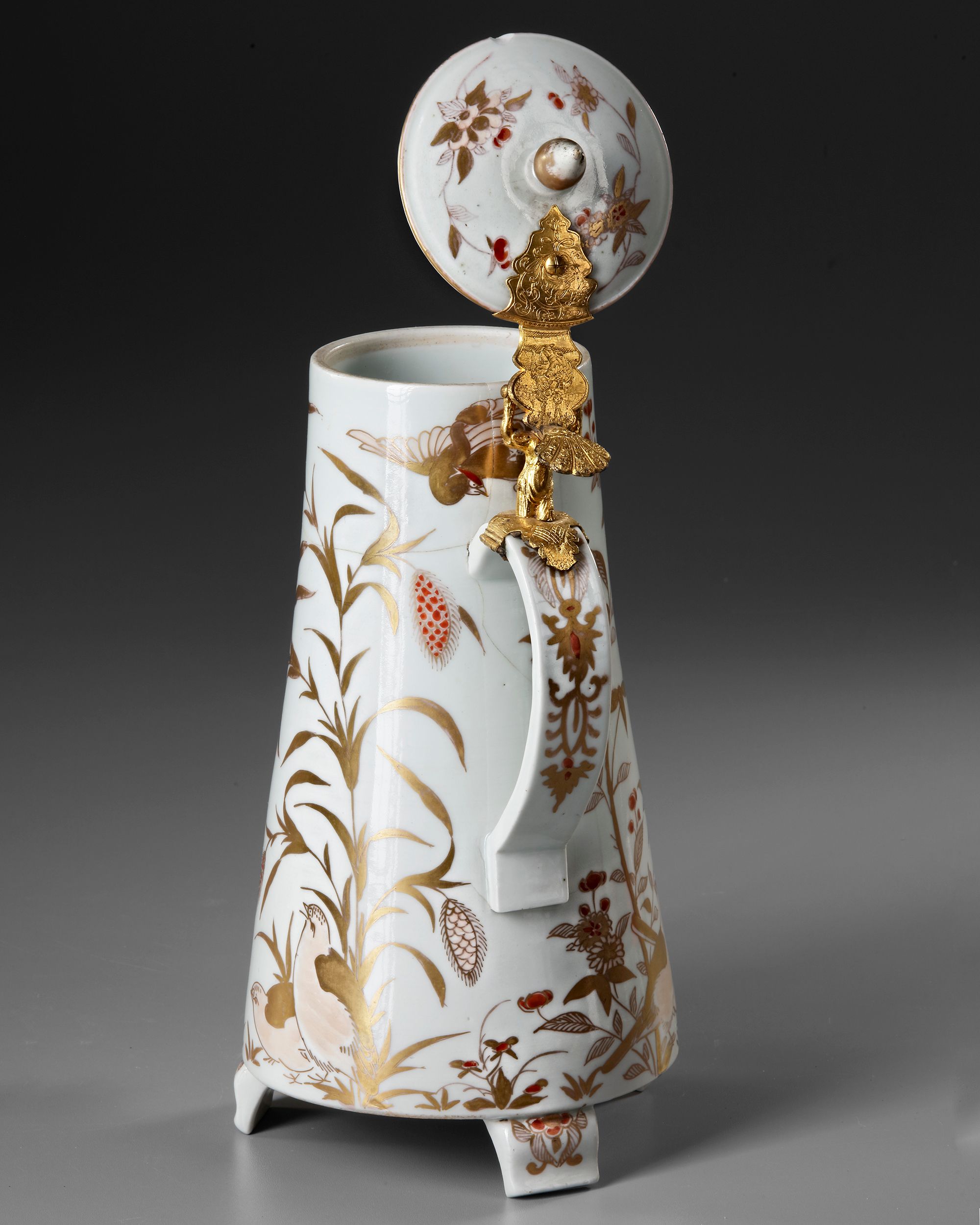 The conical body raised on three feet, with applied C-shaped handle and cover with knob finial, painted in overglaze gold and iron-red enamels with birds and flowers.