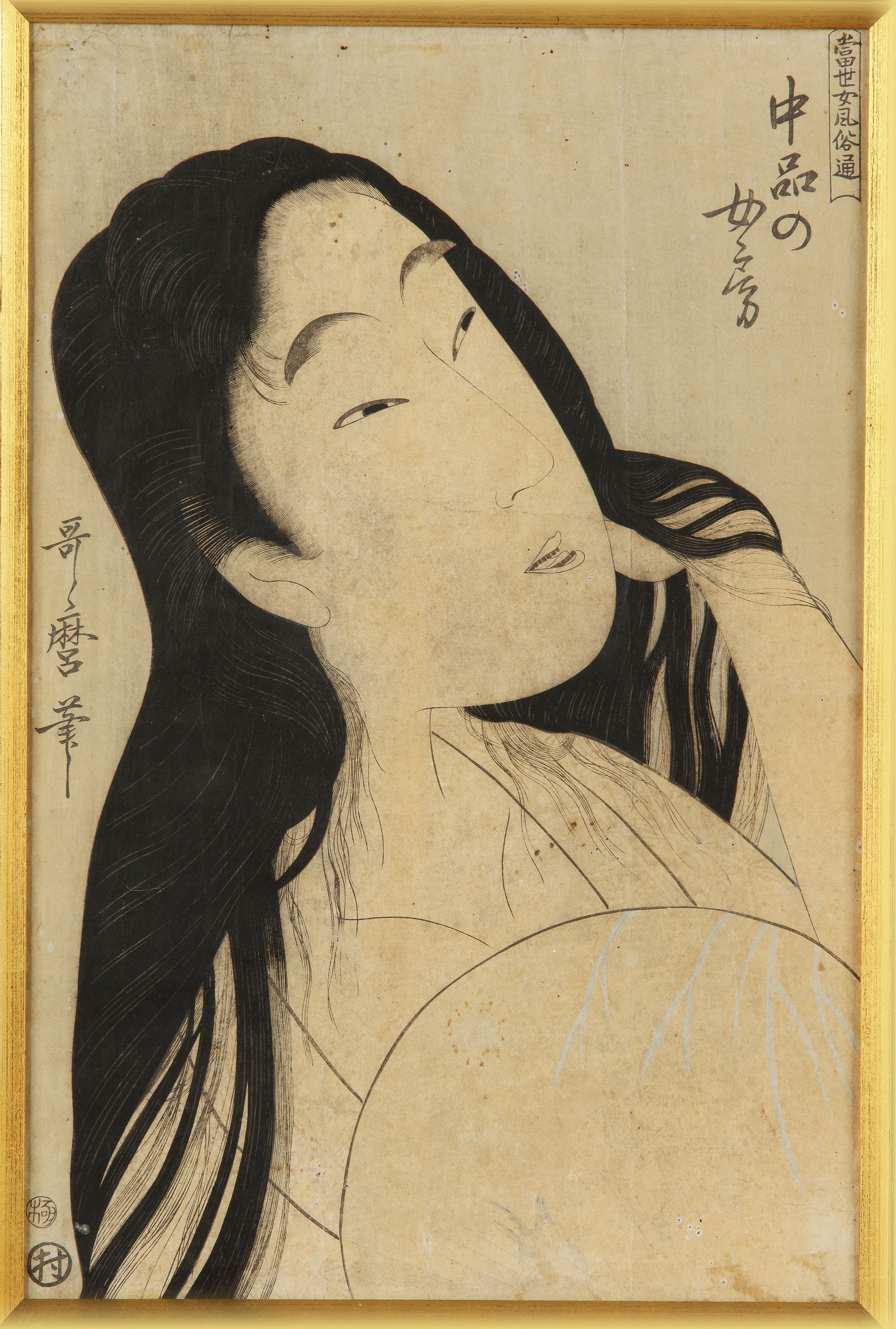 This elegant woodblock print by the renowned ukiyo-e artist Kitagawa Utamaro depicts a woman of medium social rank, captured with Utamaro's signature delicate and expressive line work. The woman's serene expression and the flowing lines of her hair exemplify Utamaro’s mastery in portraying the grace and beauty of women. The calligraphy on the right, "Yūkaku Jissetsu," translates to "The True Stories of the Pleasure Quarters," indicating the context of the series, which explores the lives and stories of women in different social standings within the pleasure districts of Edo-period Japan. Utamaro’s nuanced use of composition and minimalism emphasizes the refinement and subtle elegance of the subject. The artist's signature can be seen on the left, marking this piece as a classic example of his celebrated bijin-ga (pictures of beautiful women) style.