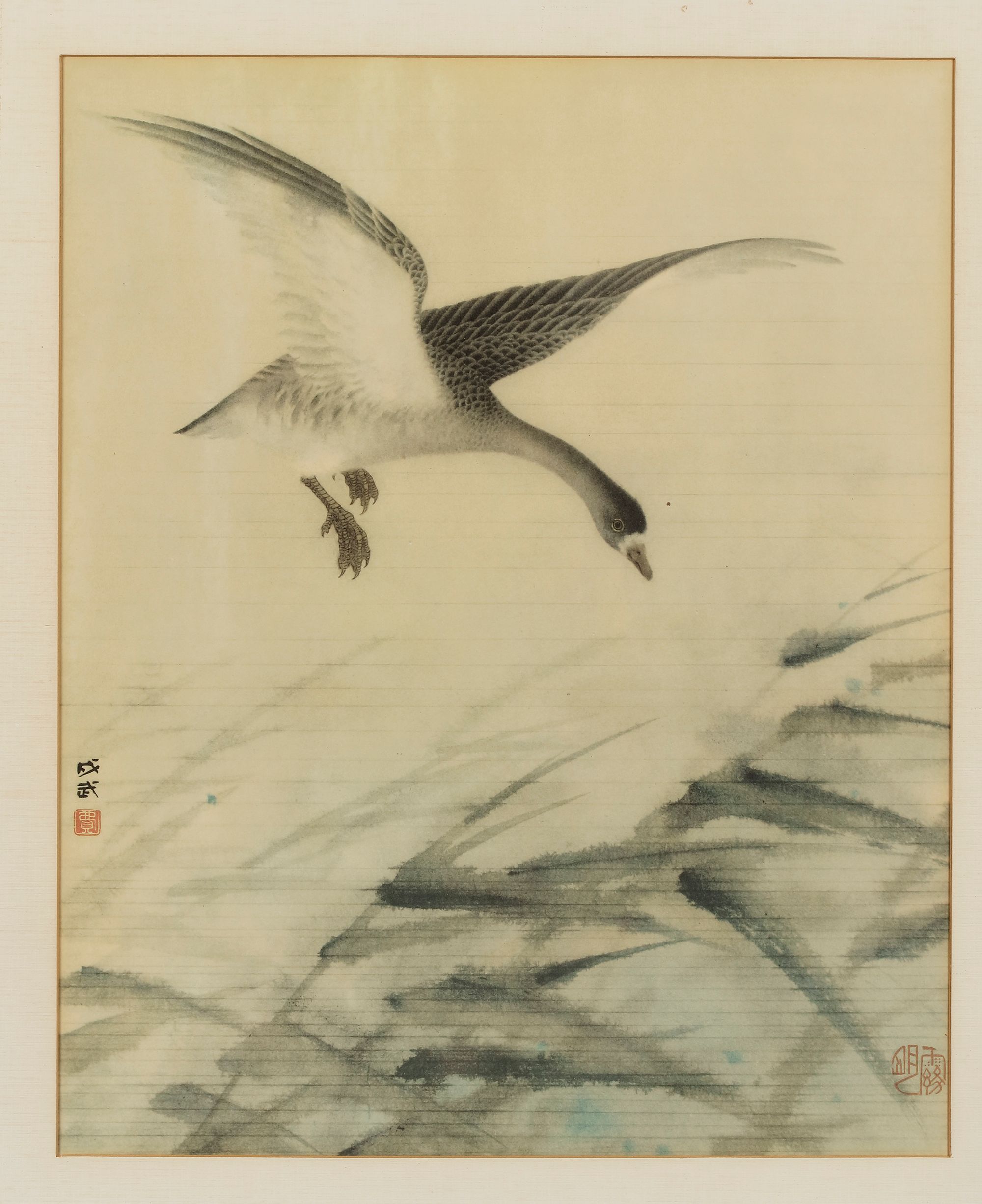 A delicate painting of a wild goose in mid-flight, rendered in the traditional Japanese sumi-e. The soft brushwork and subtle shading capture the graceful motion of the bird as it descends toward a misty landscape.