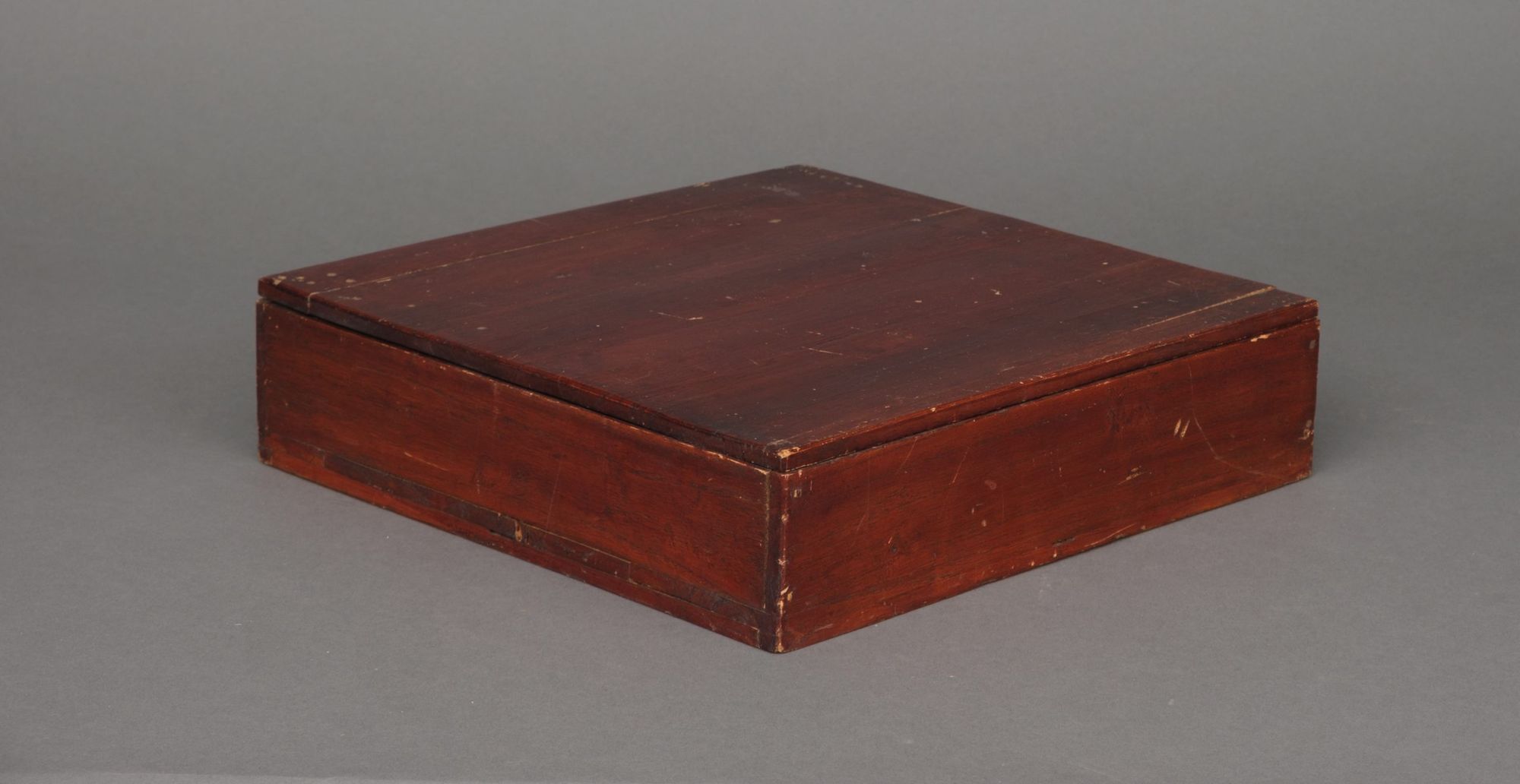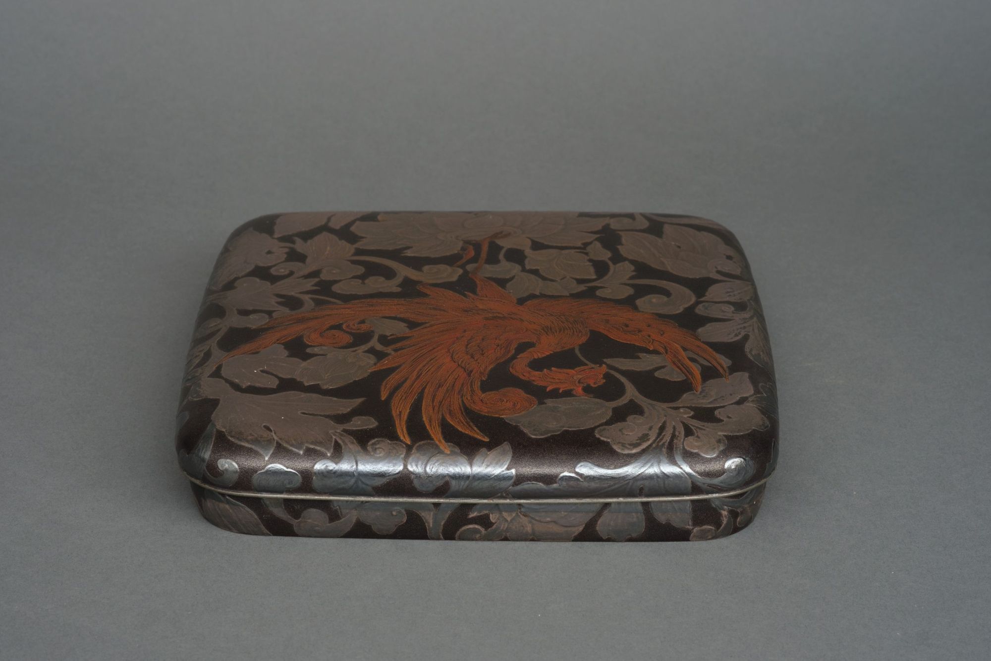 A captivating rectangular lacquer suzuri’bako 硯箱 (writing box) with a slightly arched, well-fitted overhanging cover and rounded corners.