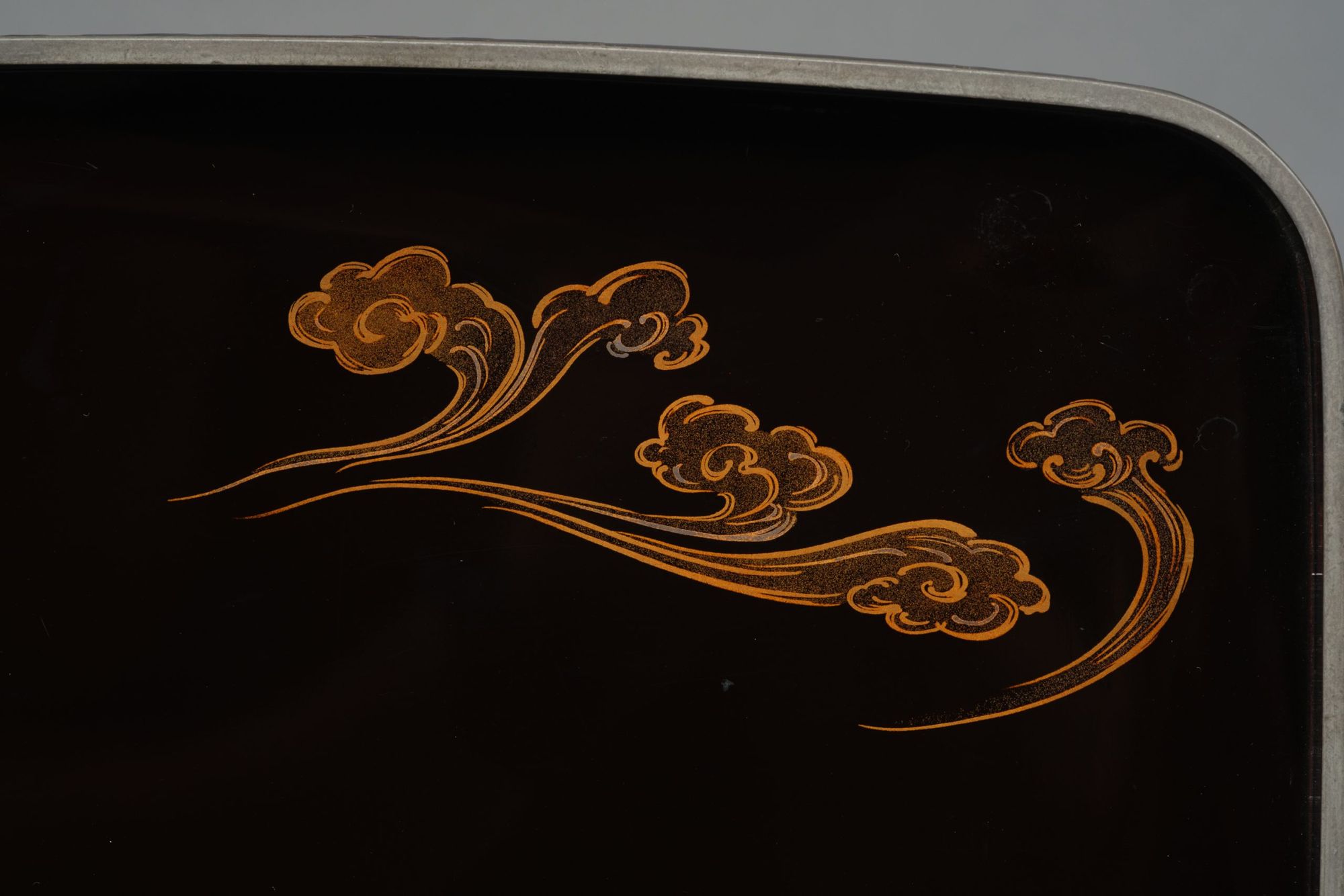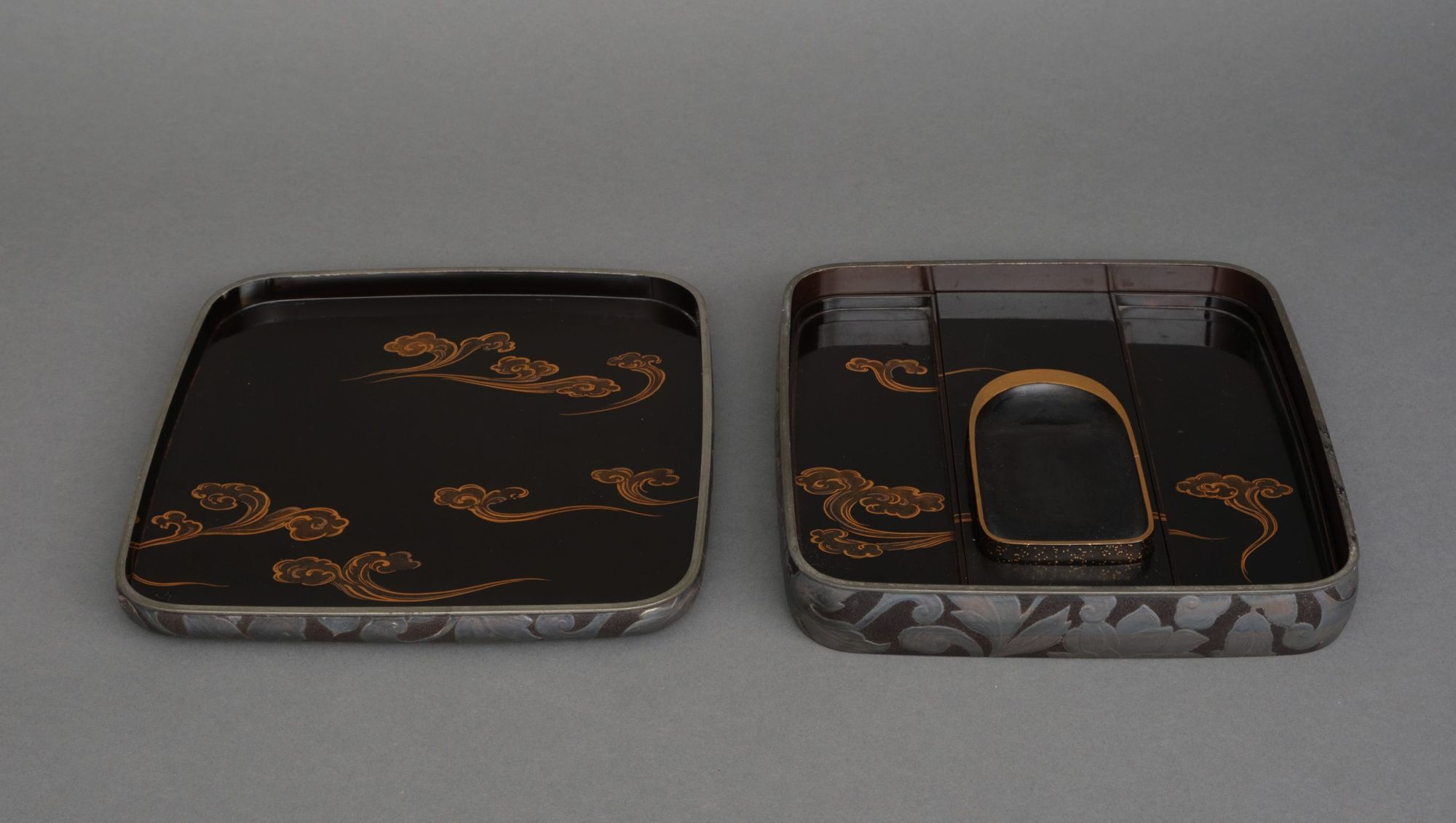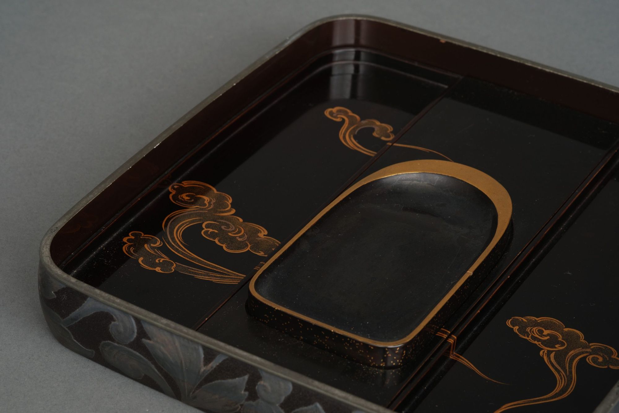 The interior features a scrolling cloud design done in golden and silver togidashi makie 研出蒔絵 (burnished lacquer design) and hiramaki-e 平蒔絵 (low-relief lacquer design) on a glossy black lacquer ground 蝋色漆 (rôiro’urushi).