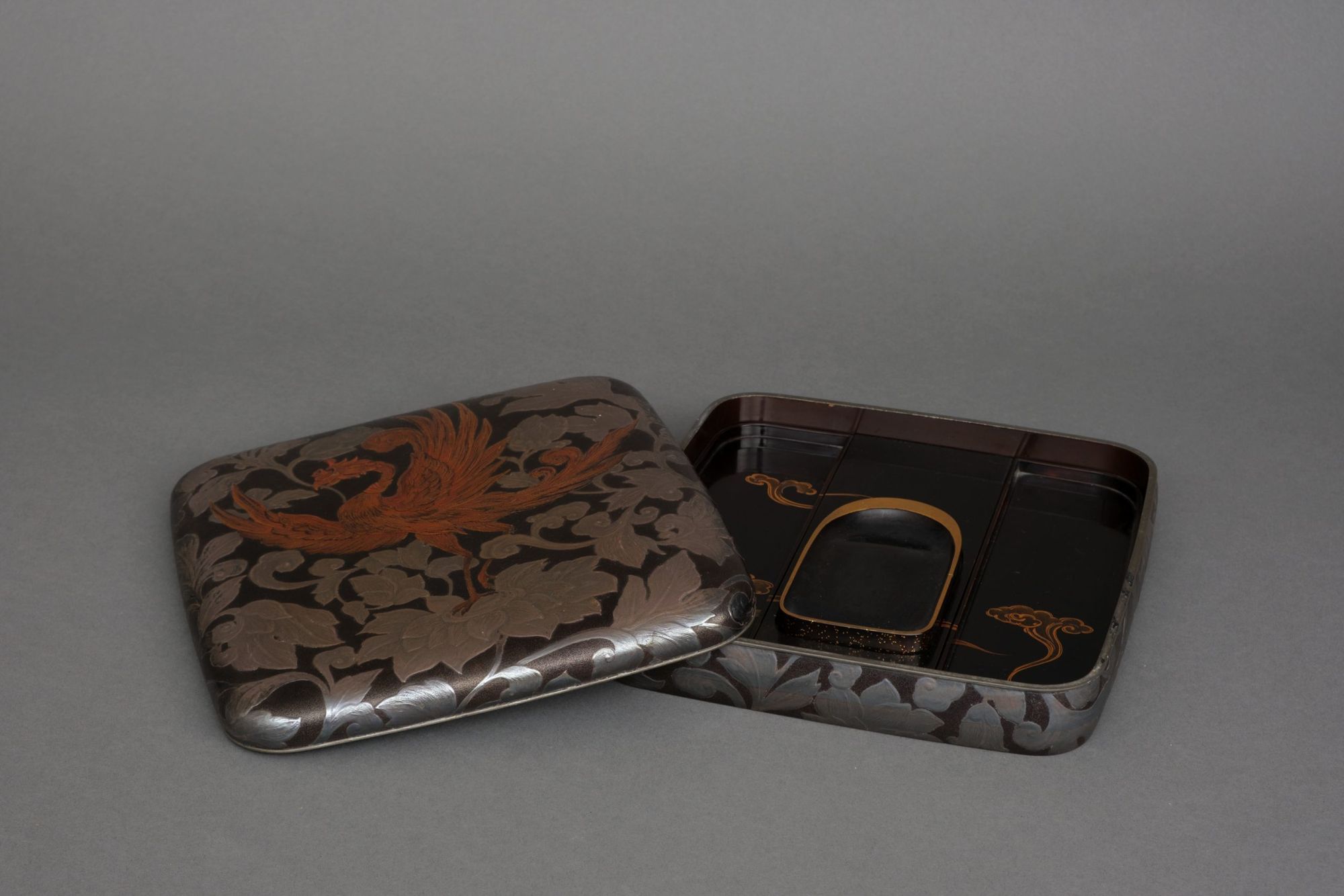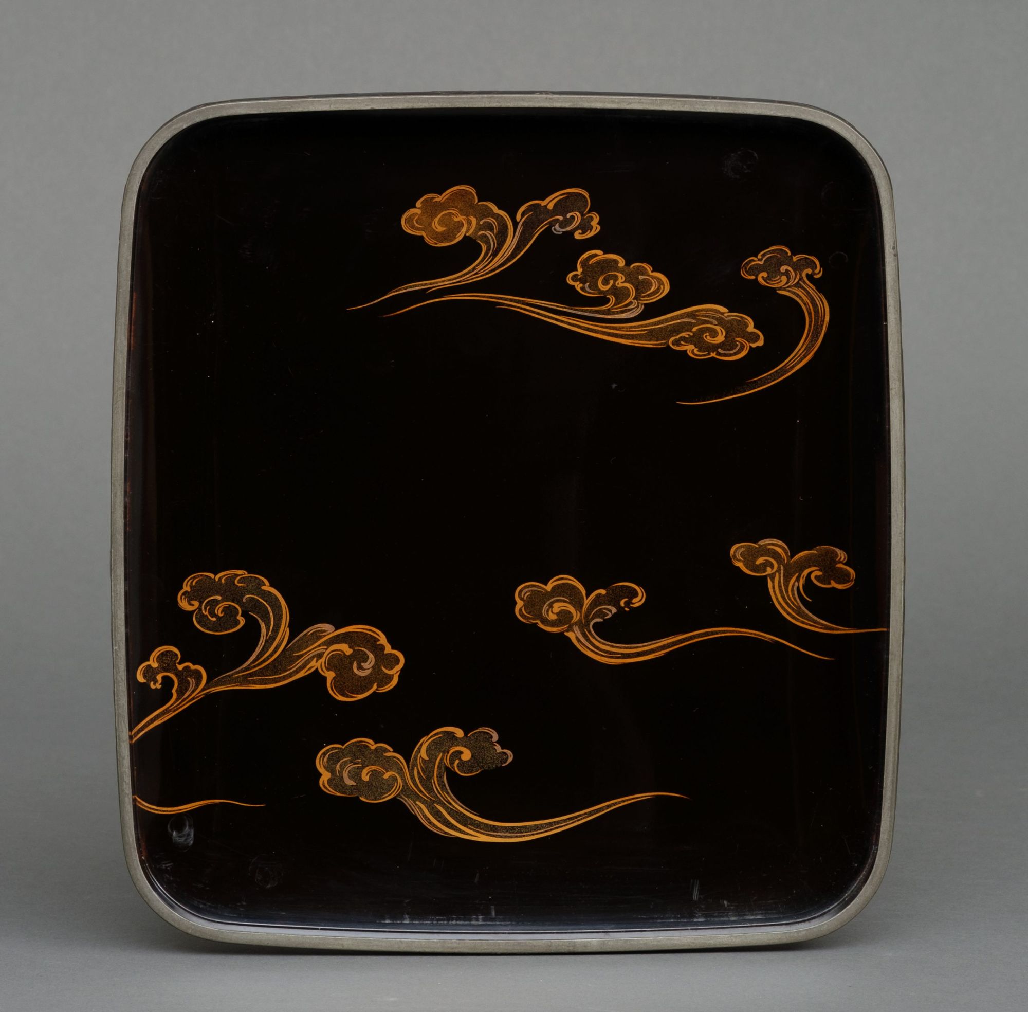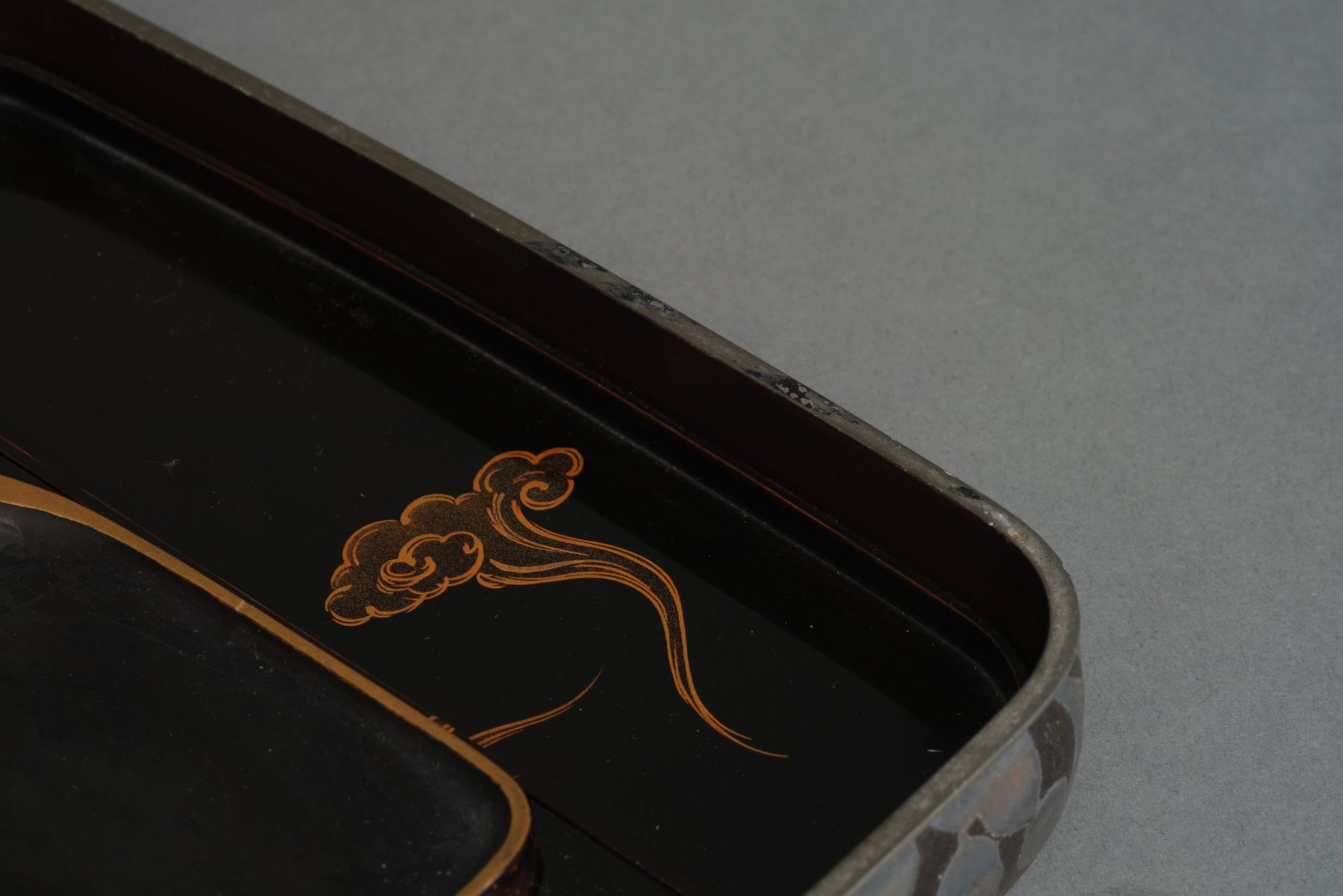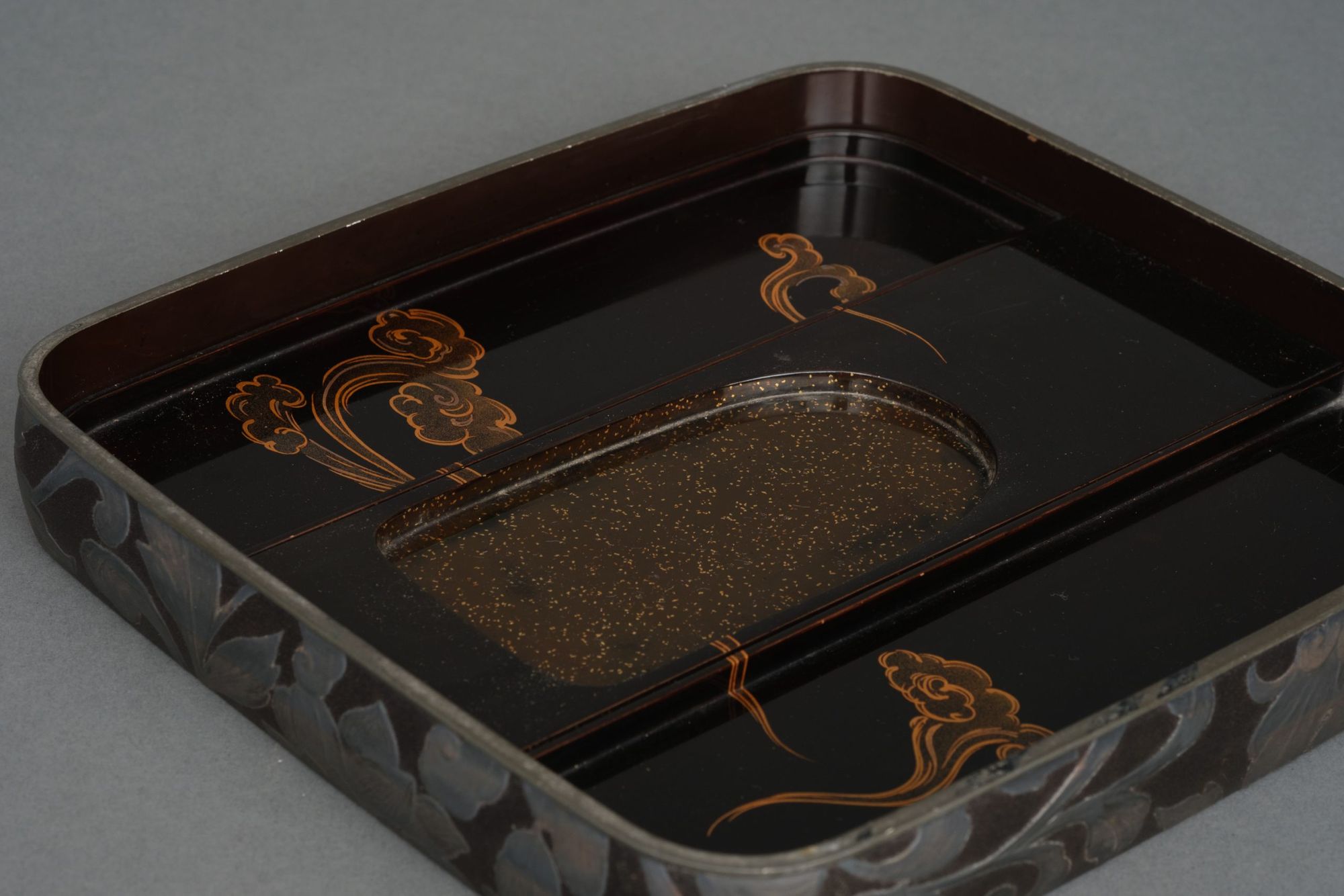 The interior features a scrolling cloud design done in golden and silver togidashi makie 研出蒔絵 (burnished lacquer design) and hiramaki-e 平蒔絵 (low-relief lacquer design) on a glossy black lacquer ground 蝋色漆 (rôiro’urushi).
